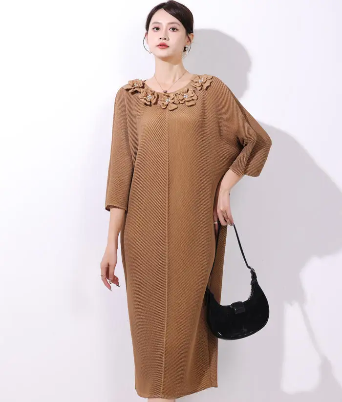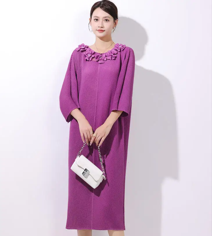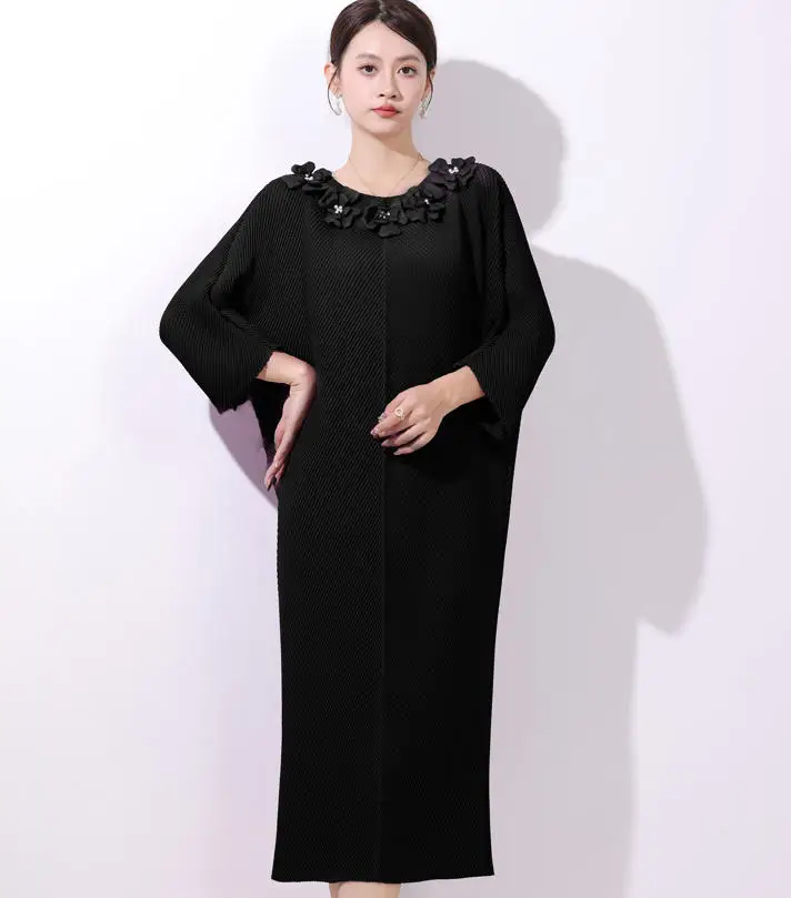 A Plus-size Dress for European and American Women with a Petal-shaped Neckline and Super Elastic Miyake Pleated Dress