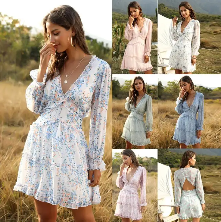 Women Boho Fashion Summer A-line V-neck Long Sleeves Casual Dress Floral Mini Bohemian Sexy Dress Ladies