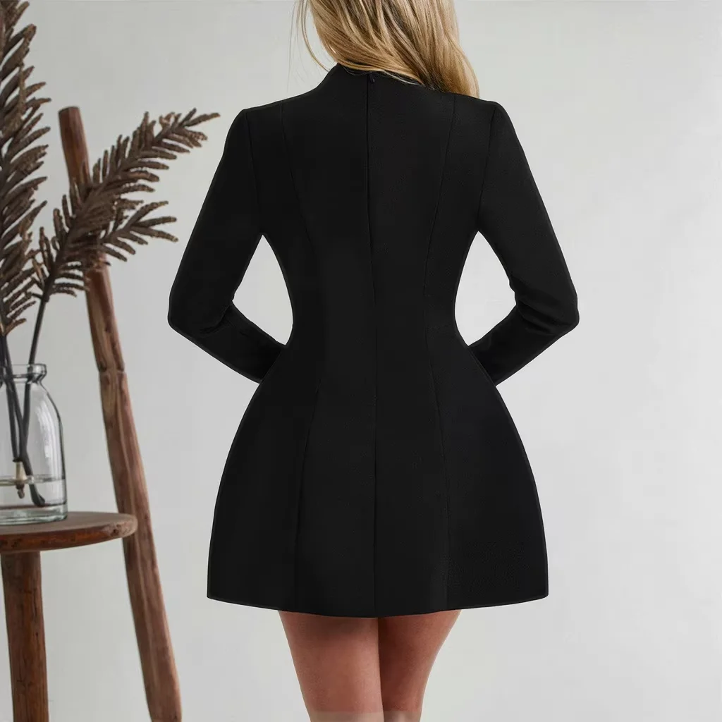 Wholesale Custom Clothing Manufacturers Fashion Elegant Luxury Lady Women Deep V Neck Black Short Mini A-Line Long Sleeve Dress