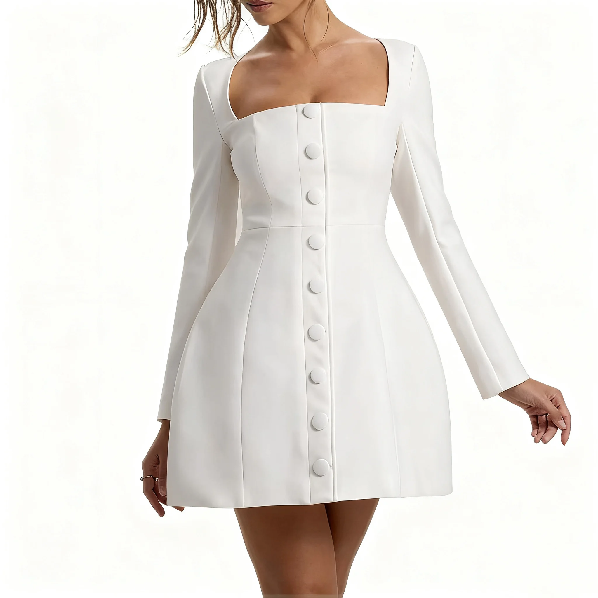 Wholesale Custom Clothing Manufacturers Womens Summer Lady Square Neck a Line Long Sleeve White Mini Party Dress for Women