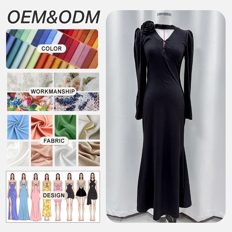 Online Wholesale Supplier Factory Fashion 3D Flower V-neck Long Sleeved Elegant Sweater Solid Color Casual Long Maxi Dress Women