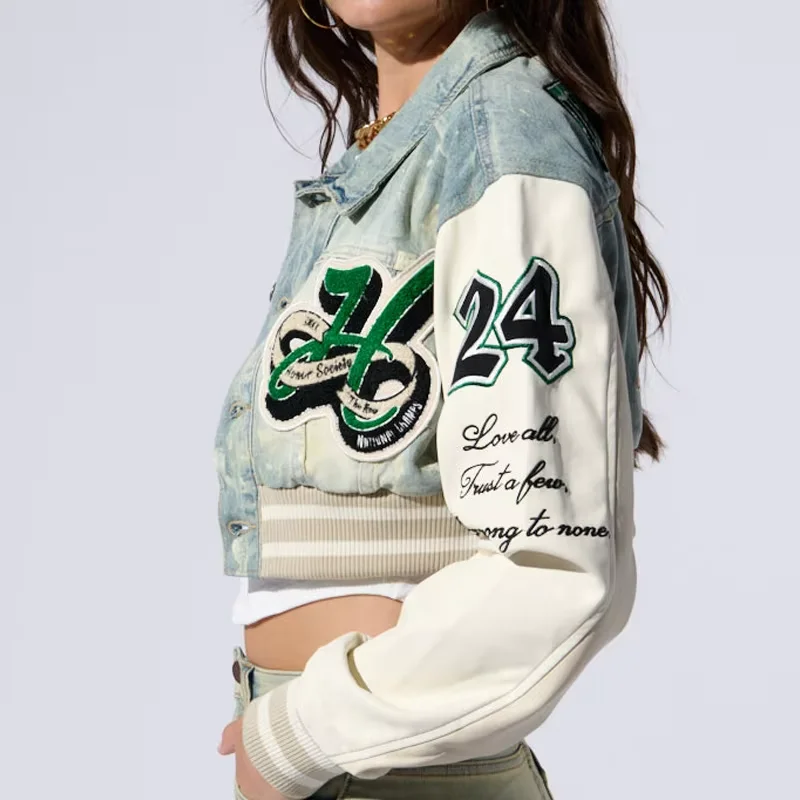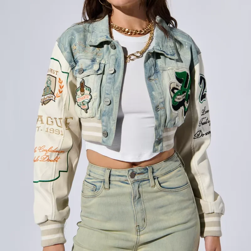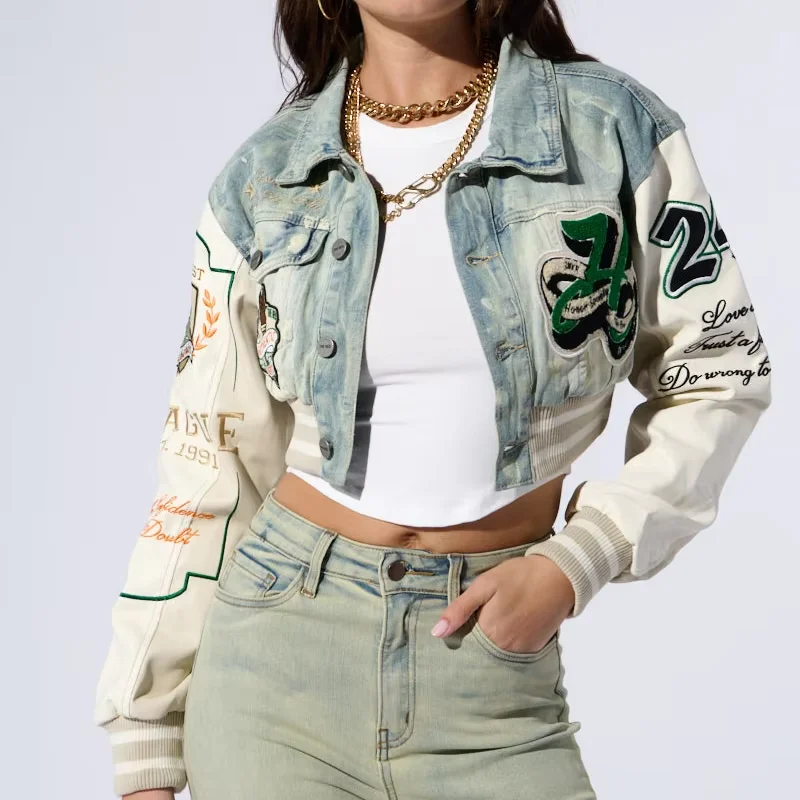 Custom Fashion High Quality Genuine Leather Sleeves Chenille Embroidery Cropped Denim Varsity Jacket for Women