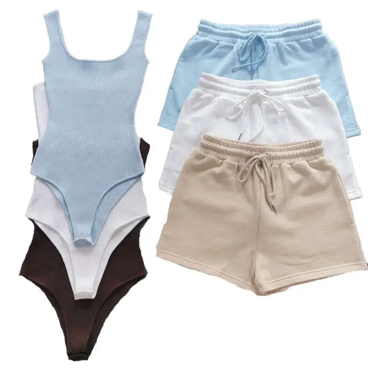 OEM Women Shorts Sets Summer Square Neck Sports Vest Short Drawstring Jogger Pants Bodysuit Cotton Set Womens 2 Piece Jogger Set