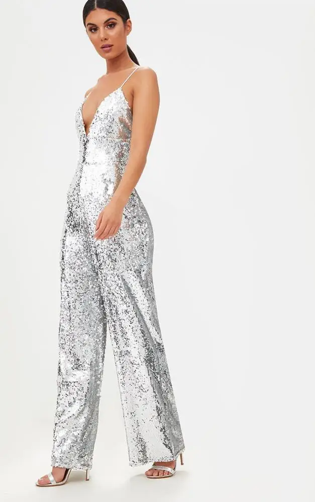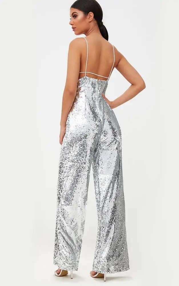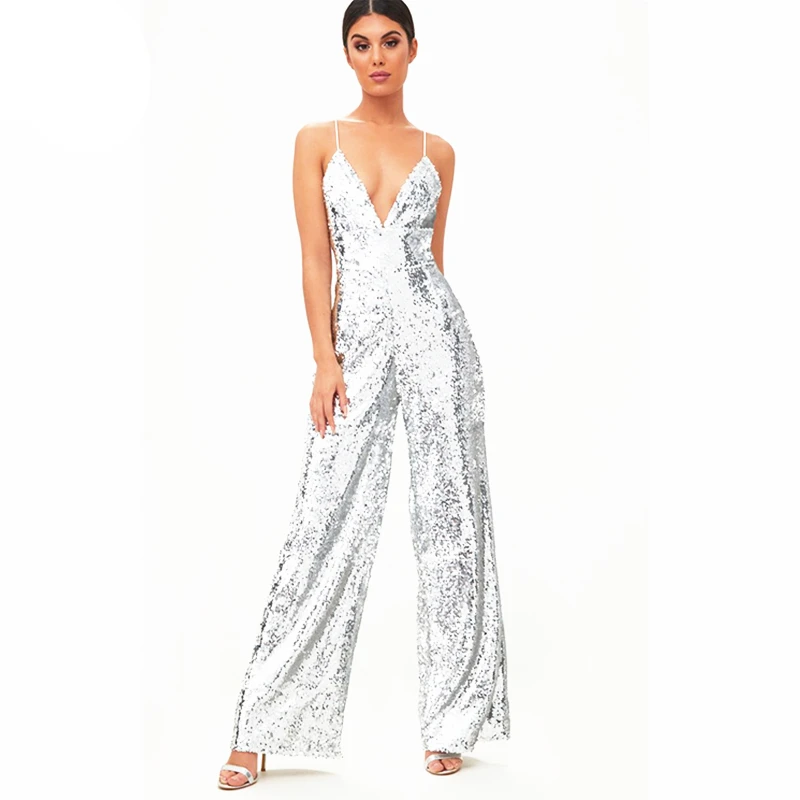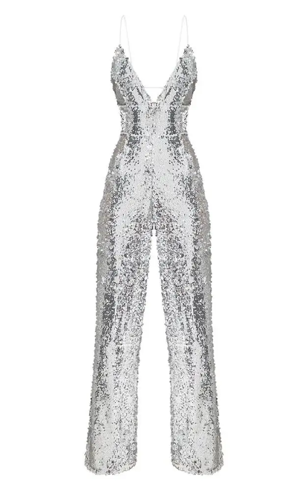 Fashion Sleeveless Sexy Deep V Neck Elegant Fitness Women Silver Sequin Jumpsuit