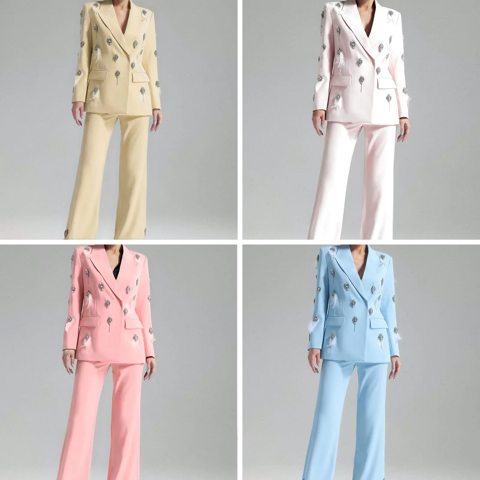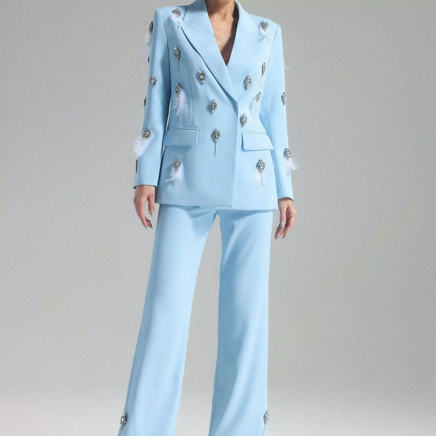 Clothing Manufacturers Women Outfits Blazers Long Sleeves Light Decorative Feather Diamond Two Piece Set Loose Pants Solid Color