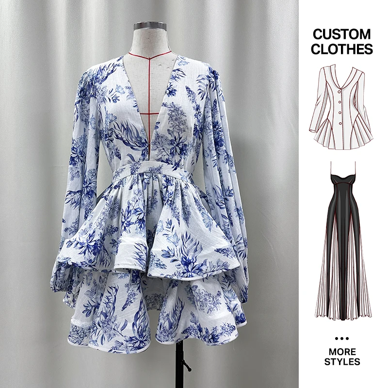 Custom New Design Women Summer Cross-border Elegant Beach Fashionable V-neck Long Sleeve Printed Lotus Leaf Edge Short Dress
