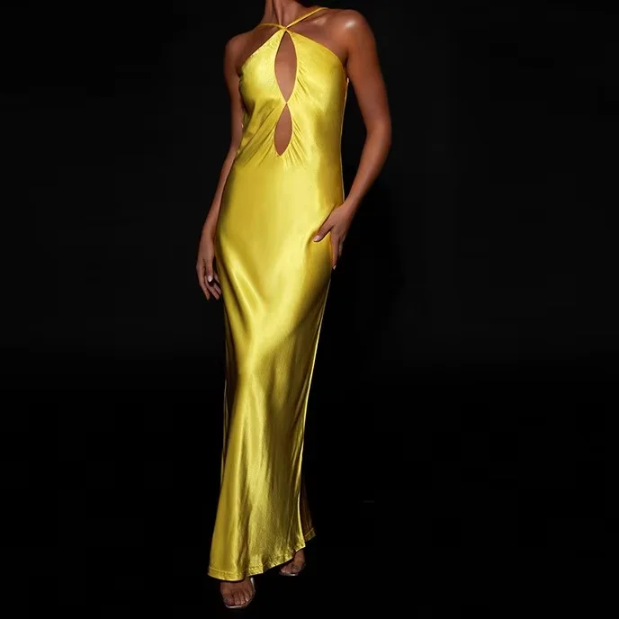 Custom Clothing Manufacturers Summer Fashion Strap High Waist Satin Sleeveless Backless Ladies Maxi Dresses Sexy Dress for Women