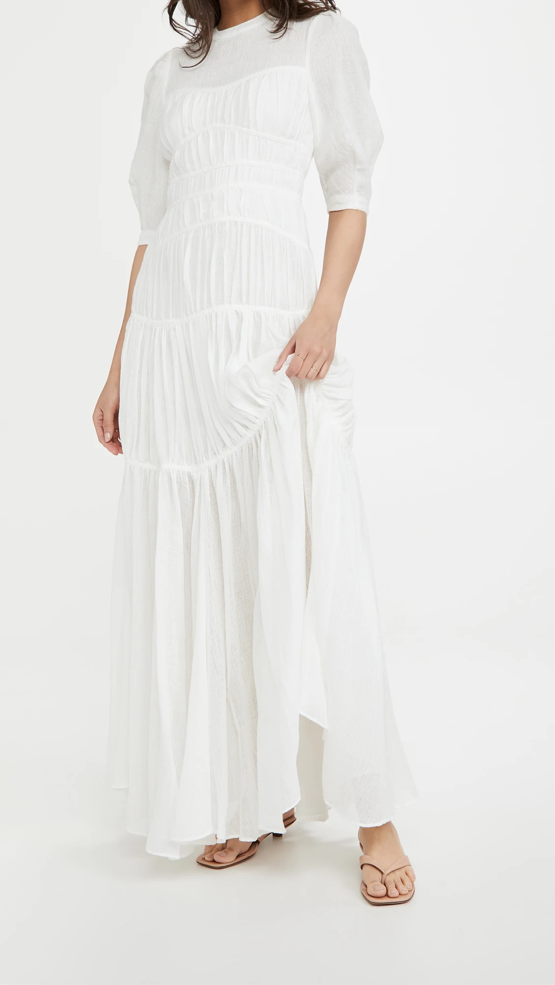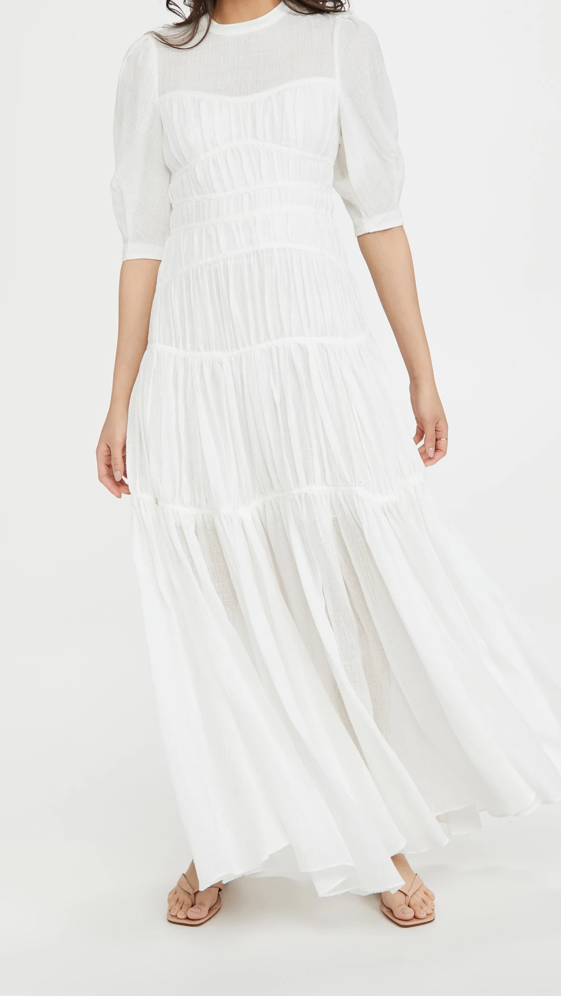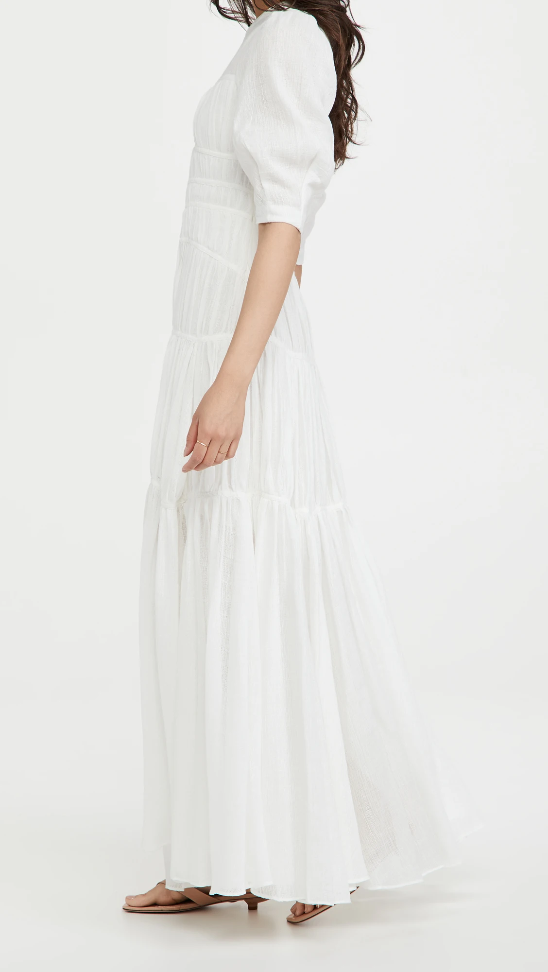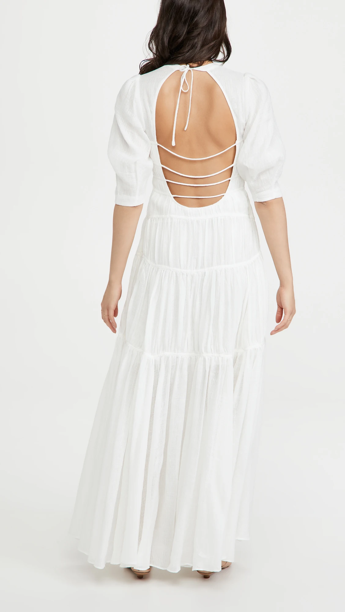 Casual Stylish Open Ties Back Half Puff Sleeves Tiered Long Maxi Linen Ladies White Dress Vestido