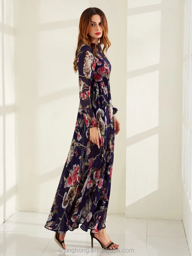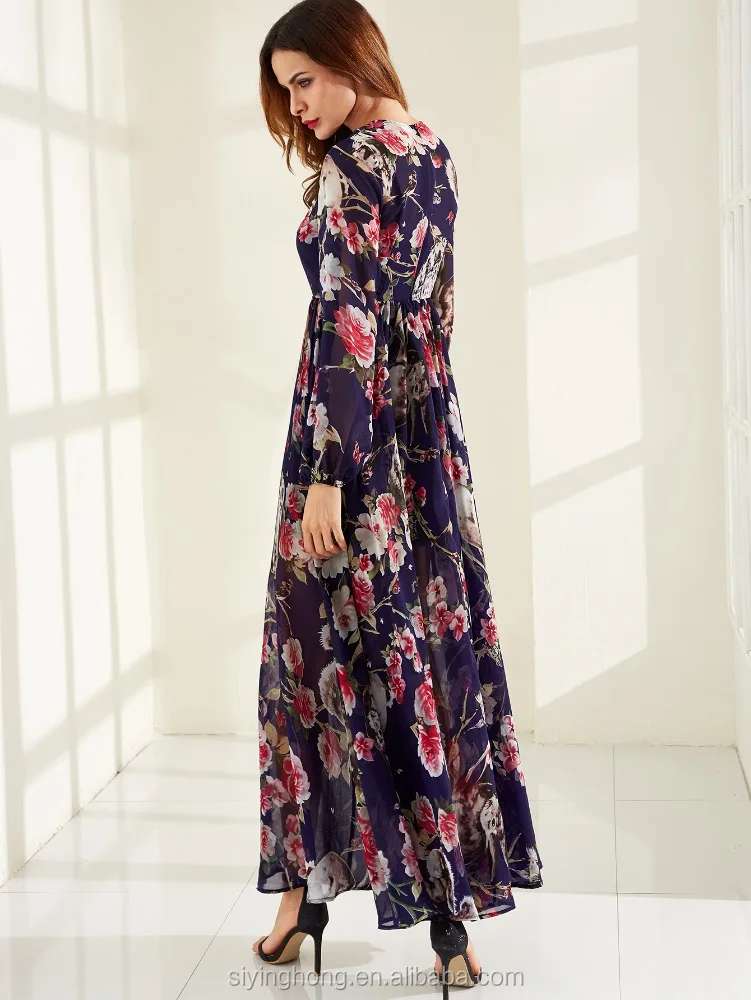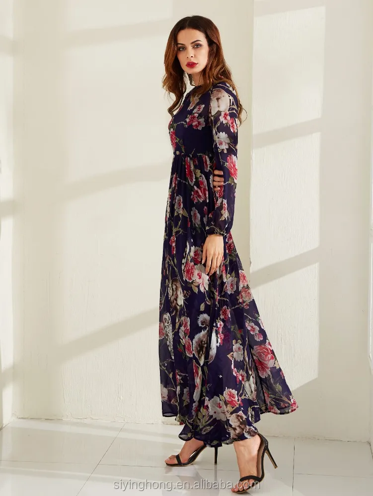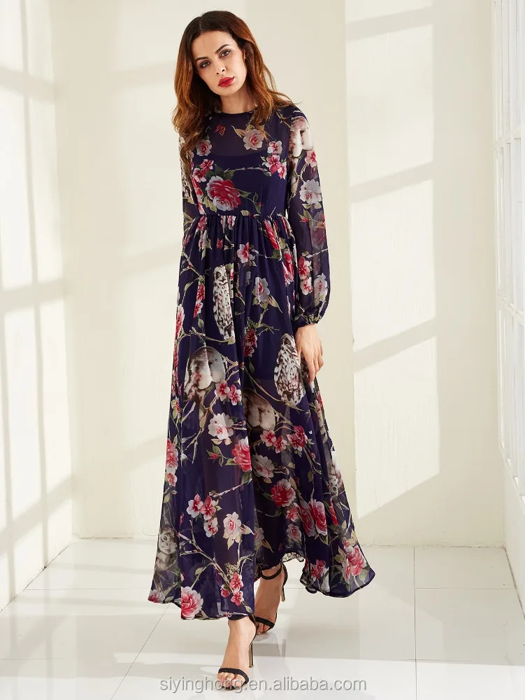 Plus Size OEM Latest Design Oversize Printed Flower Long Sleeve Chiffon Kaftan Abaya Women Evening Dress