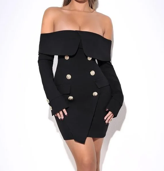 Black Slim blazer Mini Dress off Shoulder Long Sleeve Dress Double-breaste Classic Ladies blazer Dress