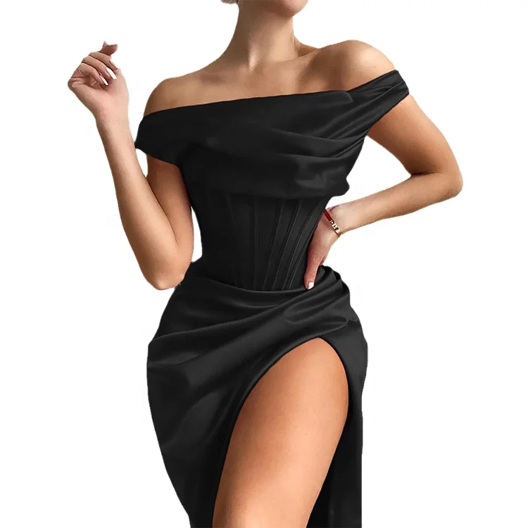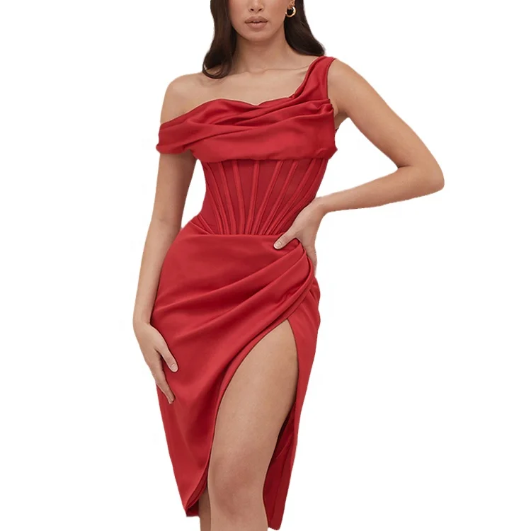 Custom Elegant Drape Streetwear Off Shoulder Corset Design Knee-Length Satin Women Bodycon Dresses