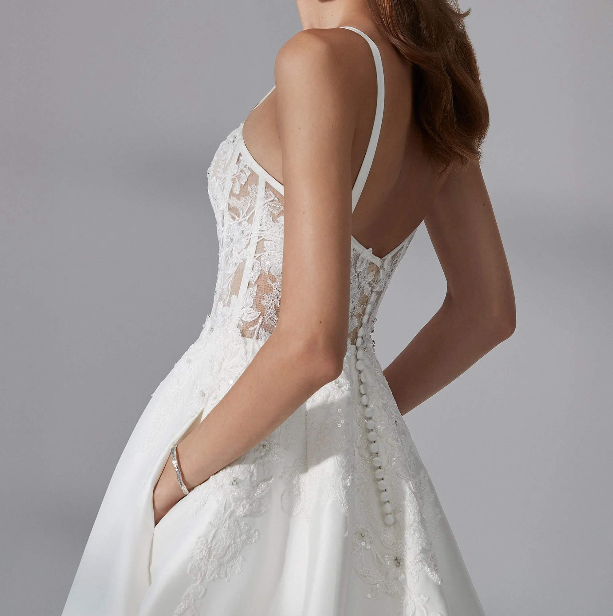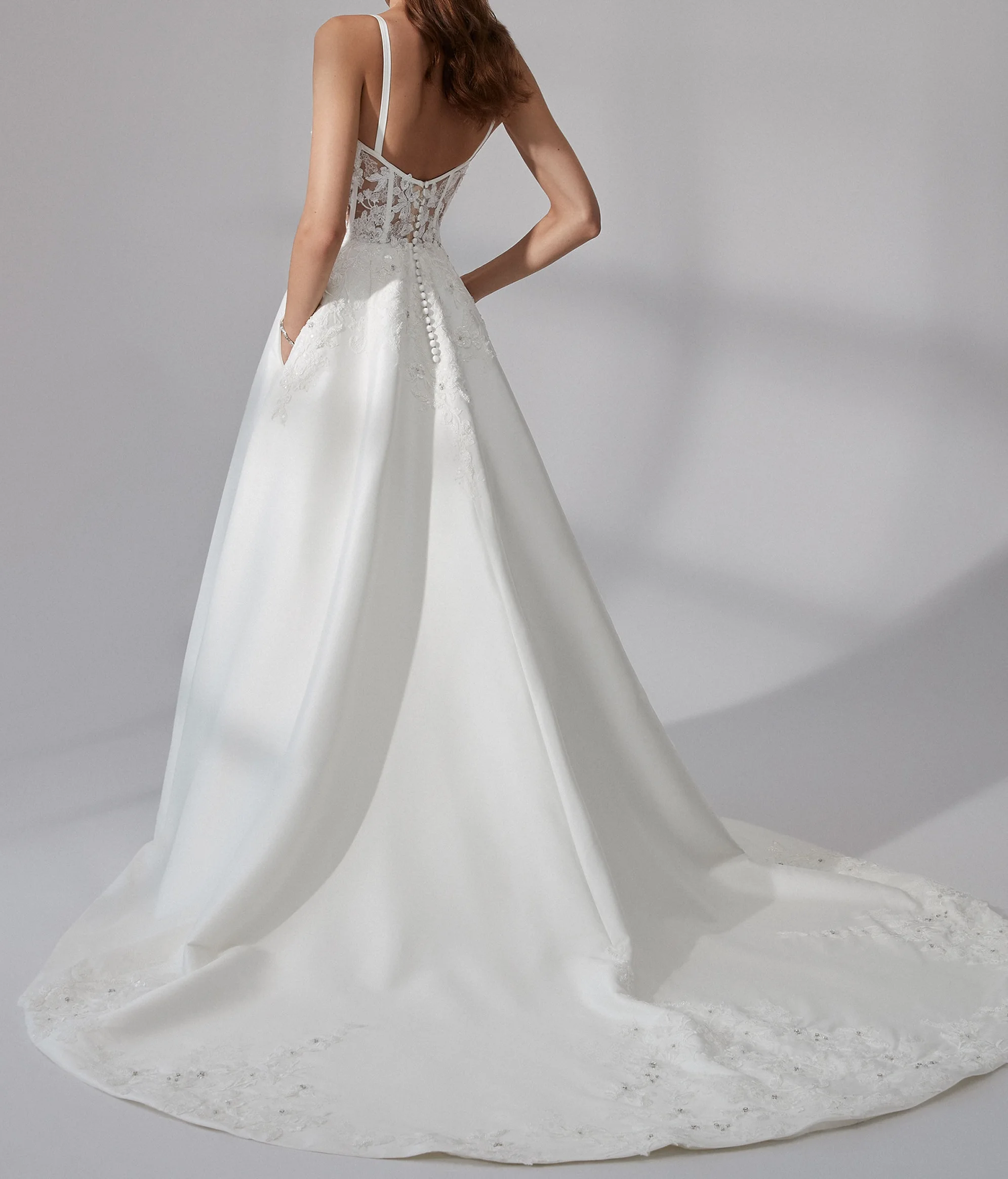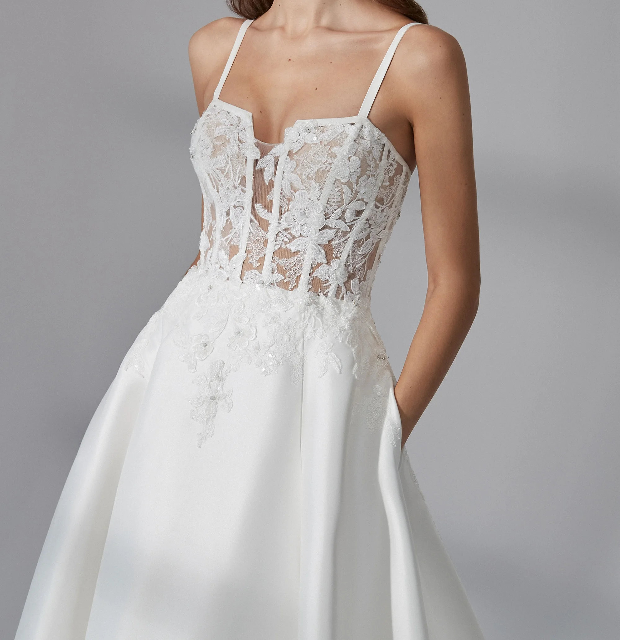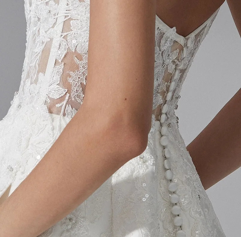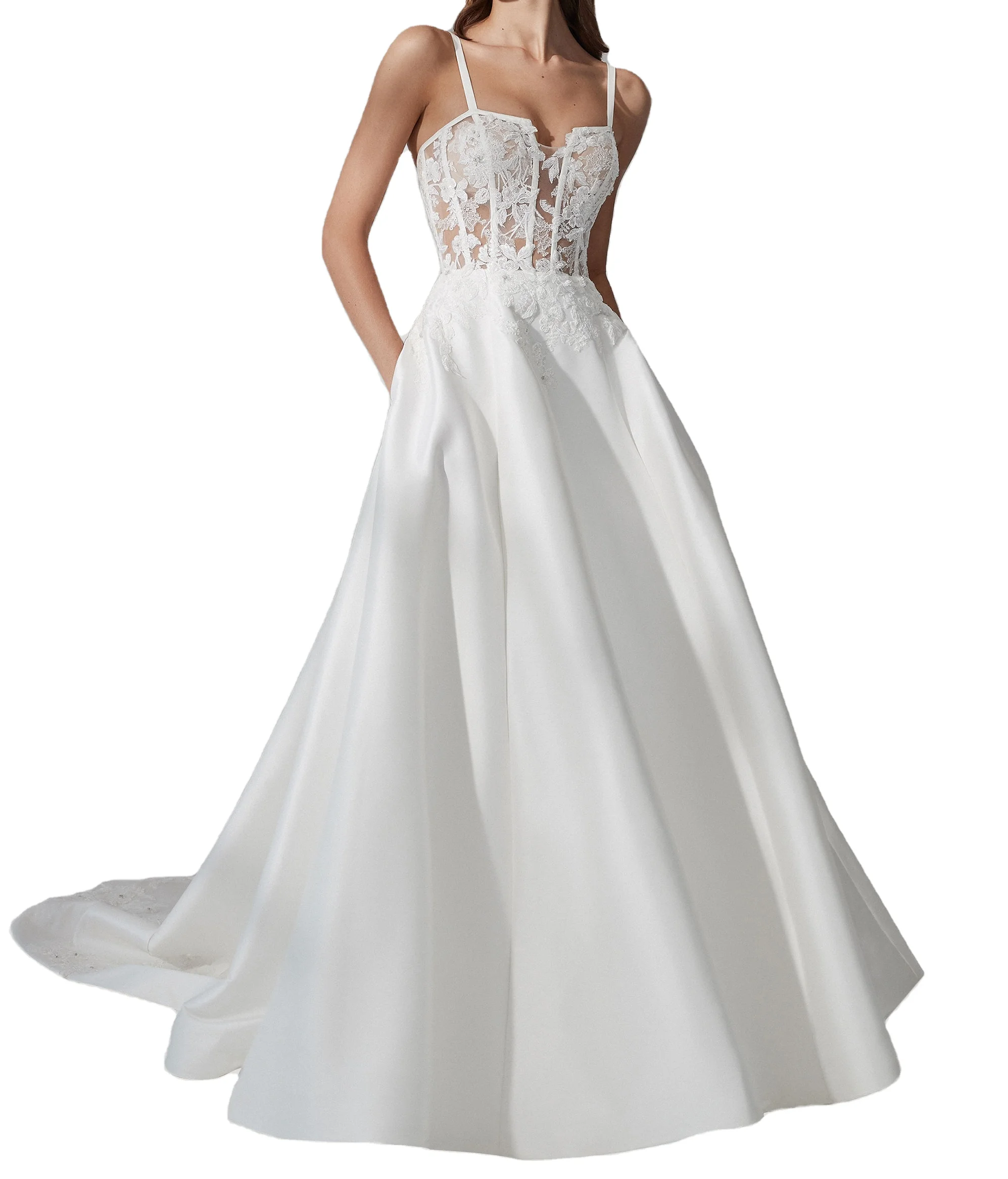Sexy White Lace Appliques Strech Mikado a Line Gown With Notched Square Neckline Evening Gowns Sleeveless Ladies Wedding Dresses