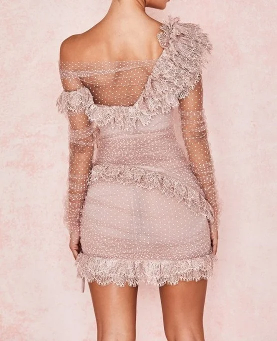 Sweet Girls Blush Lace Frill Mini Dress One Shoulder Low Chest Polka Dot Lace Short Dress Bodycon Party Dress