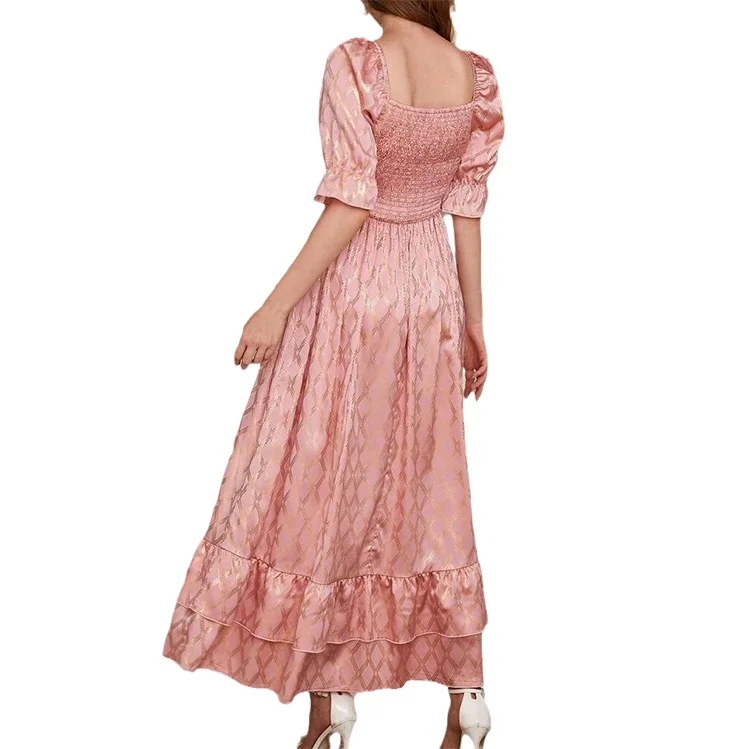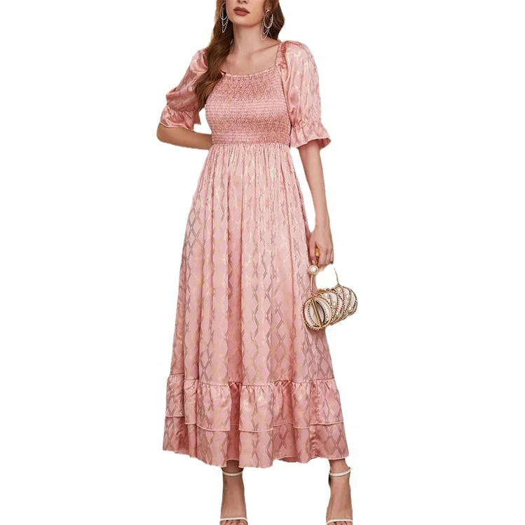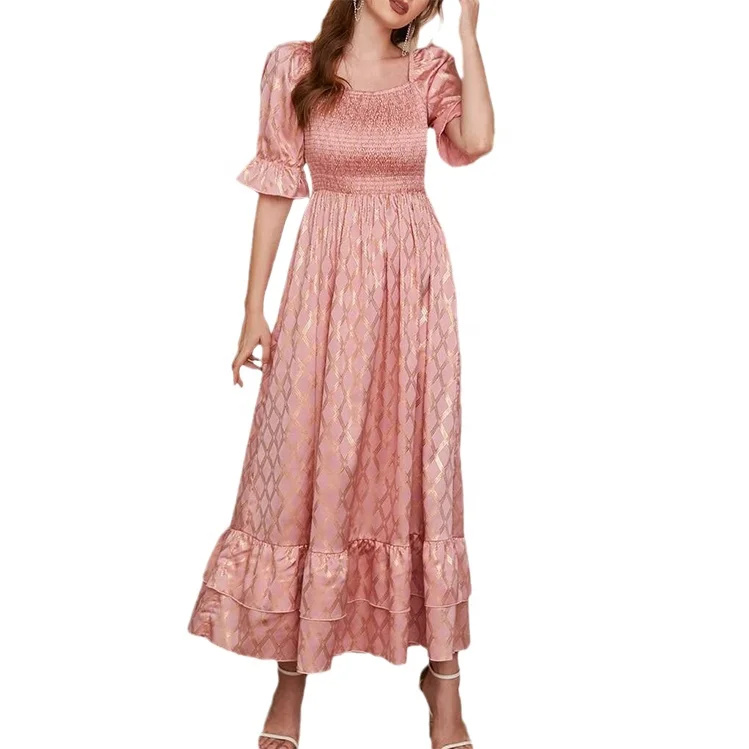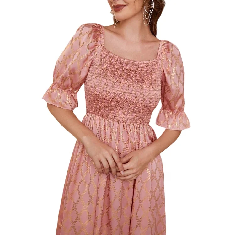 Custom Latest Designer Fashion Female Vintage Elegant Casual Summer Trendy Lady Women pink Ruffle Puff Sleeve Midi Dress 2026
