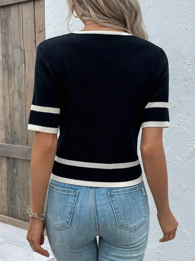 Women's New Spring Summer V-Neck Pullover Sweater Korean Style Knitted Top with Front Logo Contrast Color