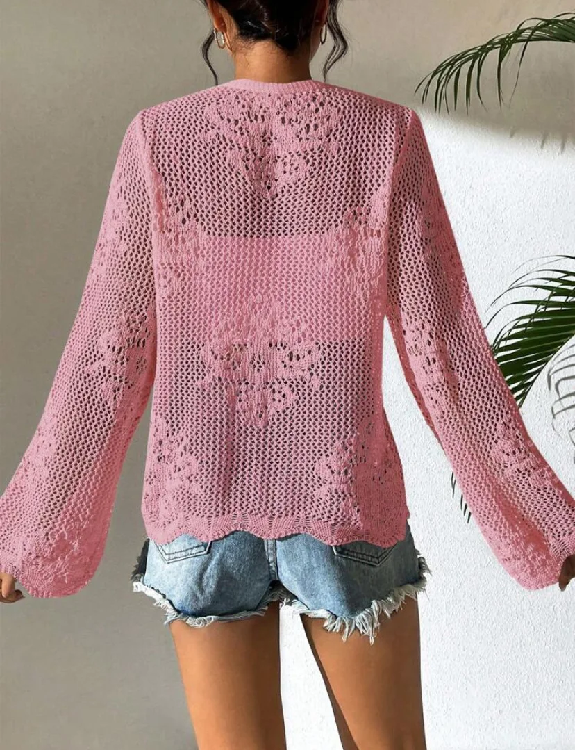 Women's Casual Summer V-Neck Cardigan Thin Hollow-Out Beach Knitted Sweater Geometric Pattern Short Back for American Europeans