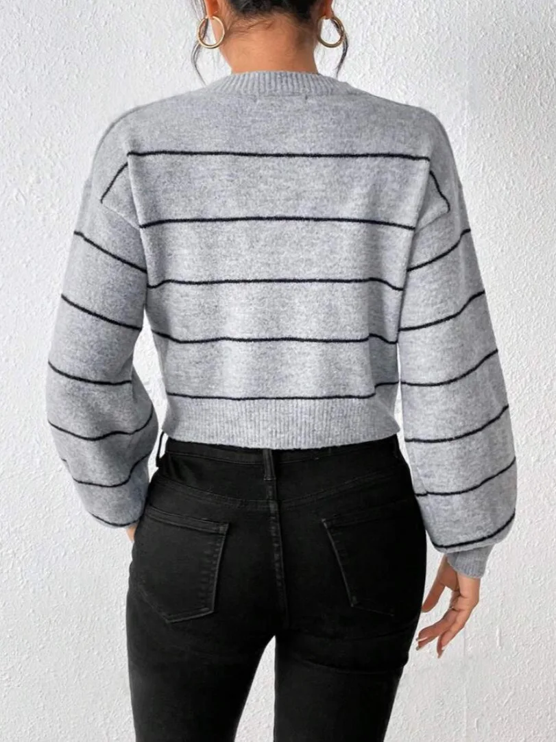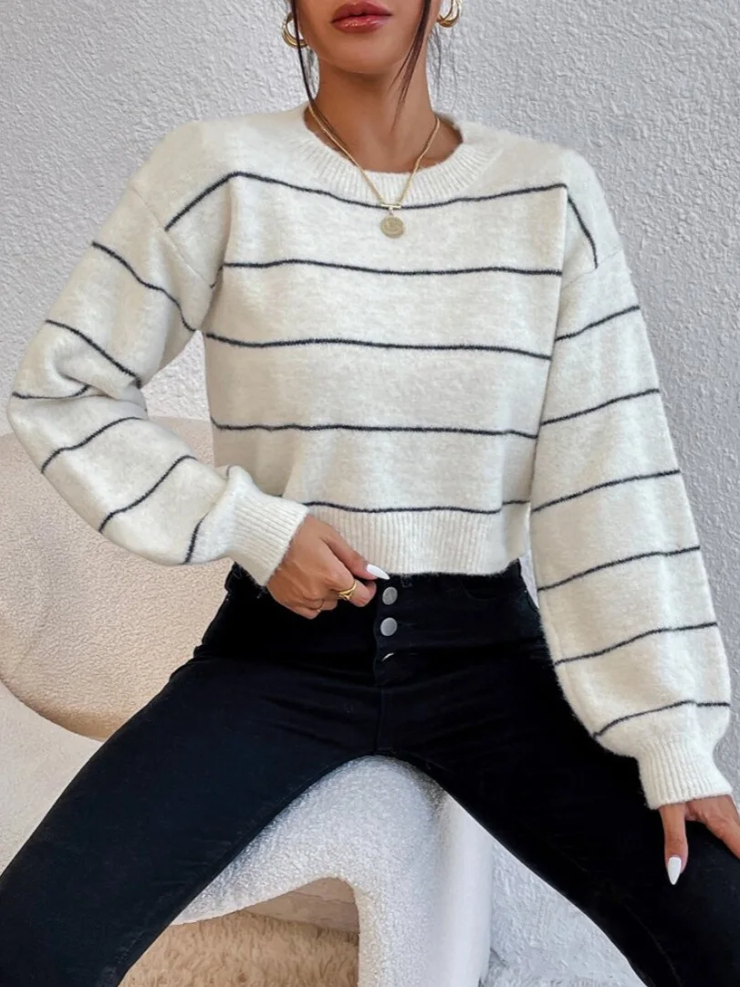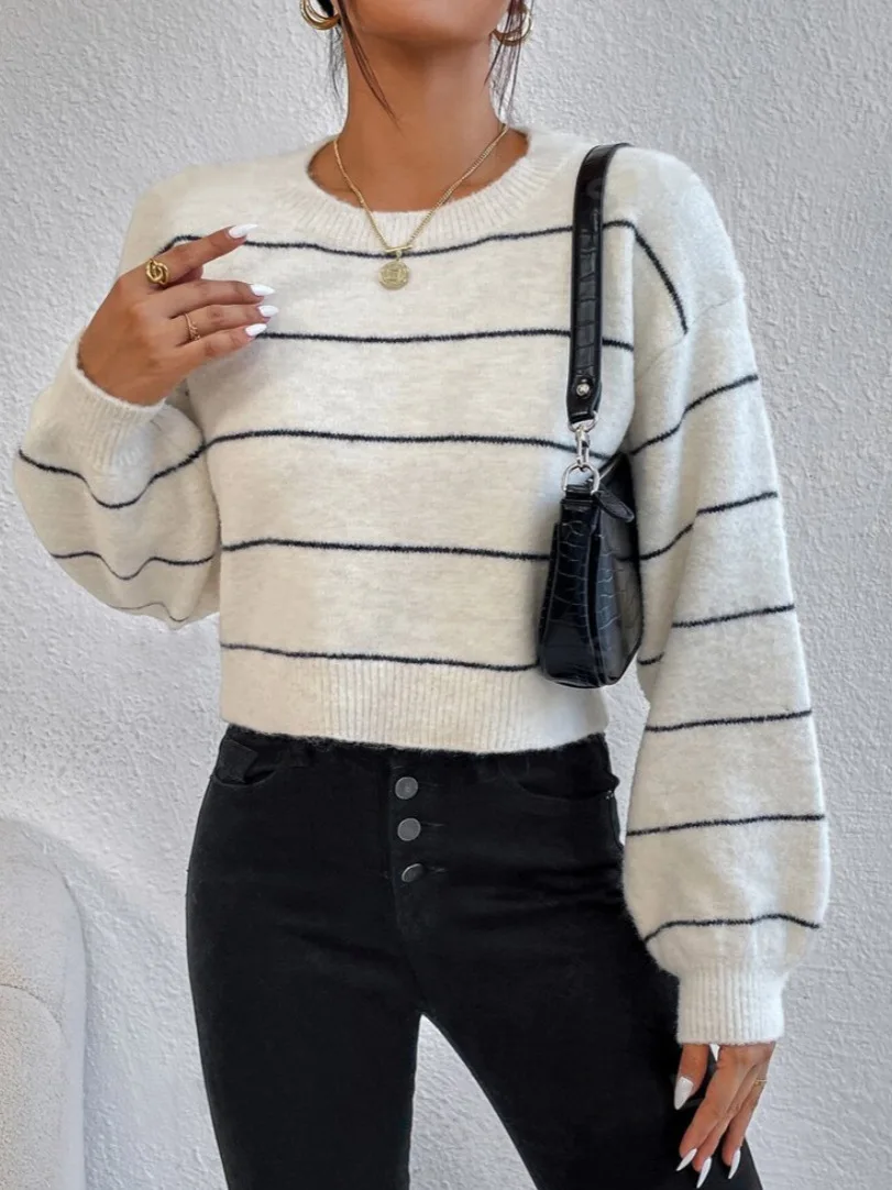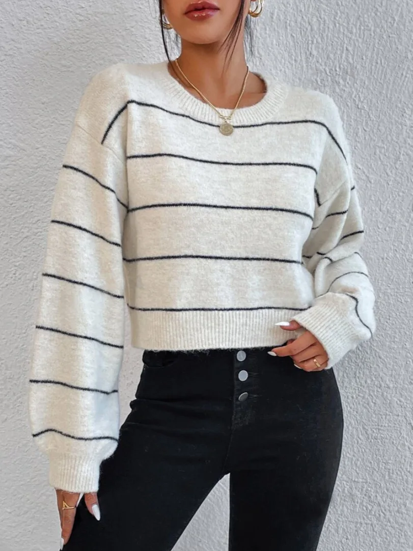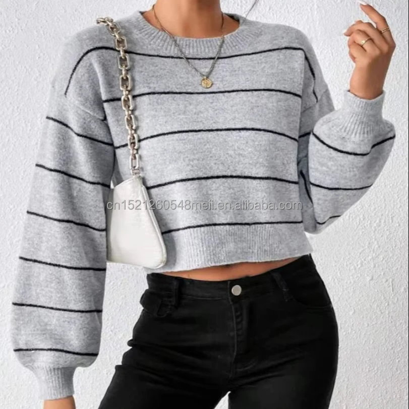 European American Women's Casual Short-Length Autumn Pullover Sweater Knitted Long Sleeve with Loose Fit Stripe Design
