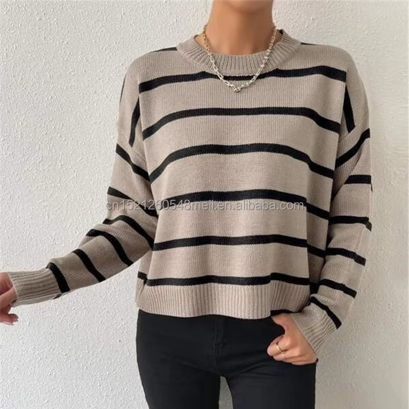 2024 Autumn Winter Women's round Neck Striped Knitted Pullover European American Style Casual Short Length