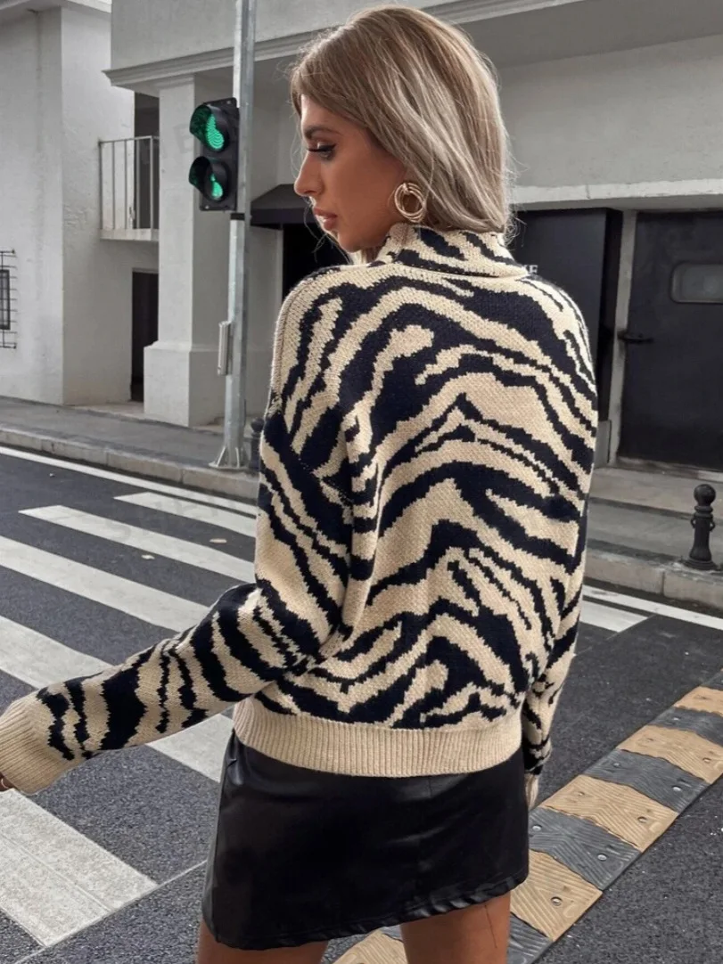 European American Women's Elegant Leopard Print Crewneck Pullover Brown Knitted Long-Sleeve Sweater Casual Hot Sale for Autumn