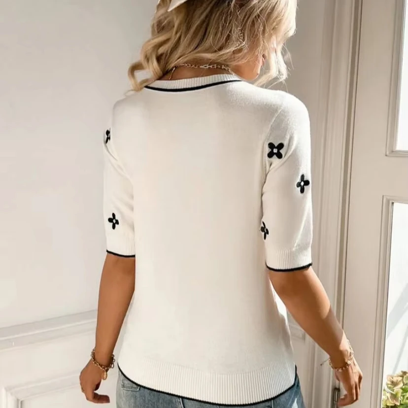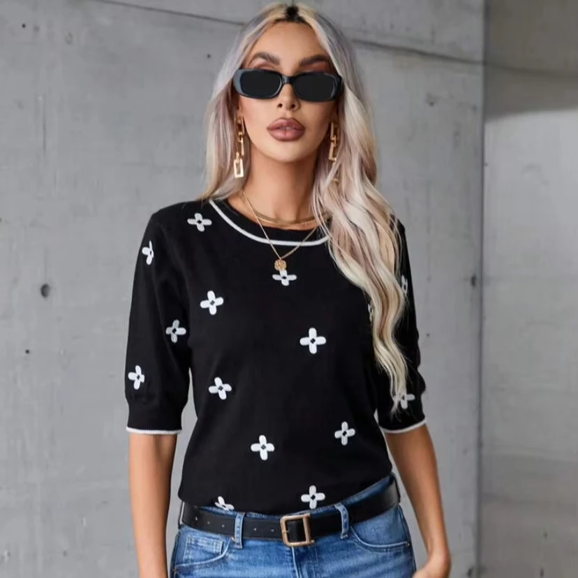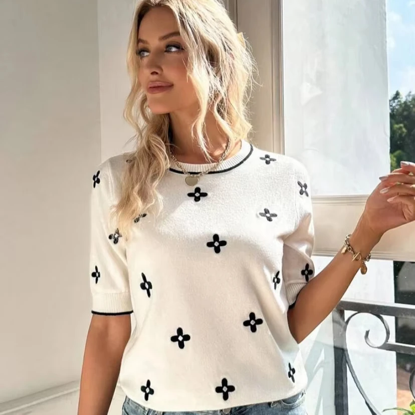 2025 Spring Summer Casual O-Neck Short Sleeve Sweater with Spaghetti Strap New Flower Pattern Natural Waistline Front Logo