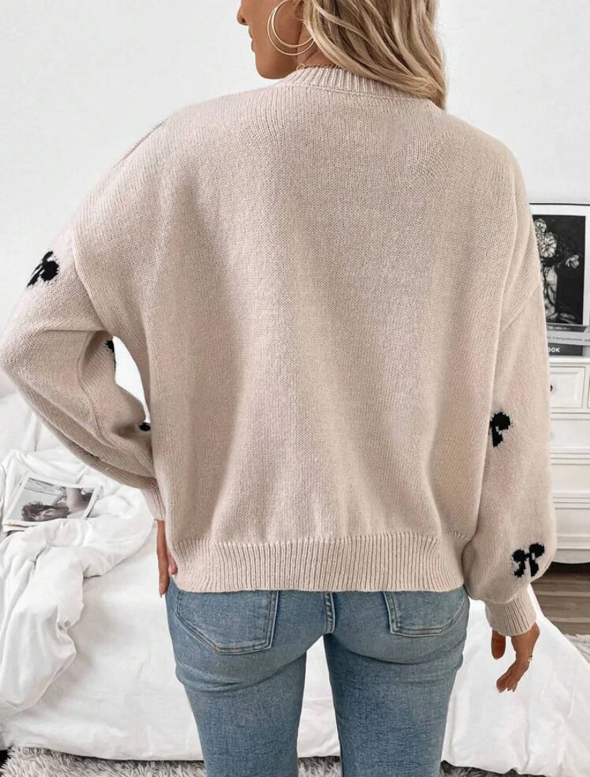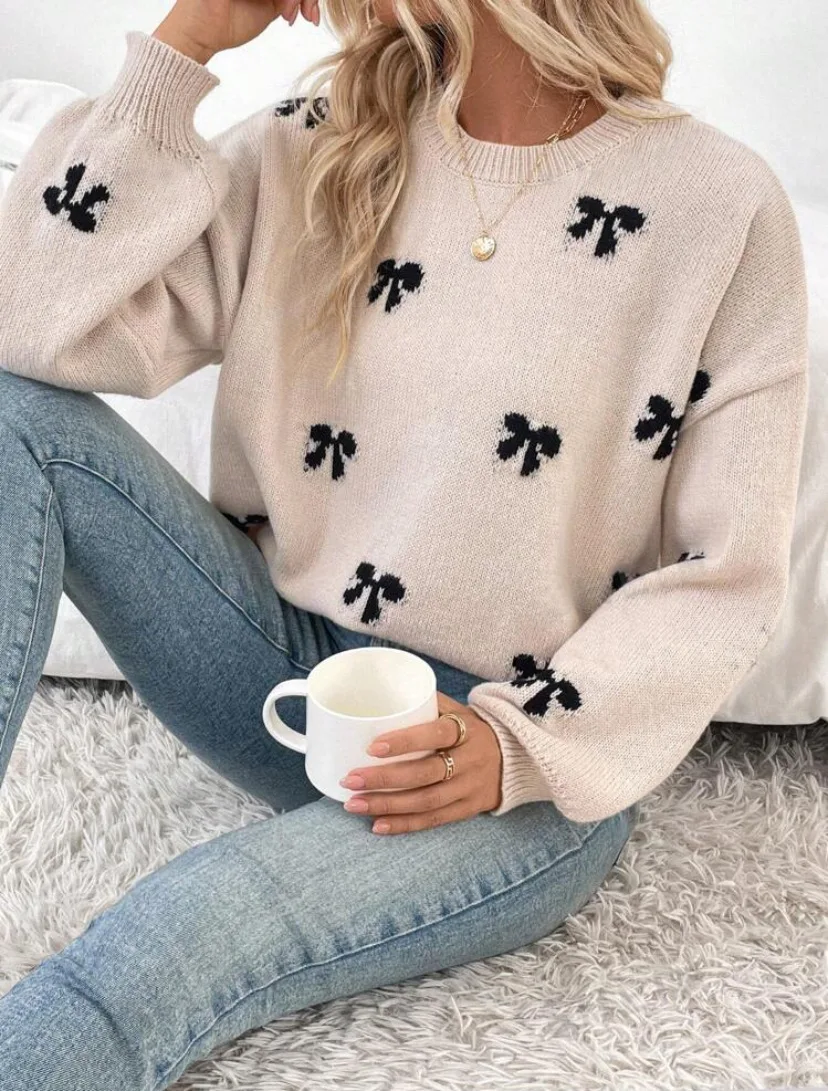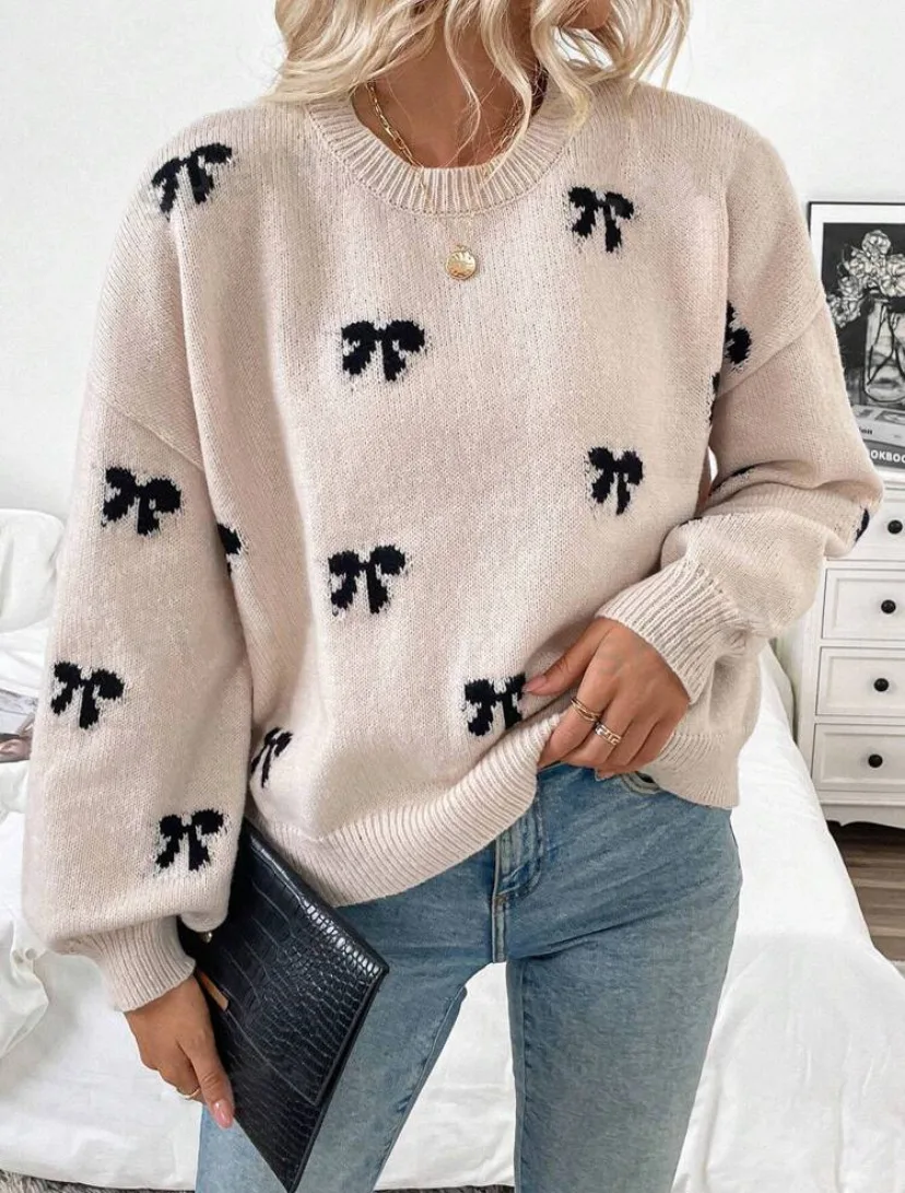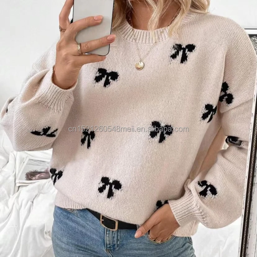 European American Women's Casual Autumn Sweater with Simple Design Bow Jacquard Front Logo Independent Station for Foreign Trade