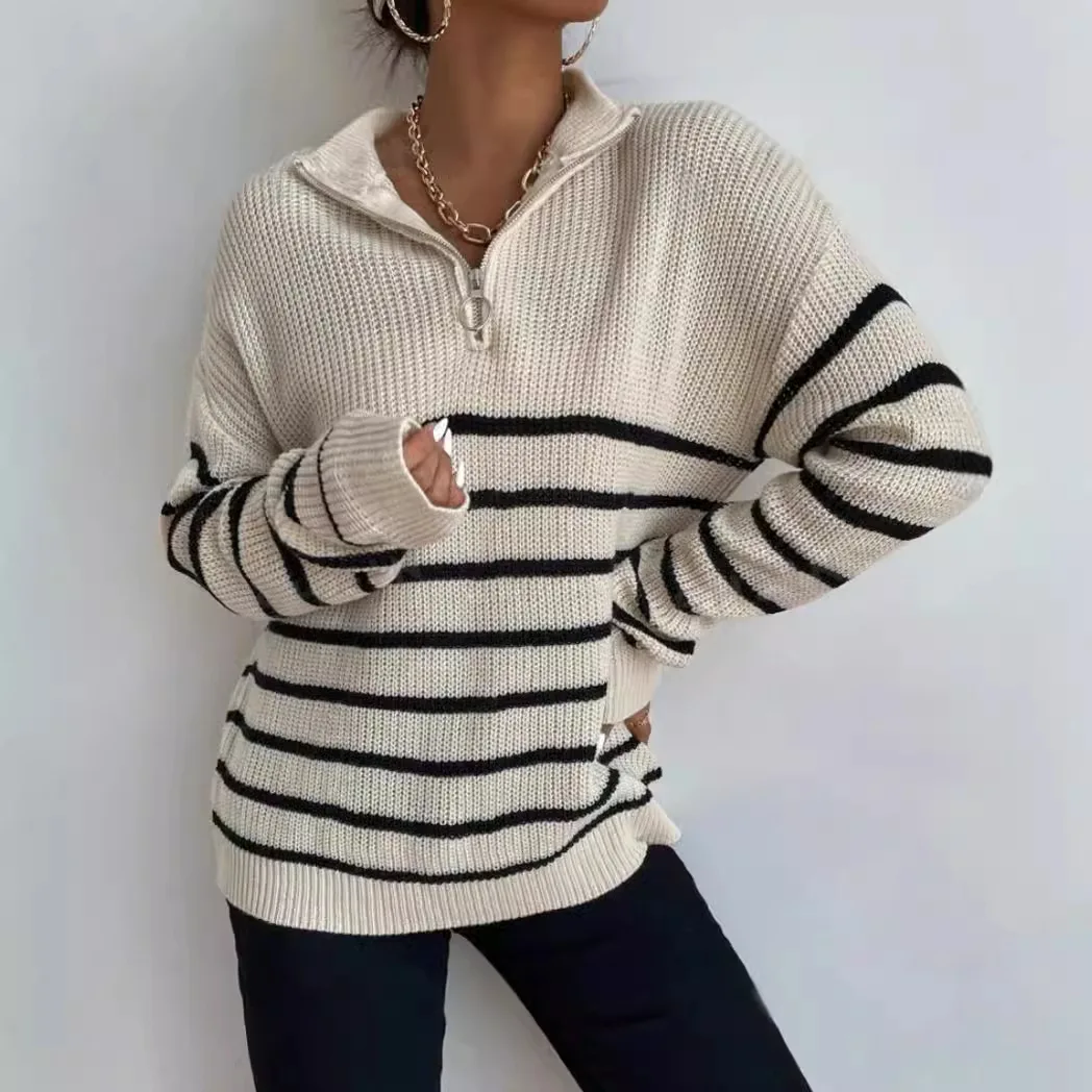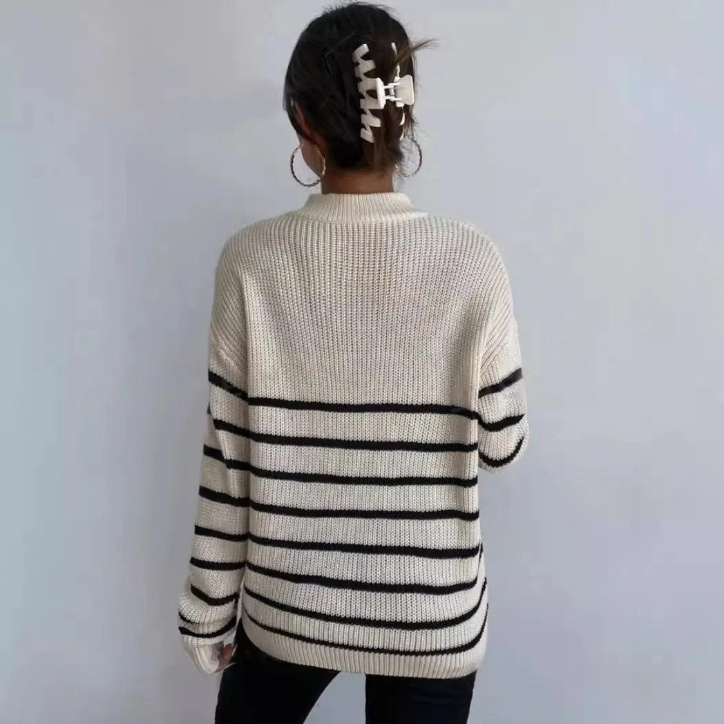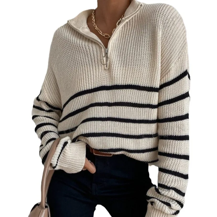 Wholesale Custom Size Women's Fashion Half-Zip Striped Long Sleeve Pullover Rib Casual Style Winter Knitted Loose Top Front Logo