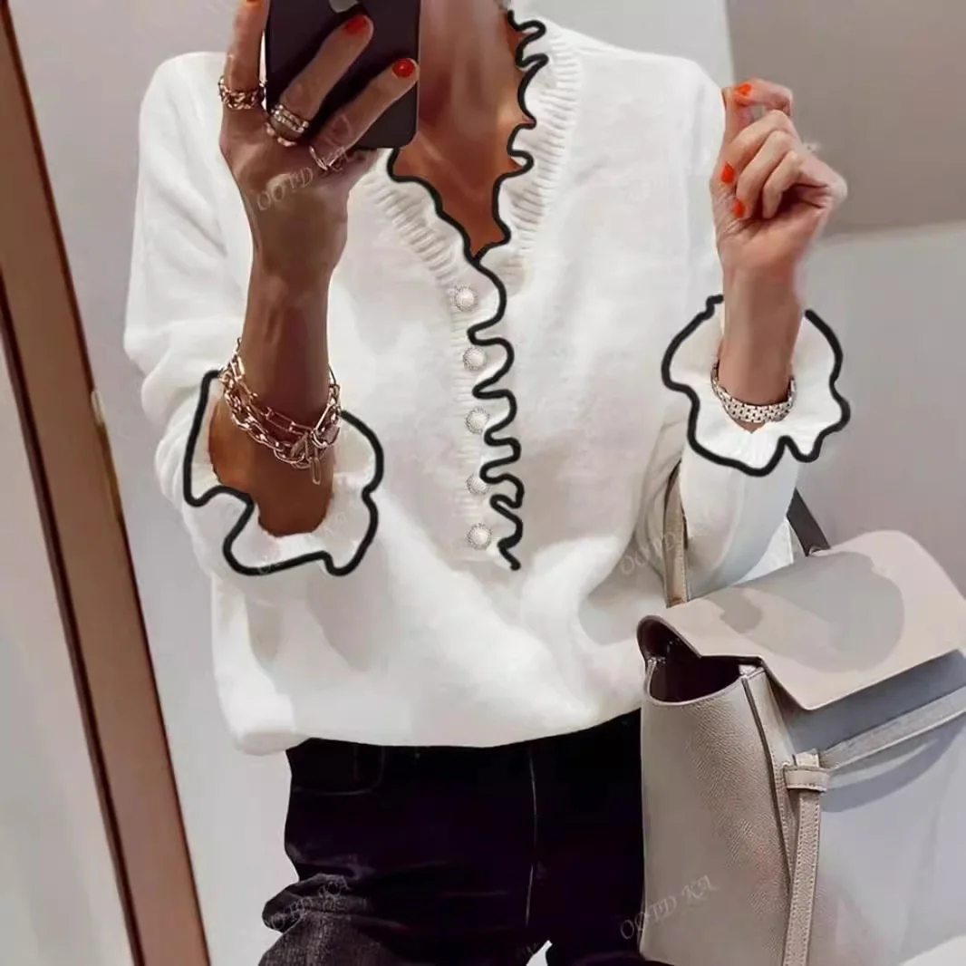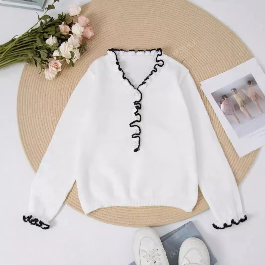 Autumn Women's Korean-Style Long-Sleeved Rib Top with New Design Knitted Front Lace Versatile Sweater