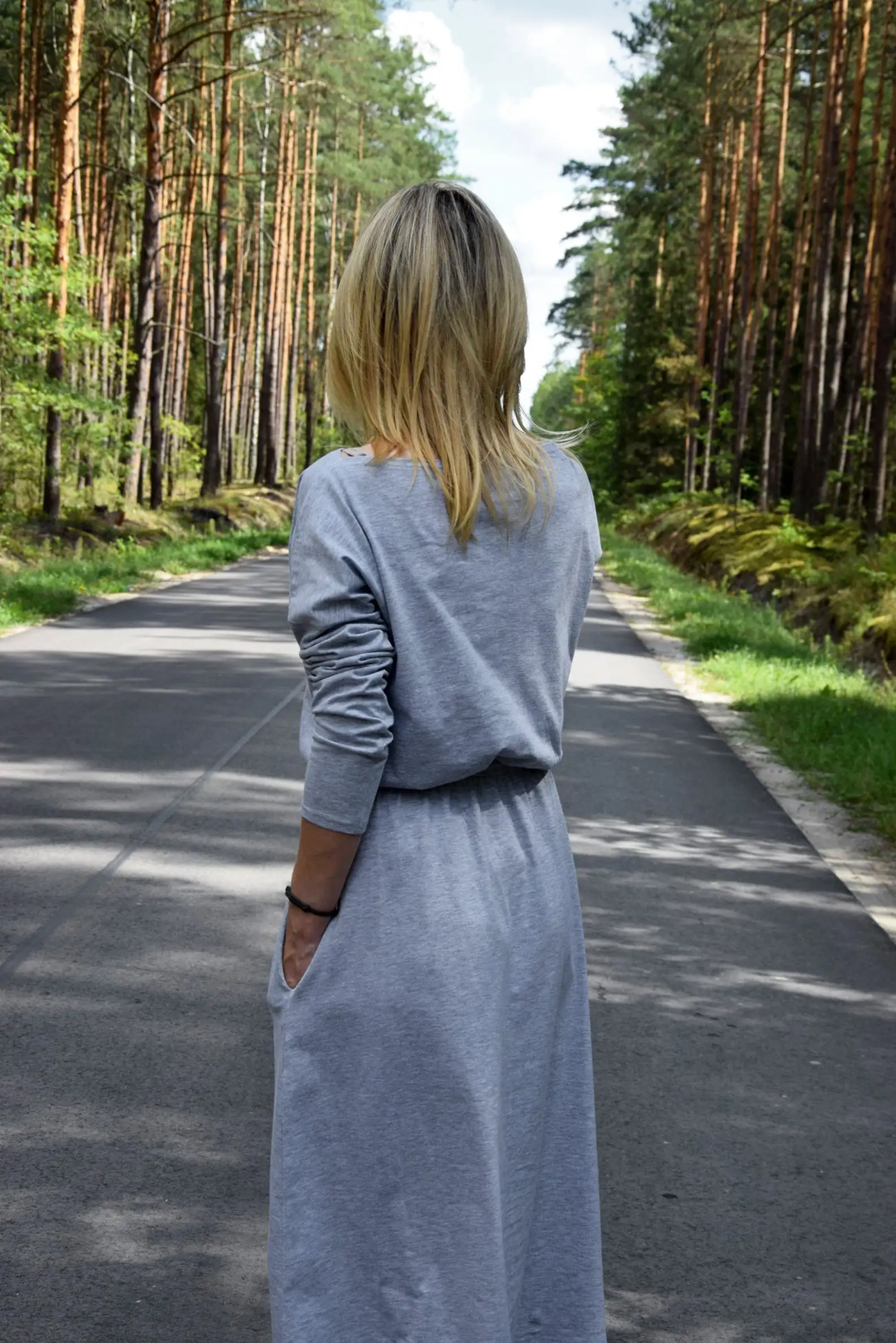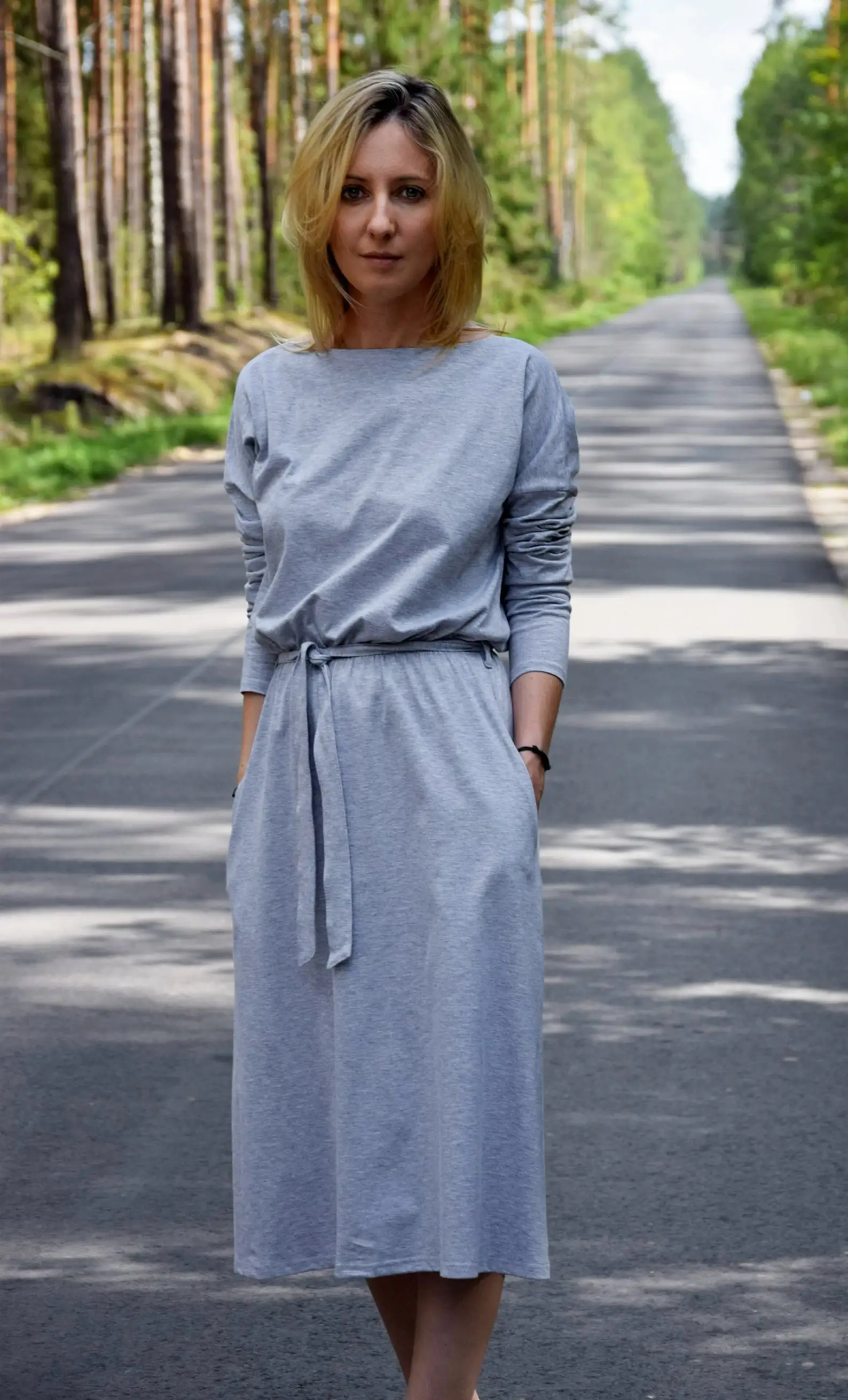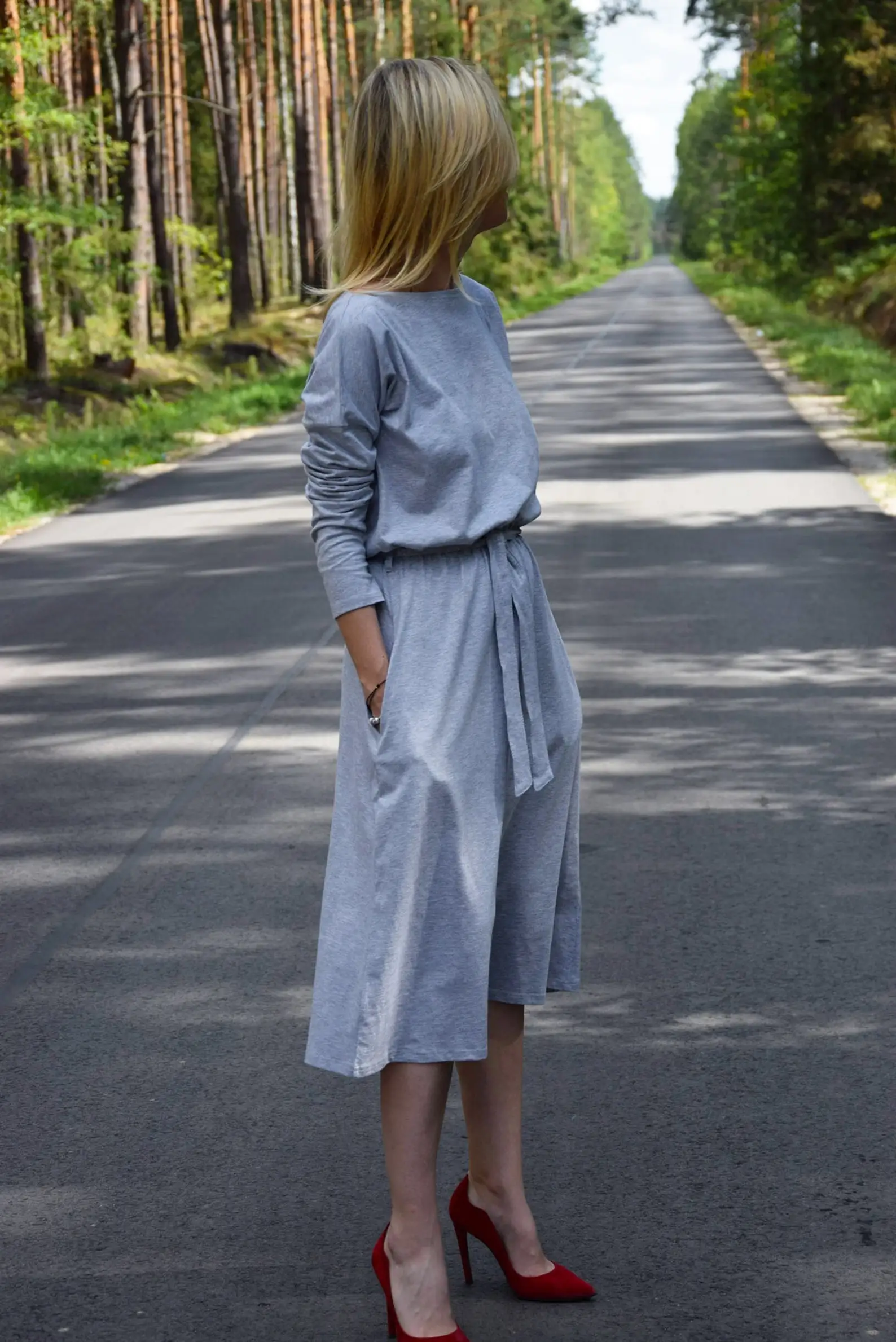 Handmade High Quality Women's Cotton Midi Dress Vintage Gray with Waist Belt Long Sleeve Pockets Woven Eco-Friendly Dress