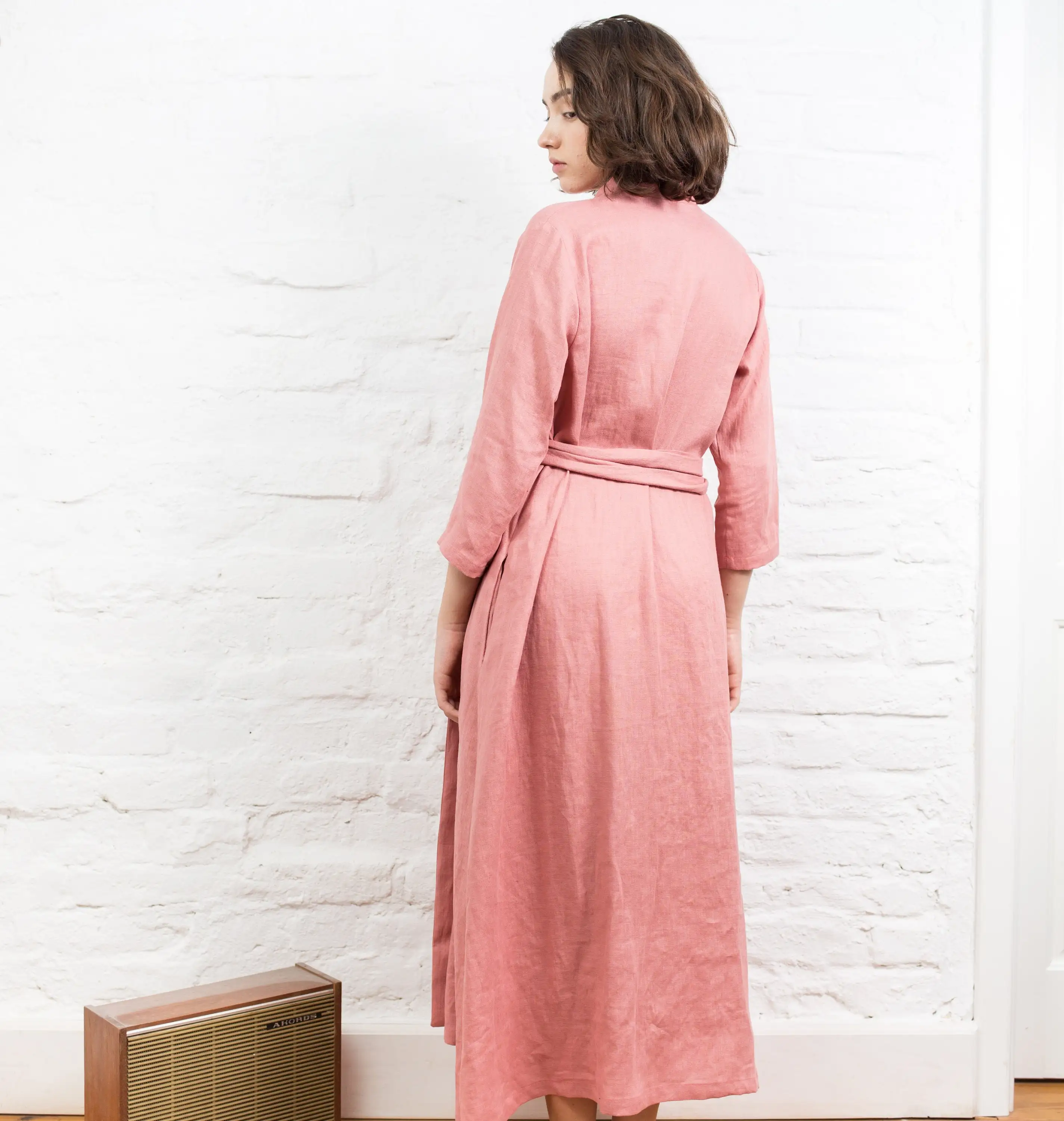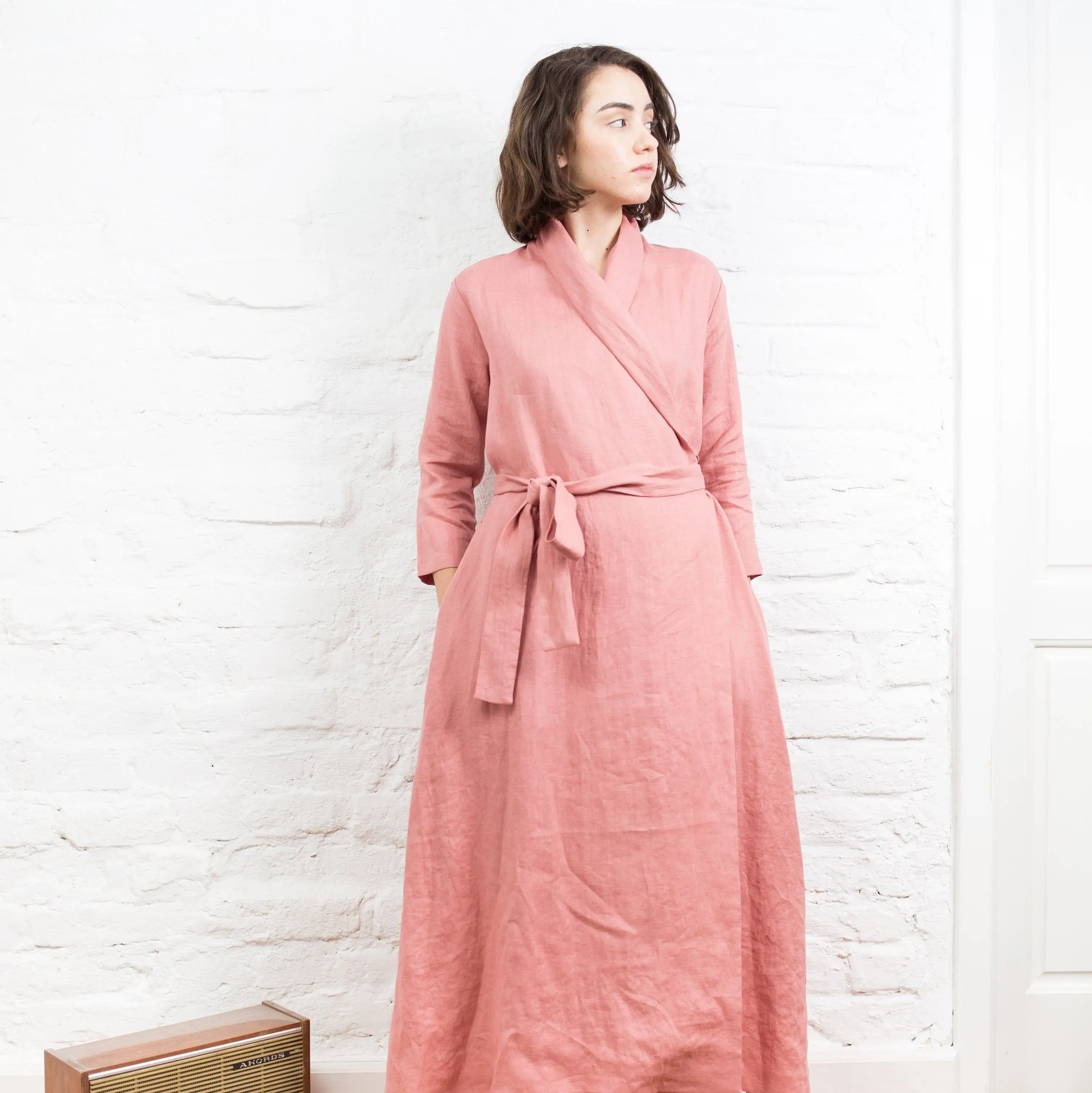 Women's Eco-Friendly Linen V-Neck Wrap Maxi Dress Long Sleeve Kimono with Belt Pockets Natural Waistline Woven Weave