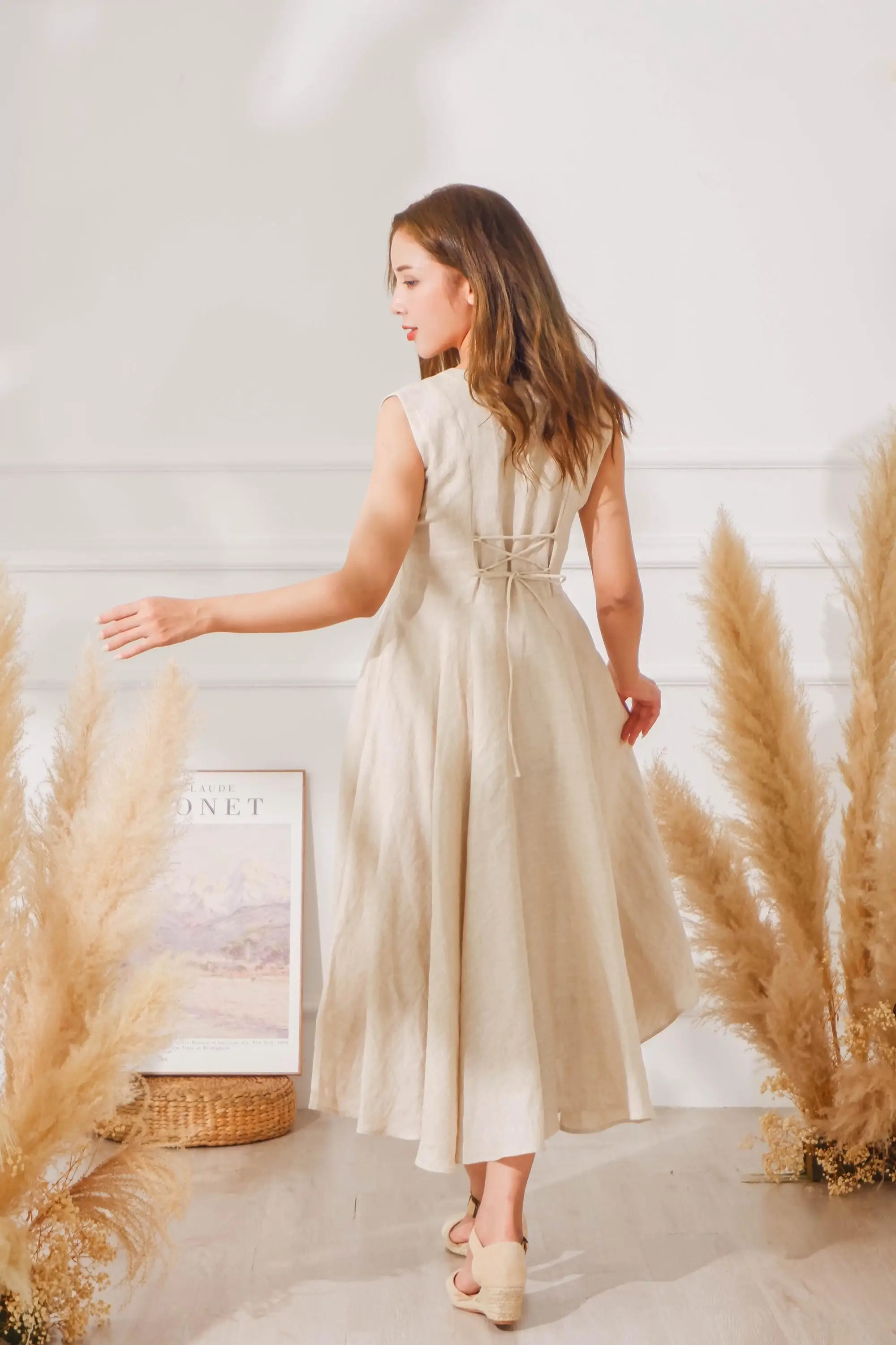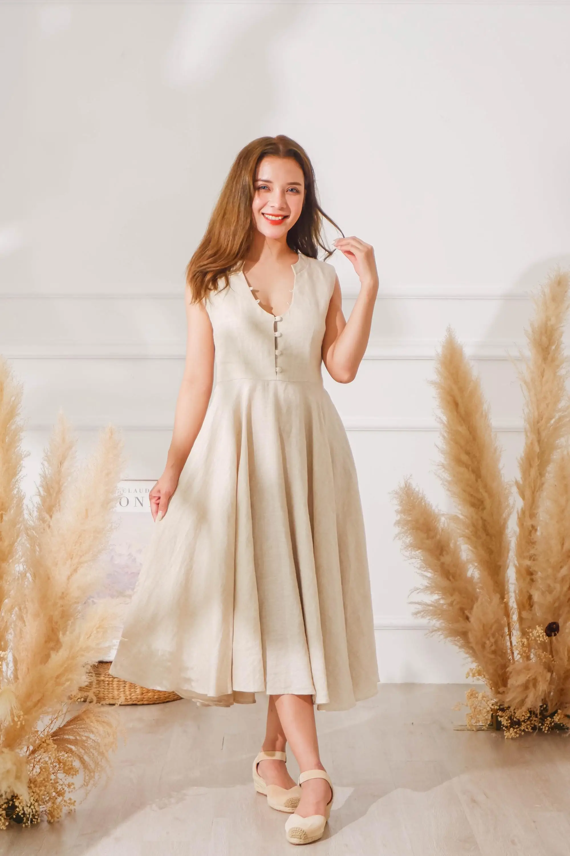 Graceful Linen Dress With V neck Dress With Fit And Flare Beige Color For Women Available Big Size Dress With Buttons Bow Tie