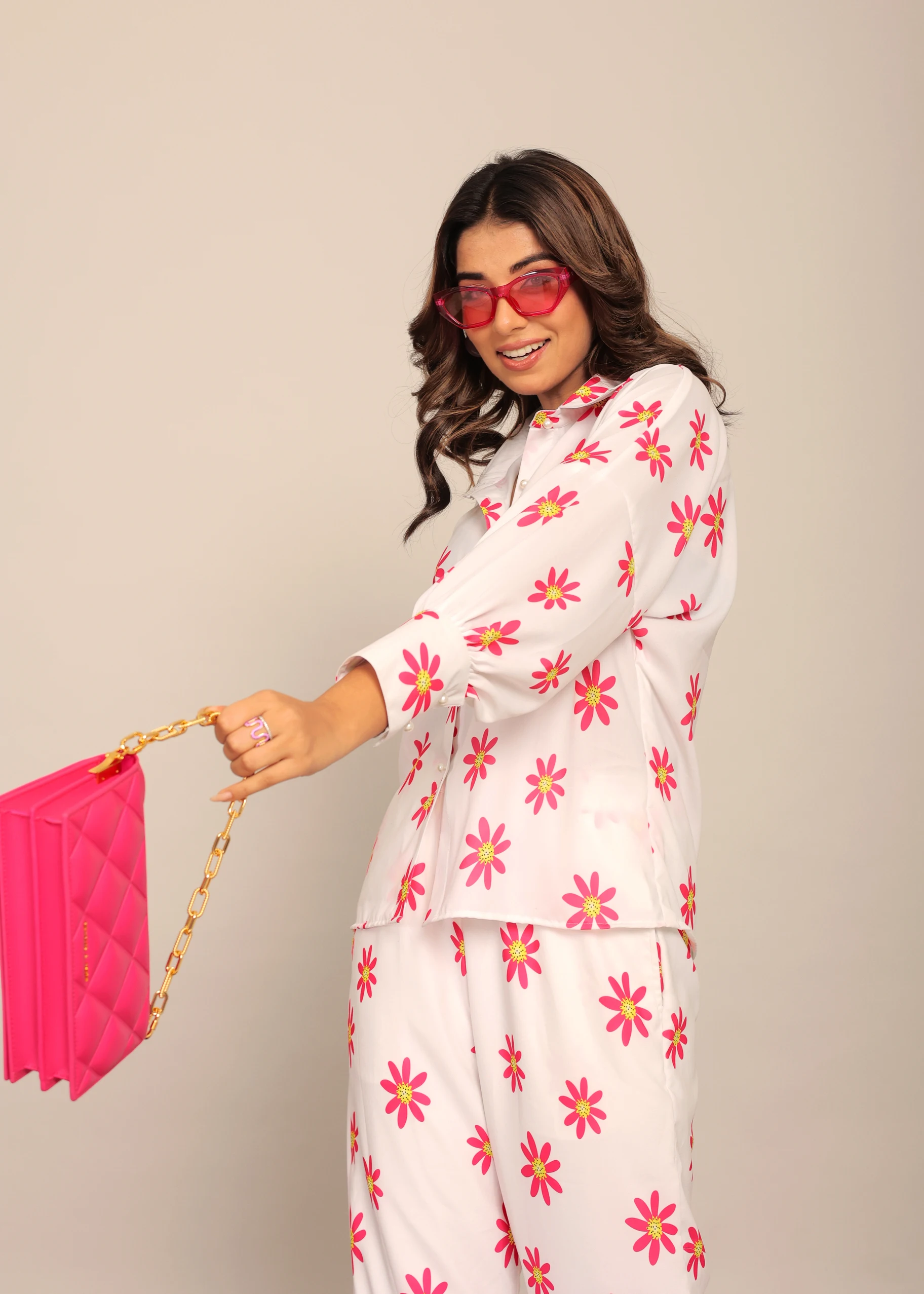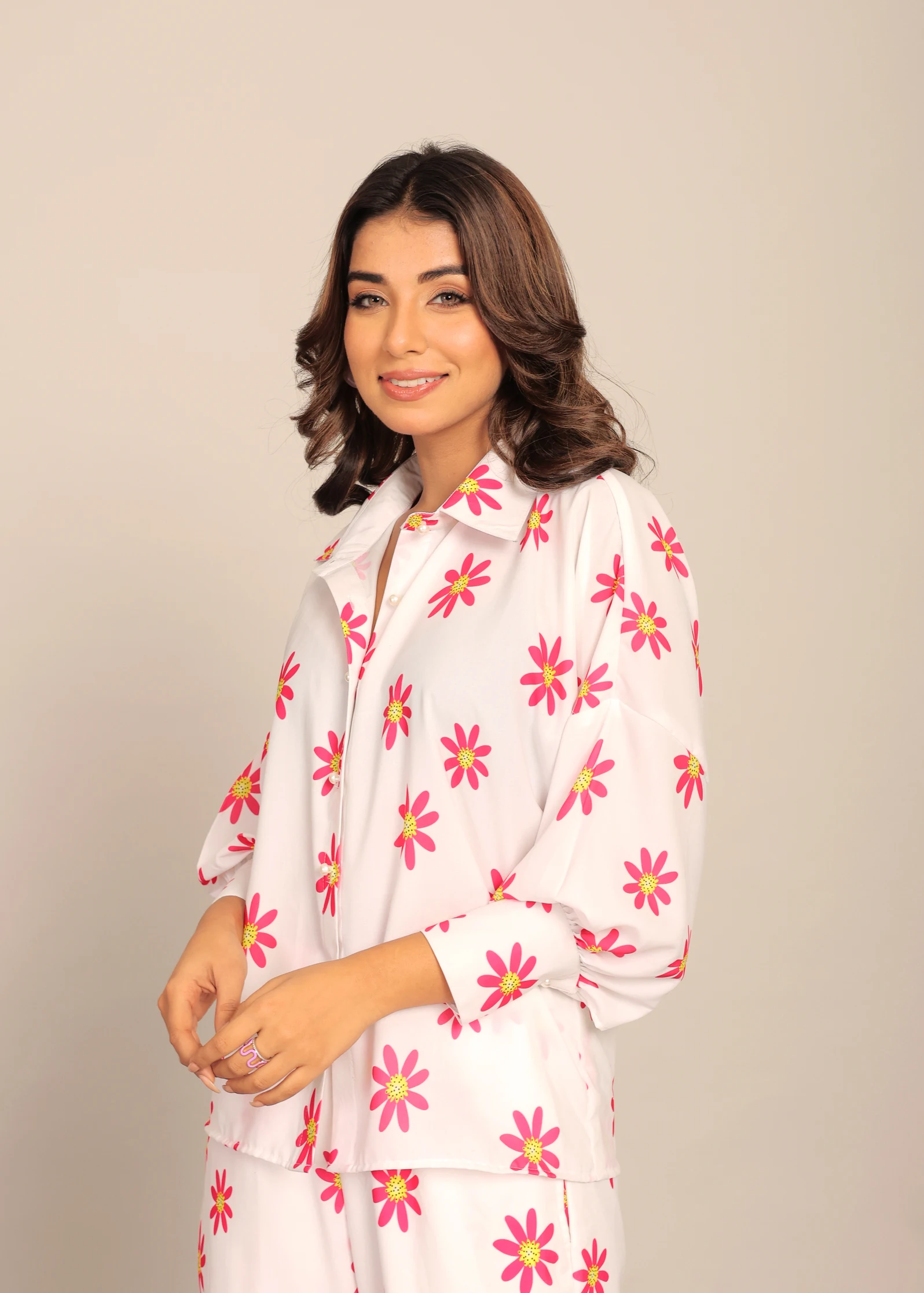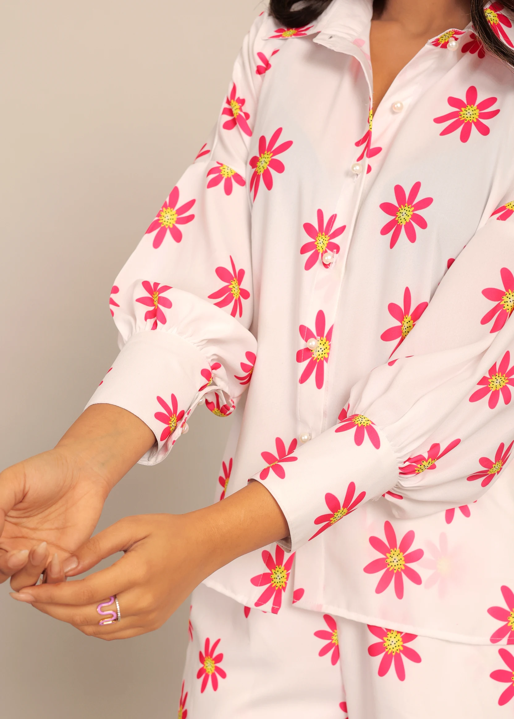 Top Quality Fall Spring White and Red Floral Printed Relaxed Shirt With Collar and Closer 6 Buttons Loose Available Big Size