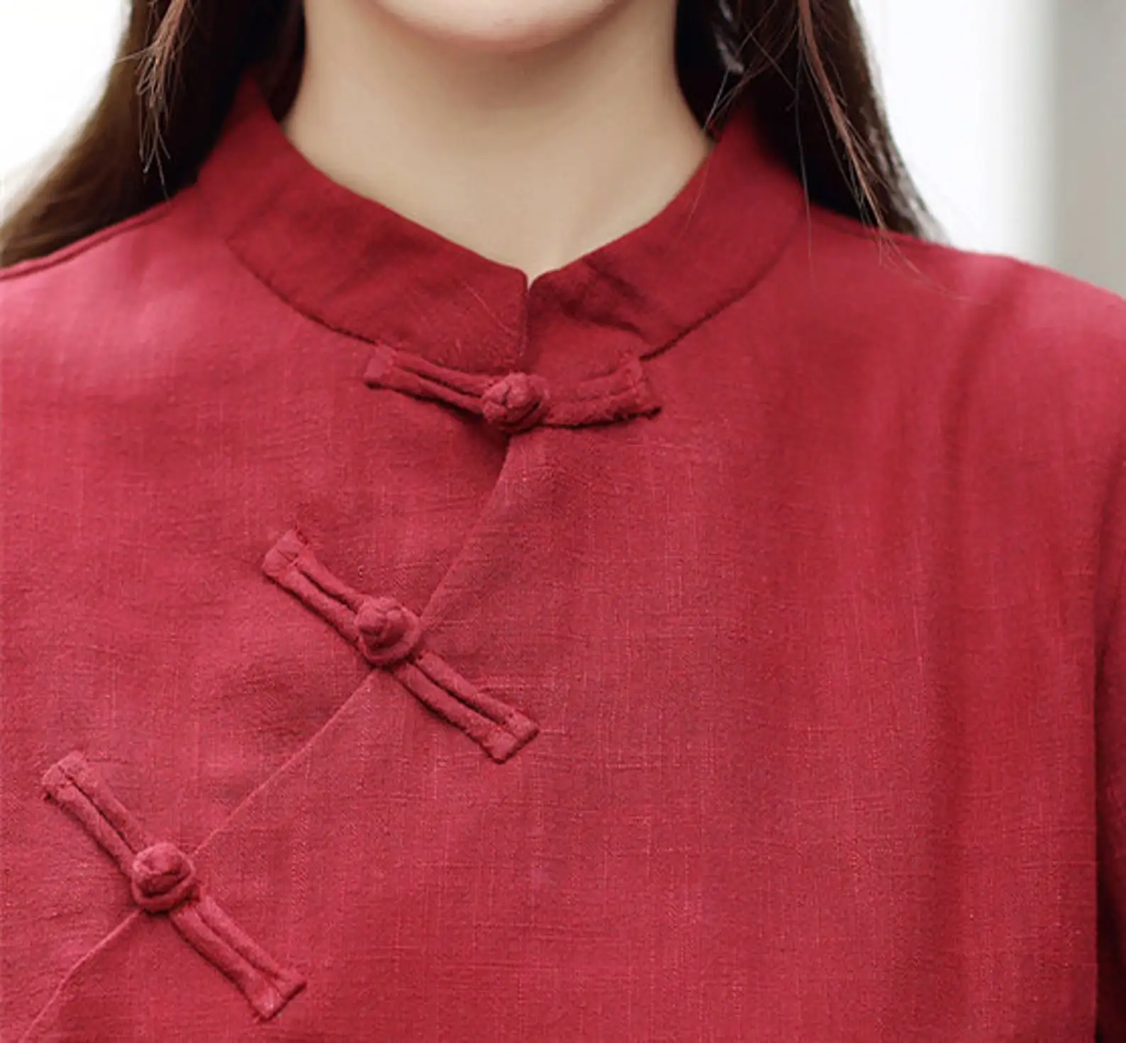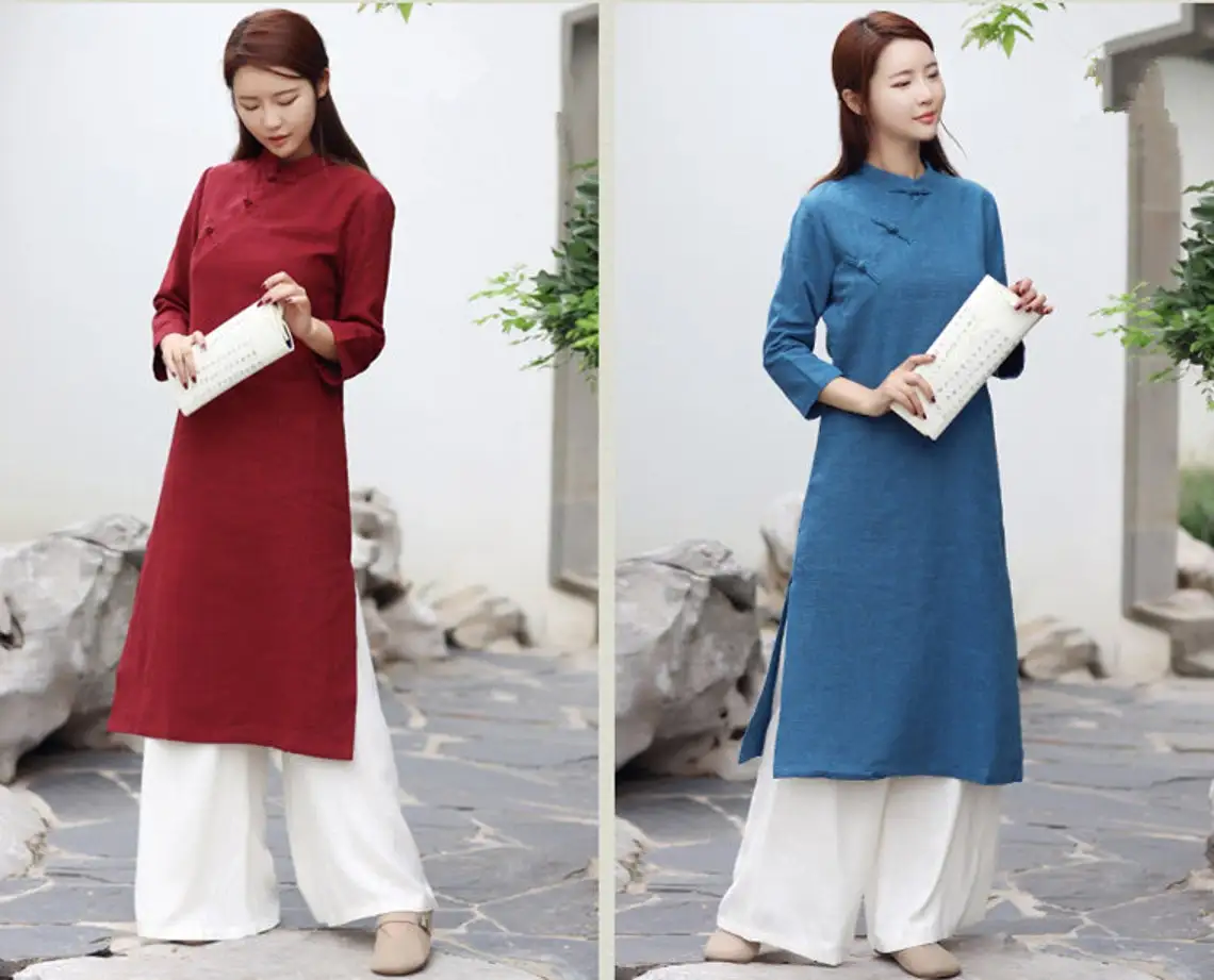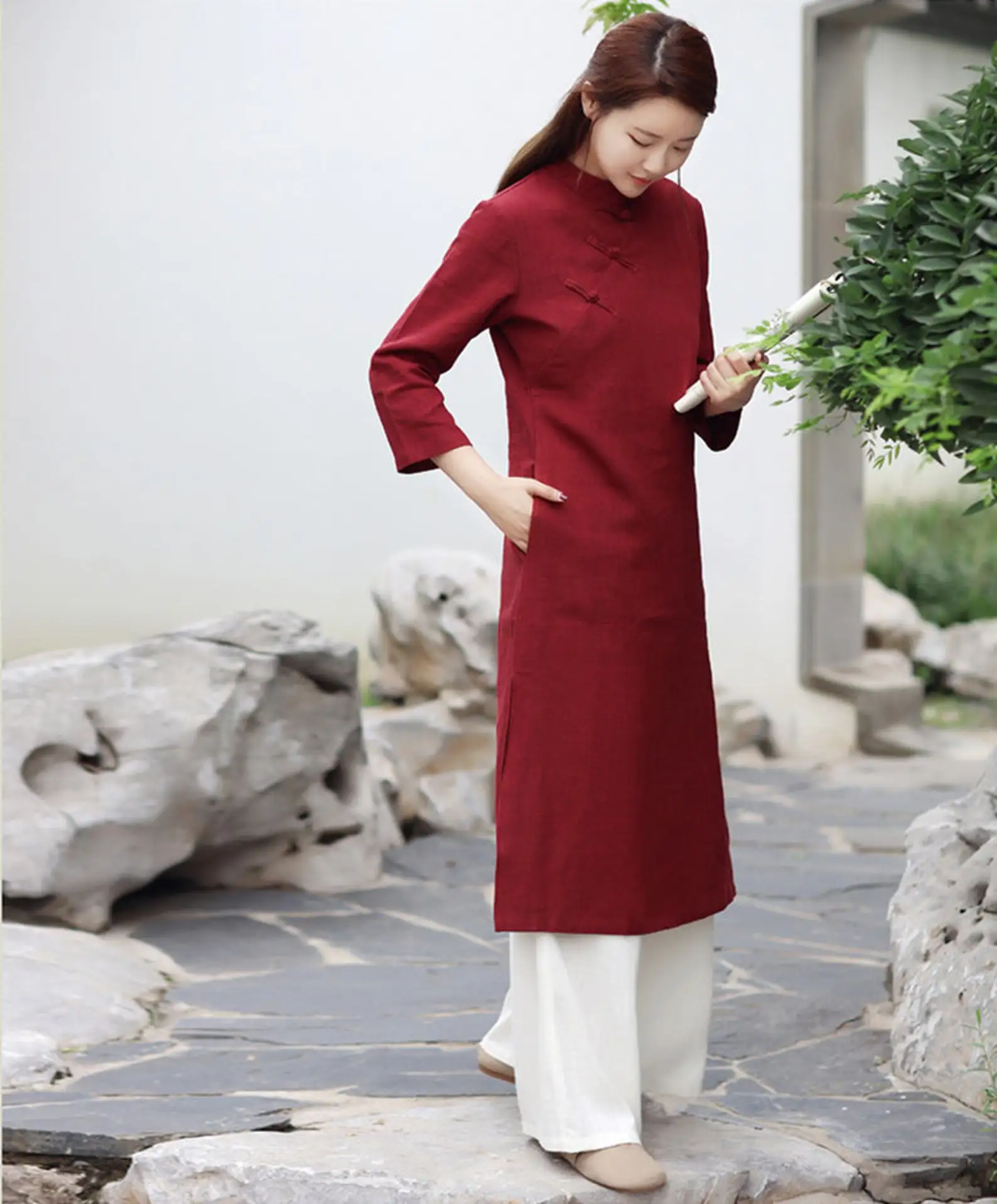 Linen Ethnic Style Tunic Women Long Sleeves Dress Soft Casual Loose Tunics Robe Midi Dress Customized Solid Available Big Size