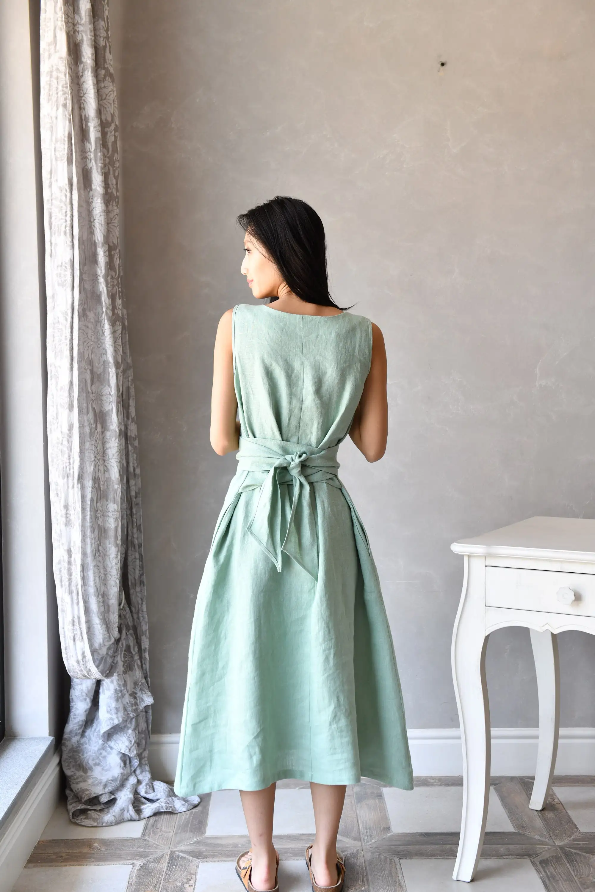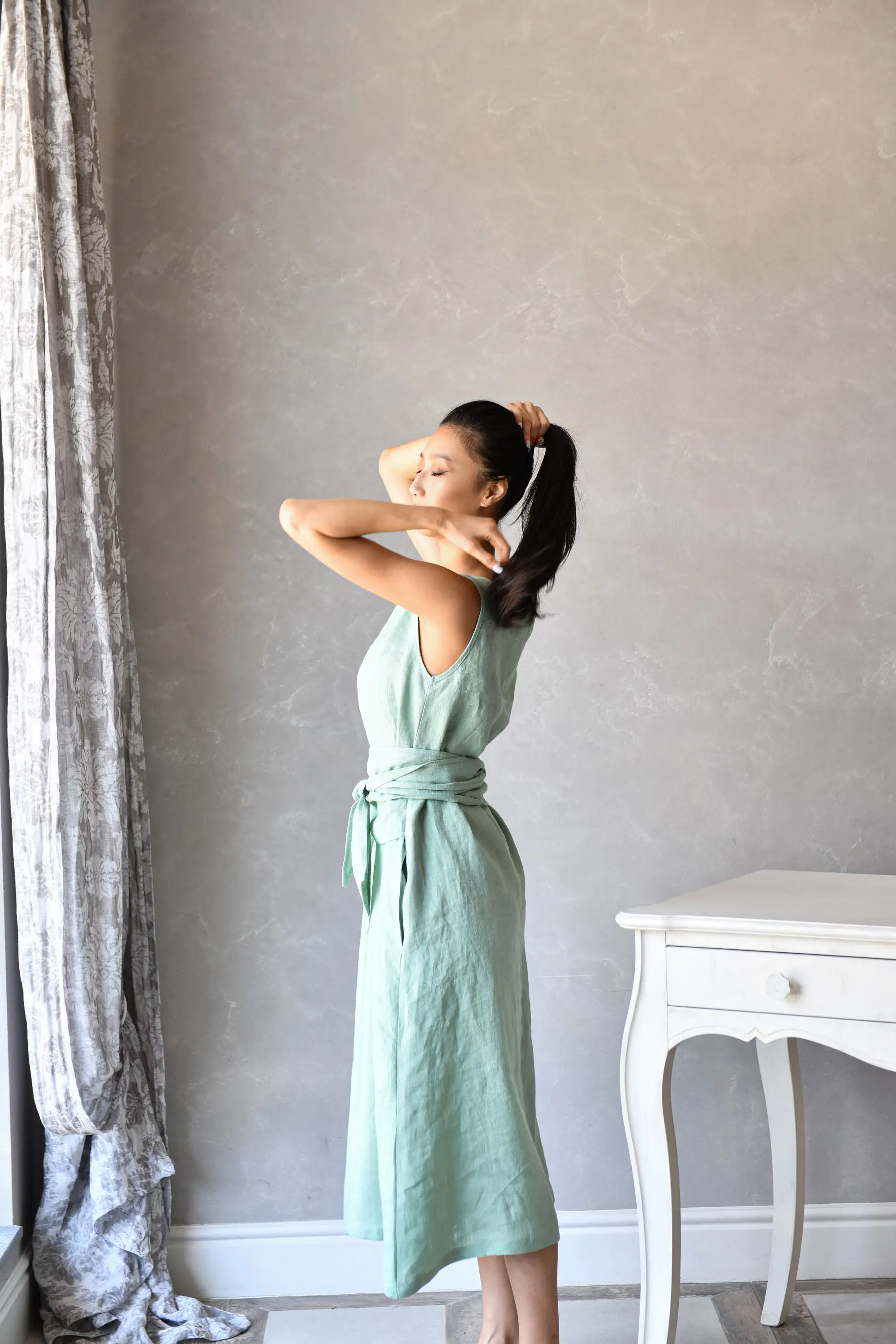 Summer Sleeveless Linen Wrap Dress Multiway Convertible Plus Size Clothing Linen Midi Length with Belt Pockets Wrap Dress