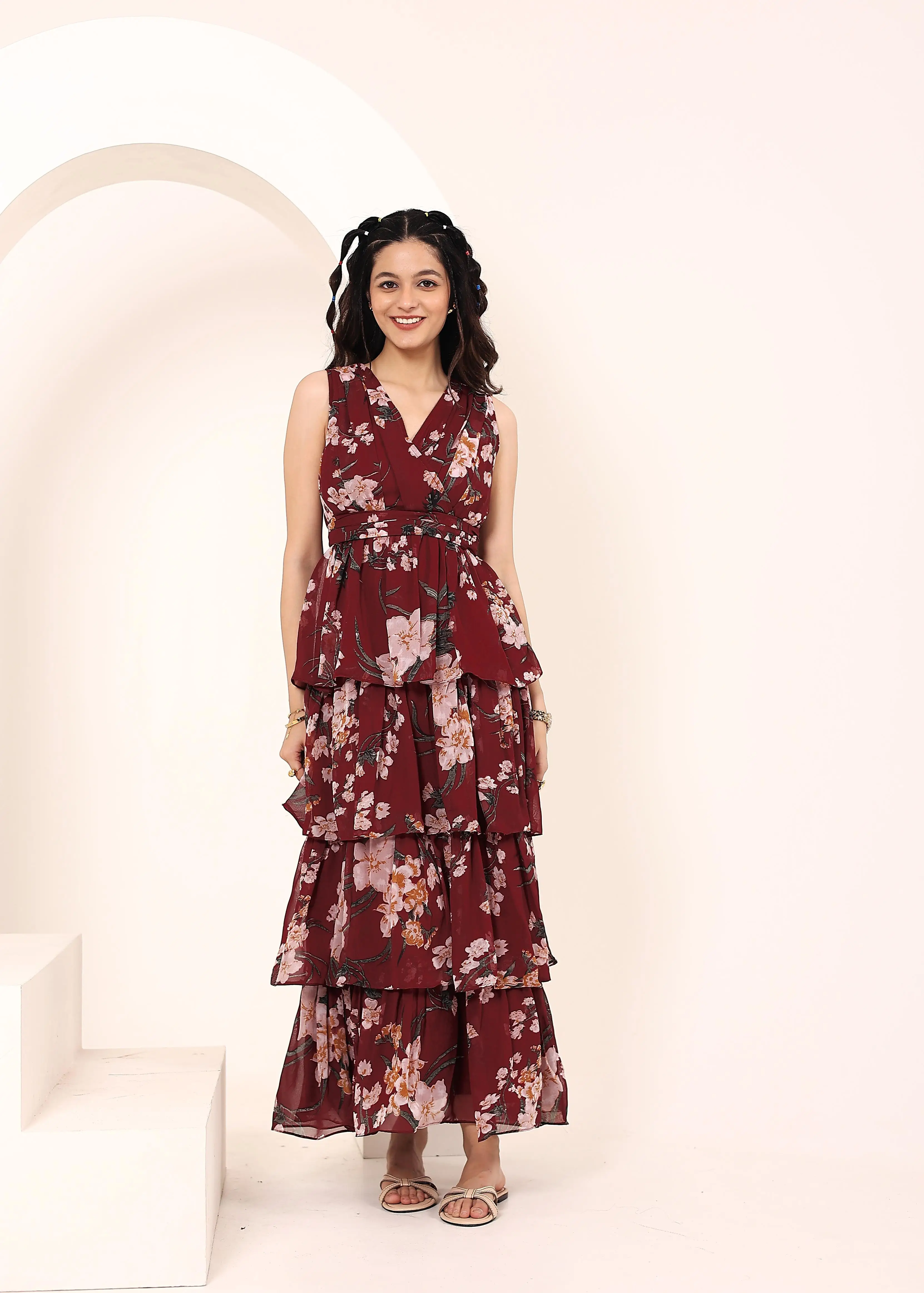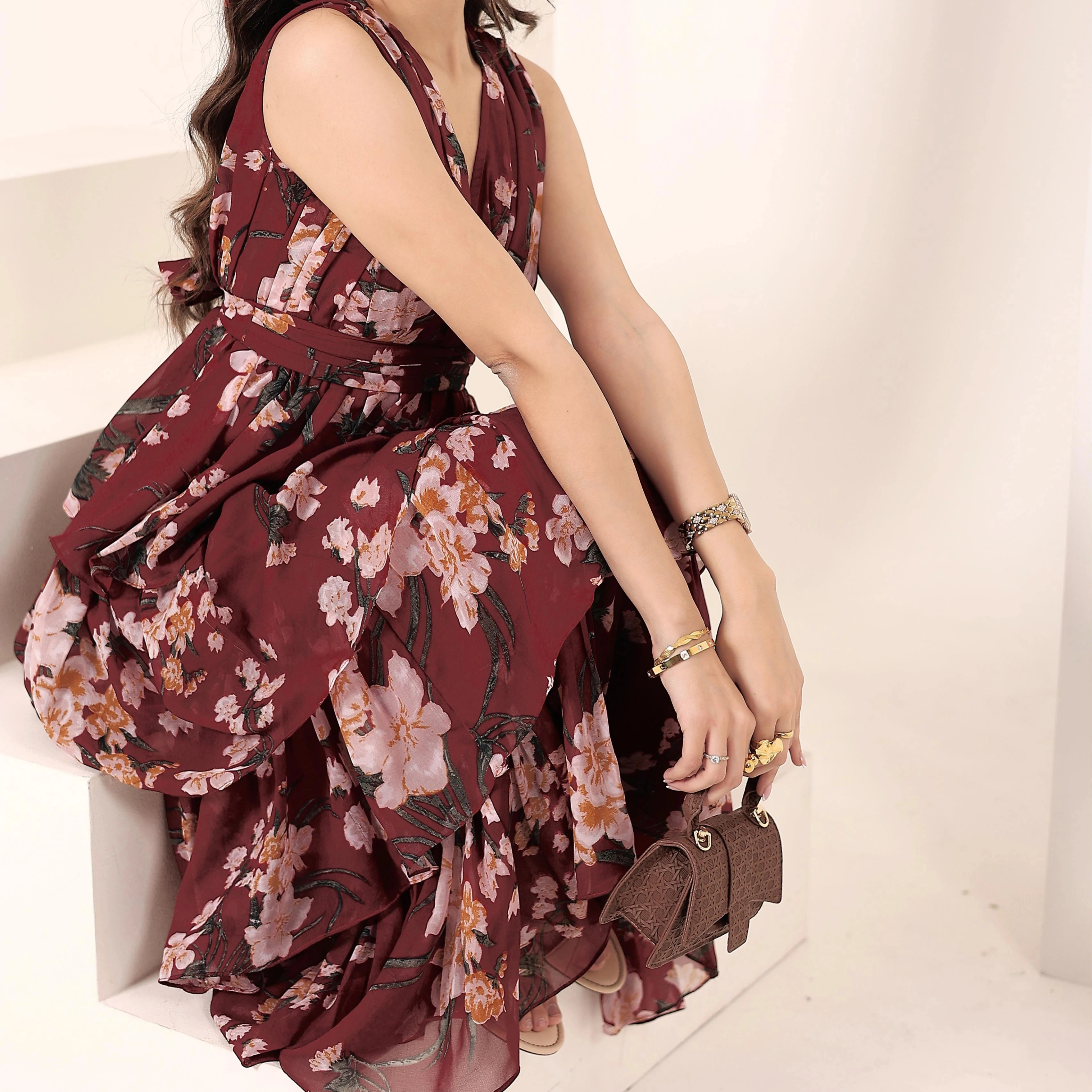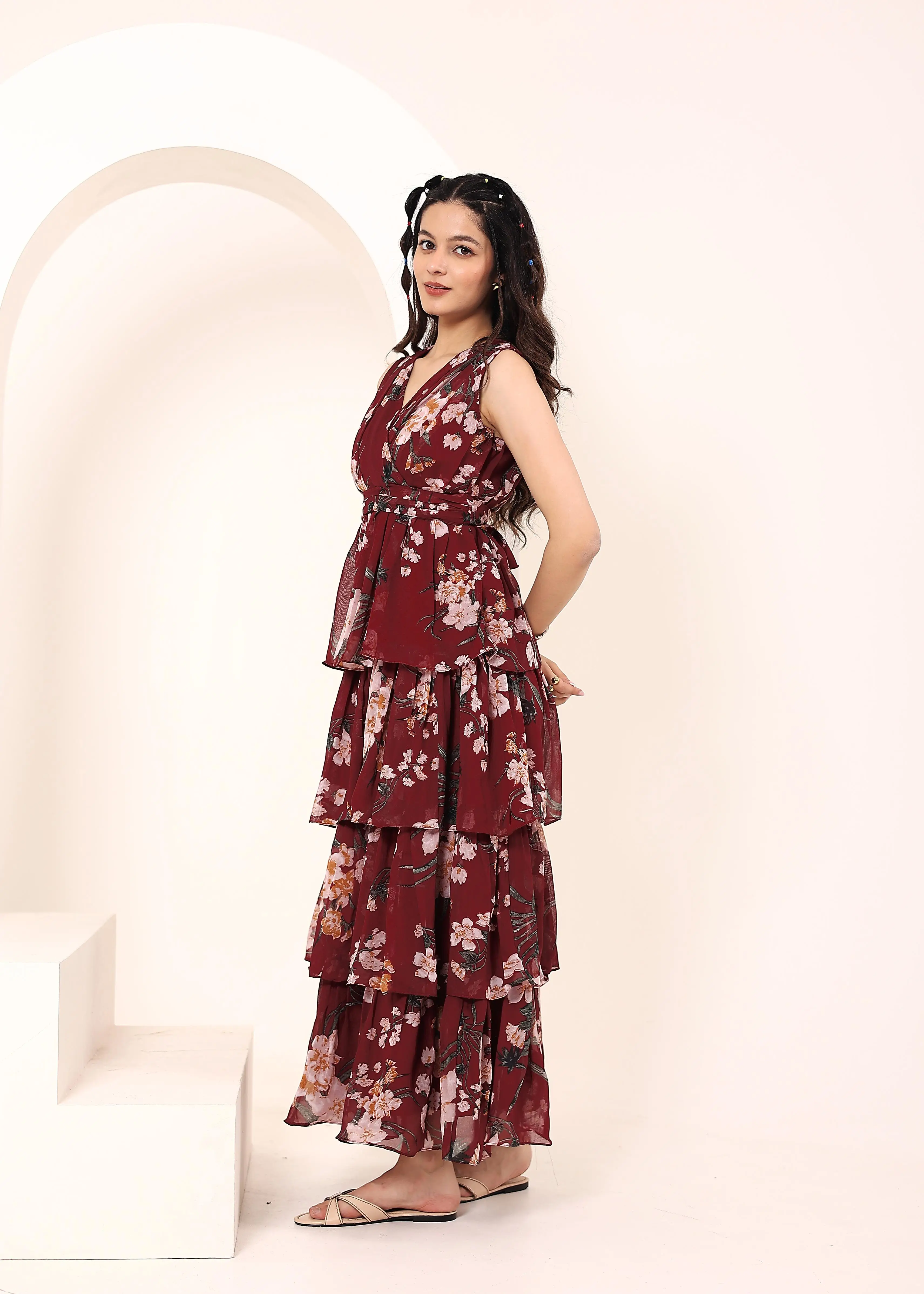 Maroon Chiffon Floral Printed Maxi Ruffled Dress Party And Evening Wear Elegant Stylish Available Big Size At Wholesale Price