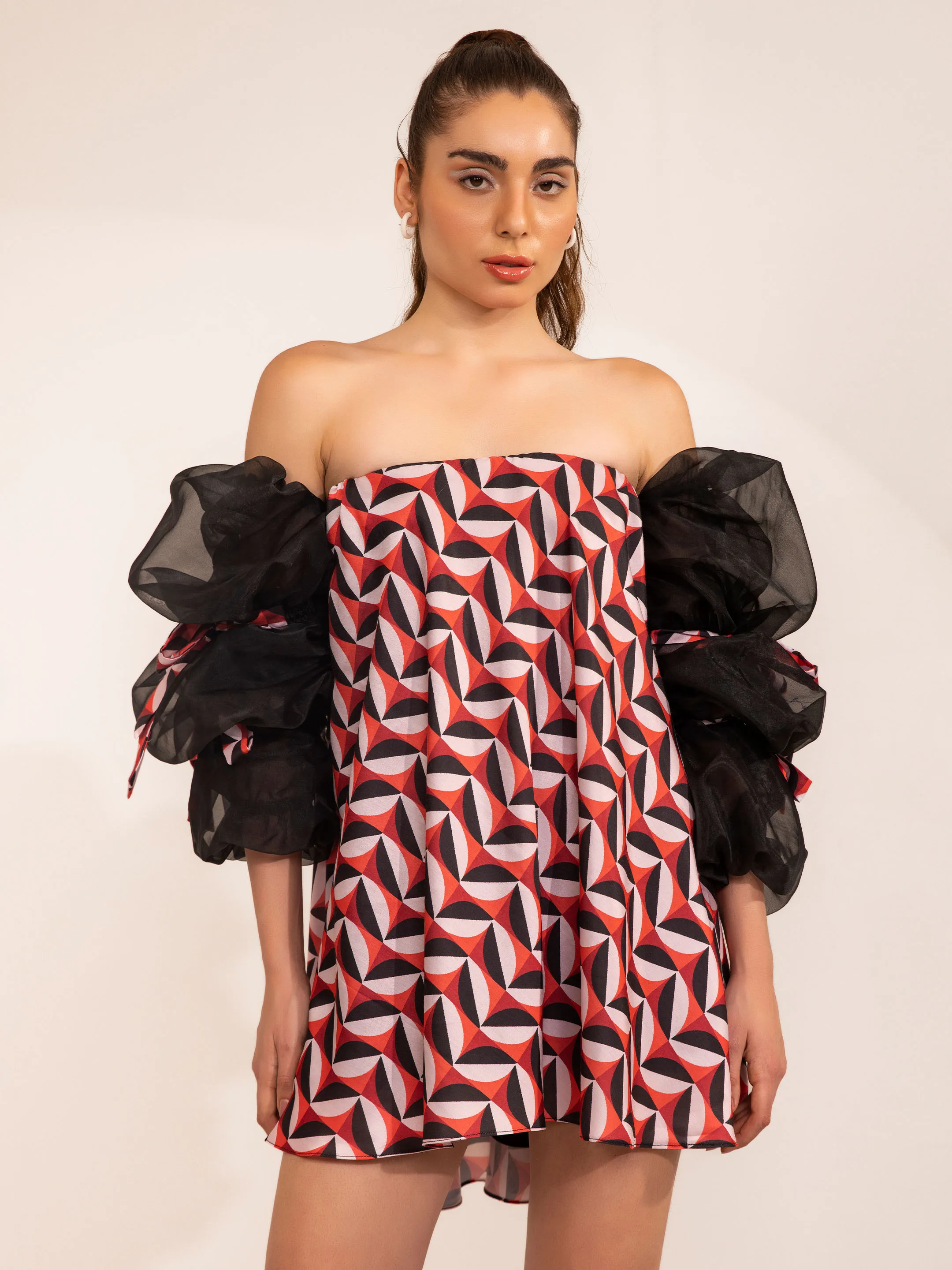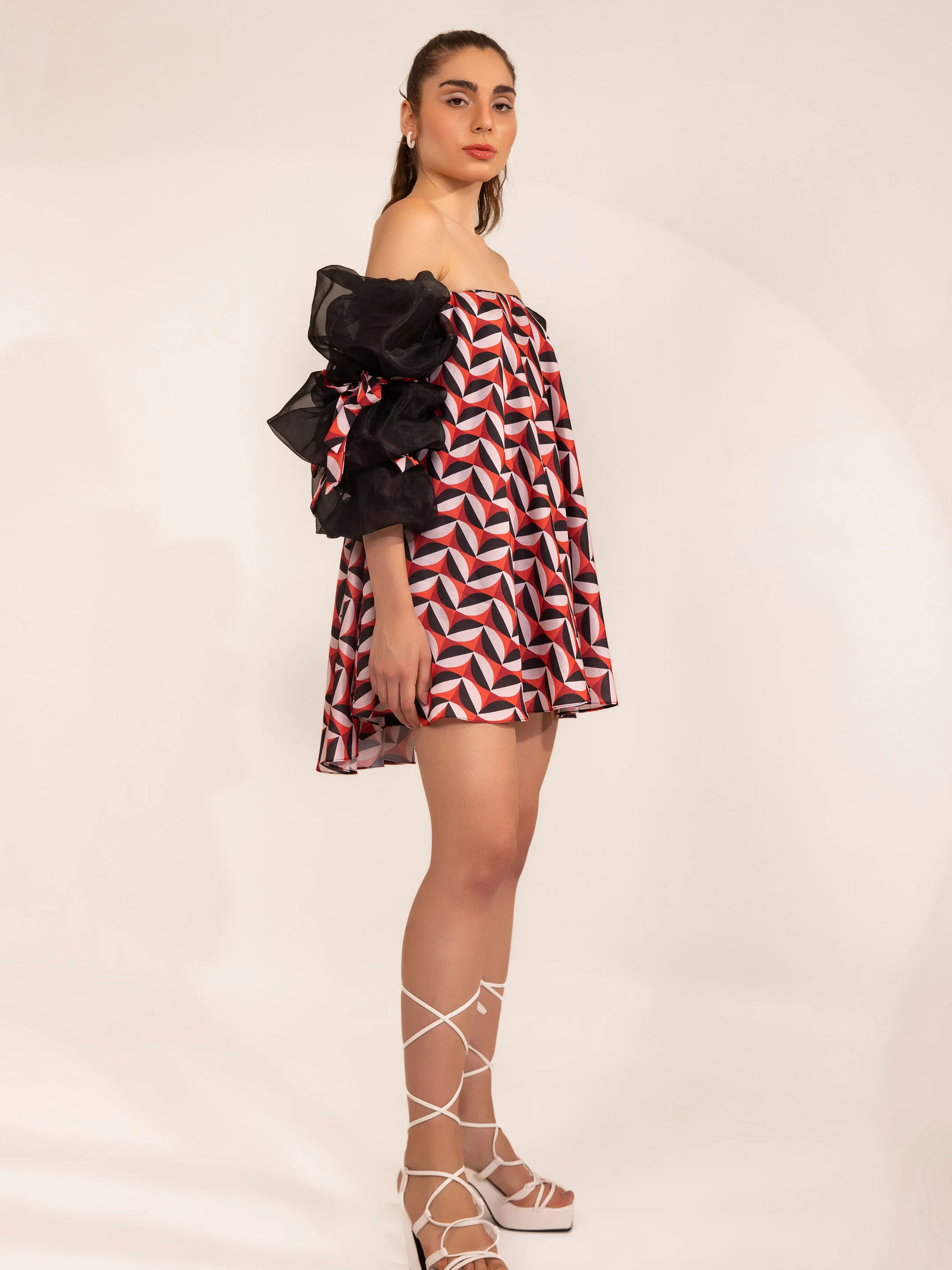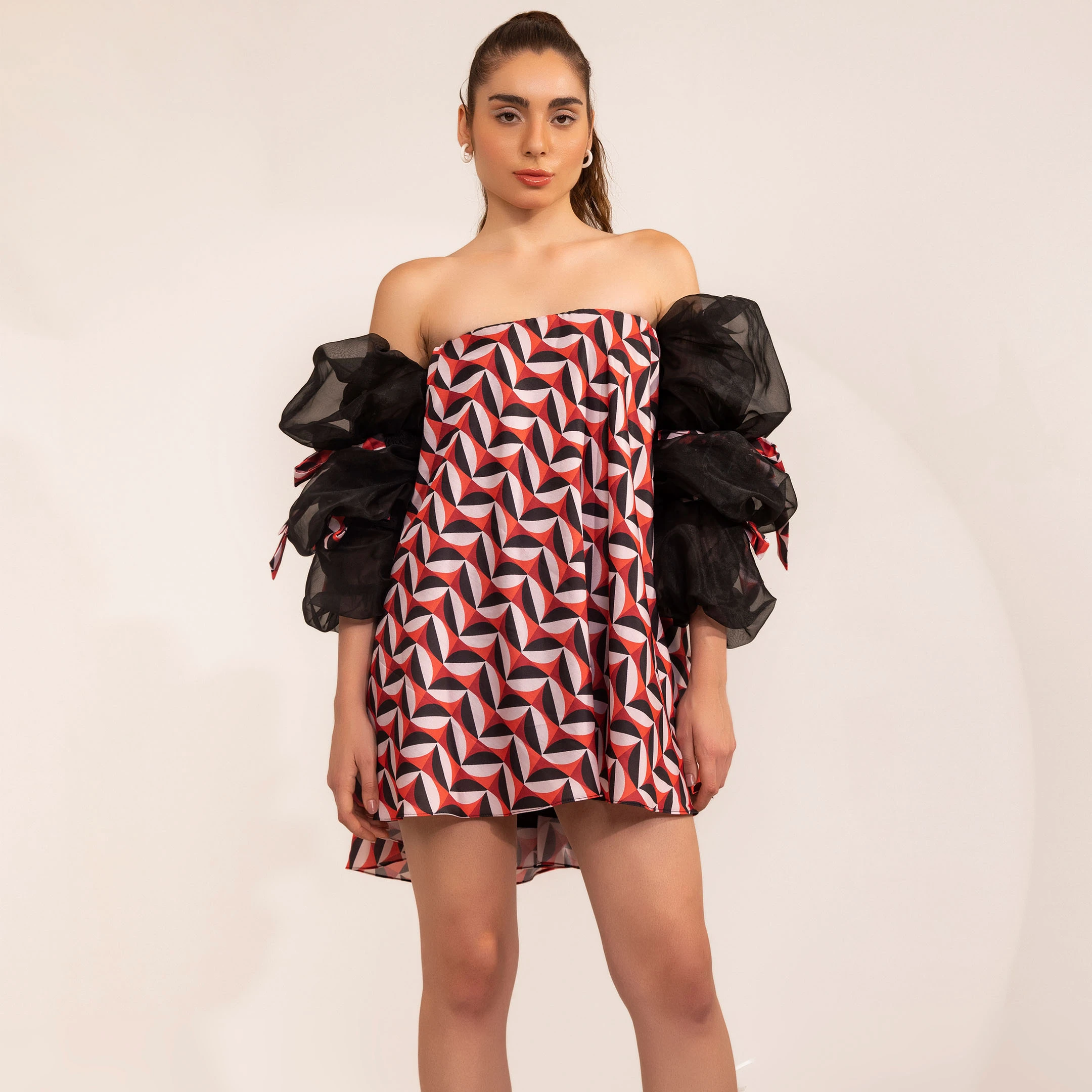 Black & Red Geometric Print Off Shoulder Midi Dress With Organza Statement Sleeves Casual Women's Short Dress Available Big Size