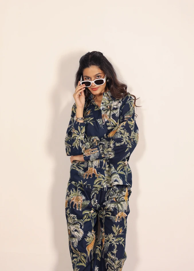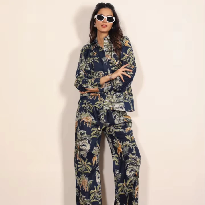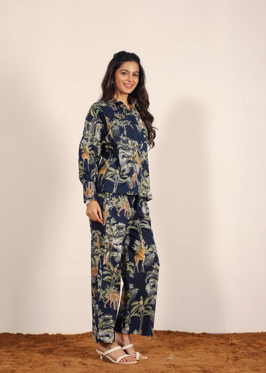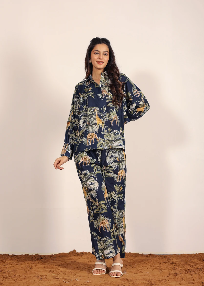 Navy Blue Multicolor Printed 100% Cotton Co-ord Set High Quality Oversized Shirt & Wide Leg Pant Woven with Natural Waistline