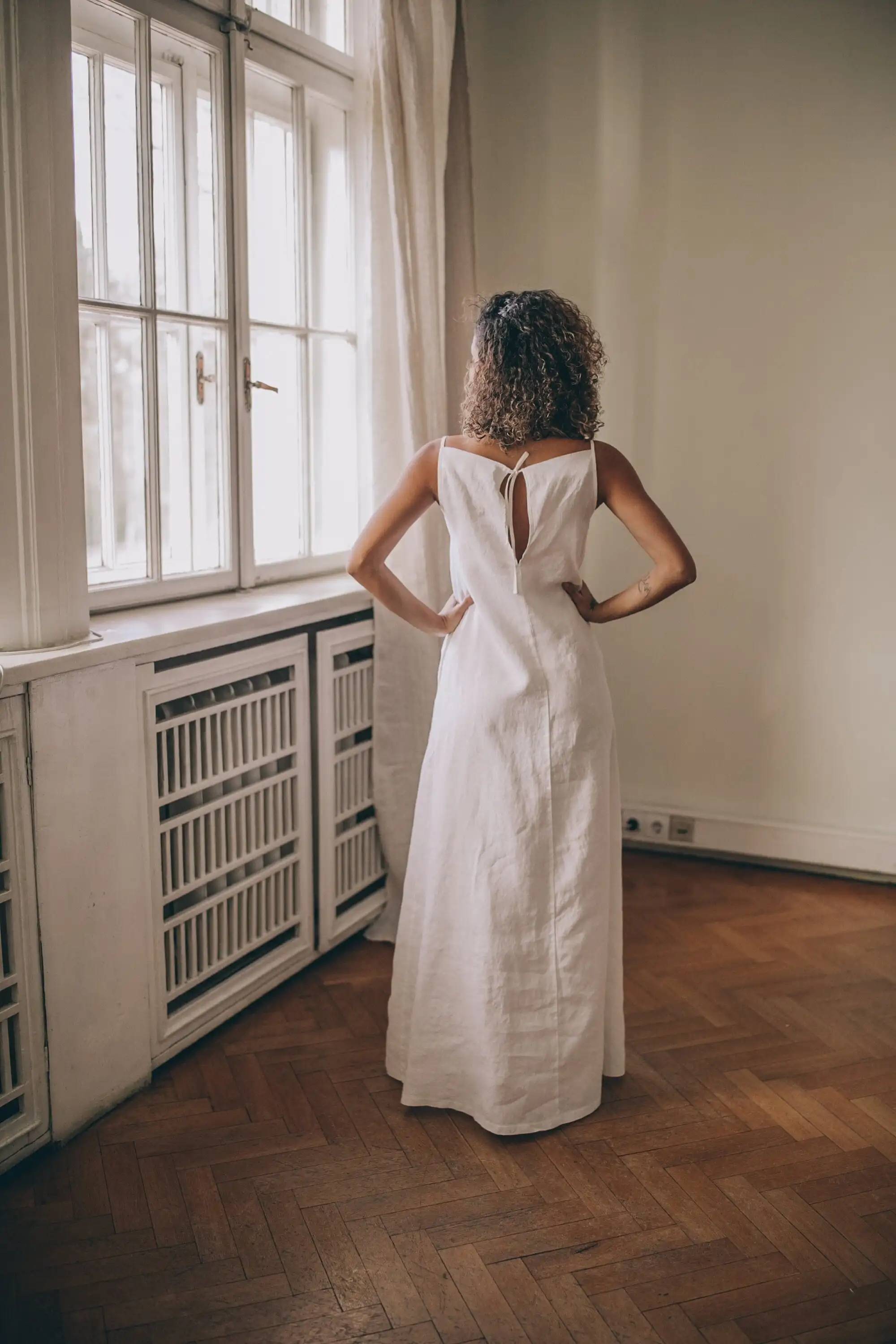 Simple Summer Linen Maxi Dress Tie Knot Closure Back Eco-Friendly Spaghetti Strap Woven Waistline for Your Natural Closure