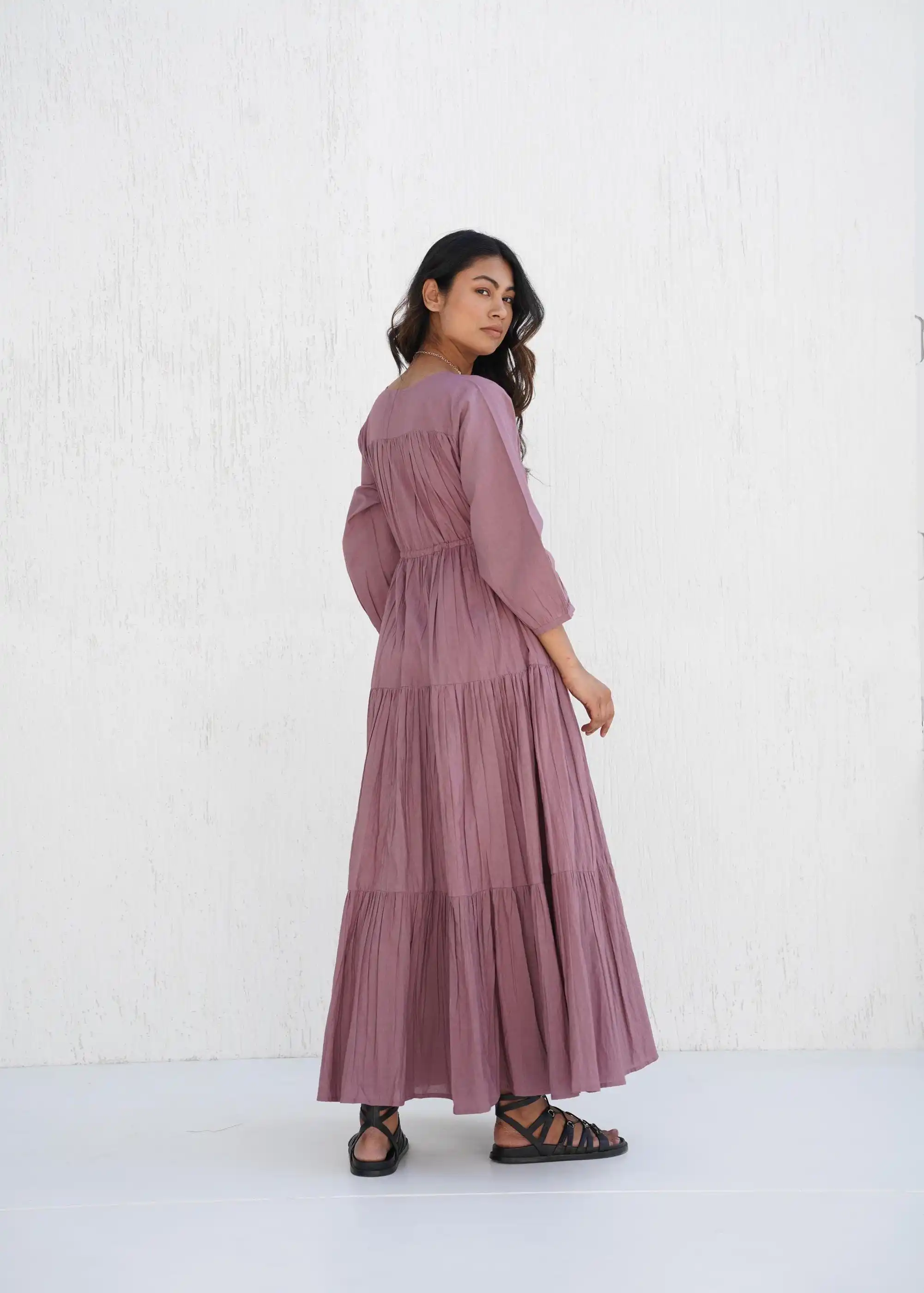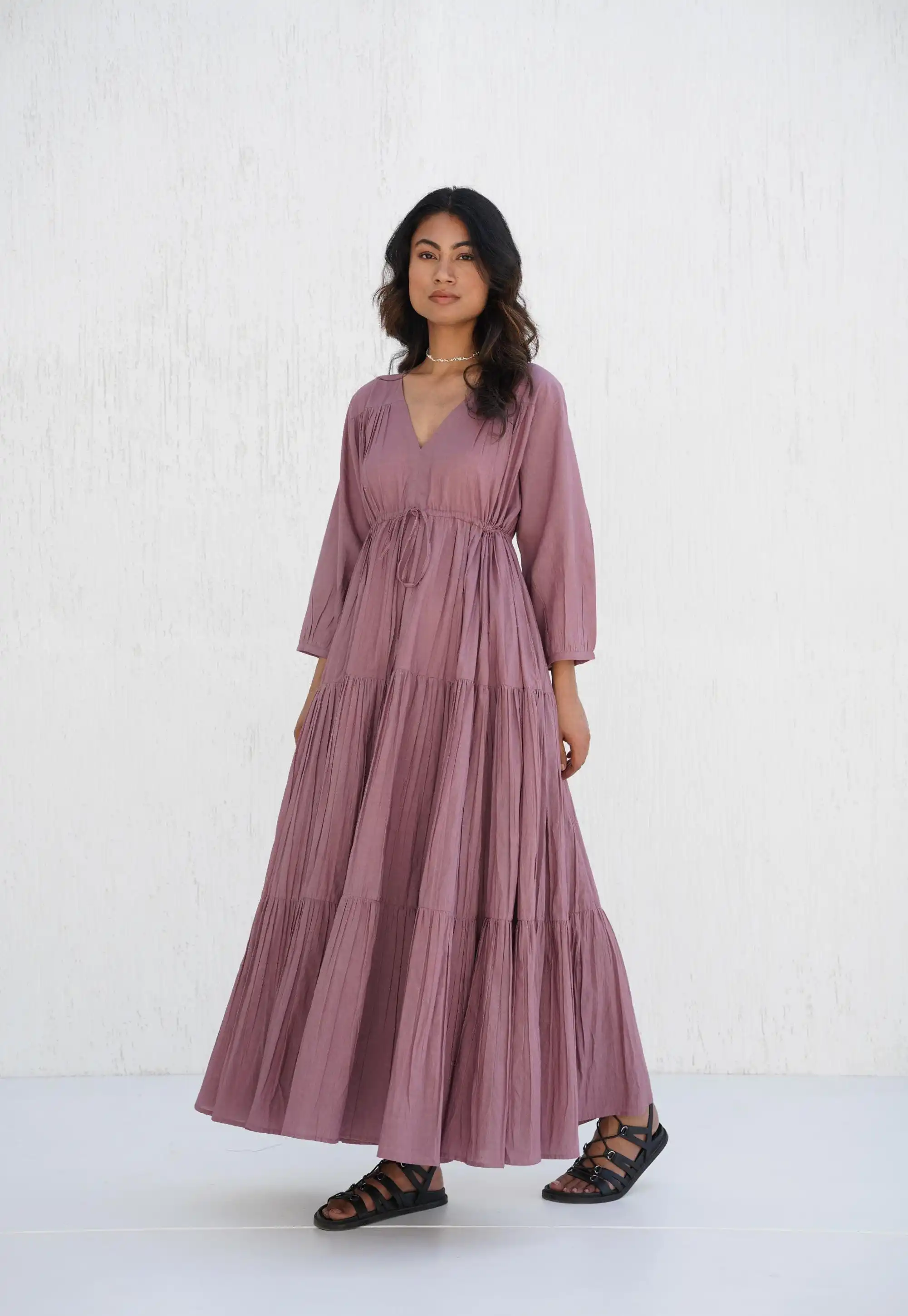 Comfortable Loose Available Big Size Natural Cotton Pleated V Neck Maxi Dress Boho Tunic With Pocket Tiered Layered Design Women