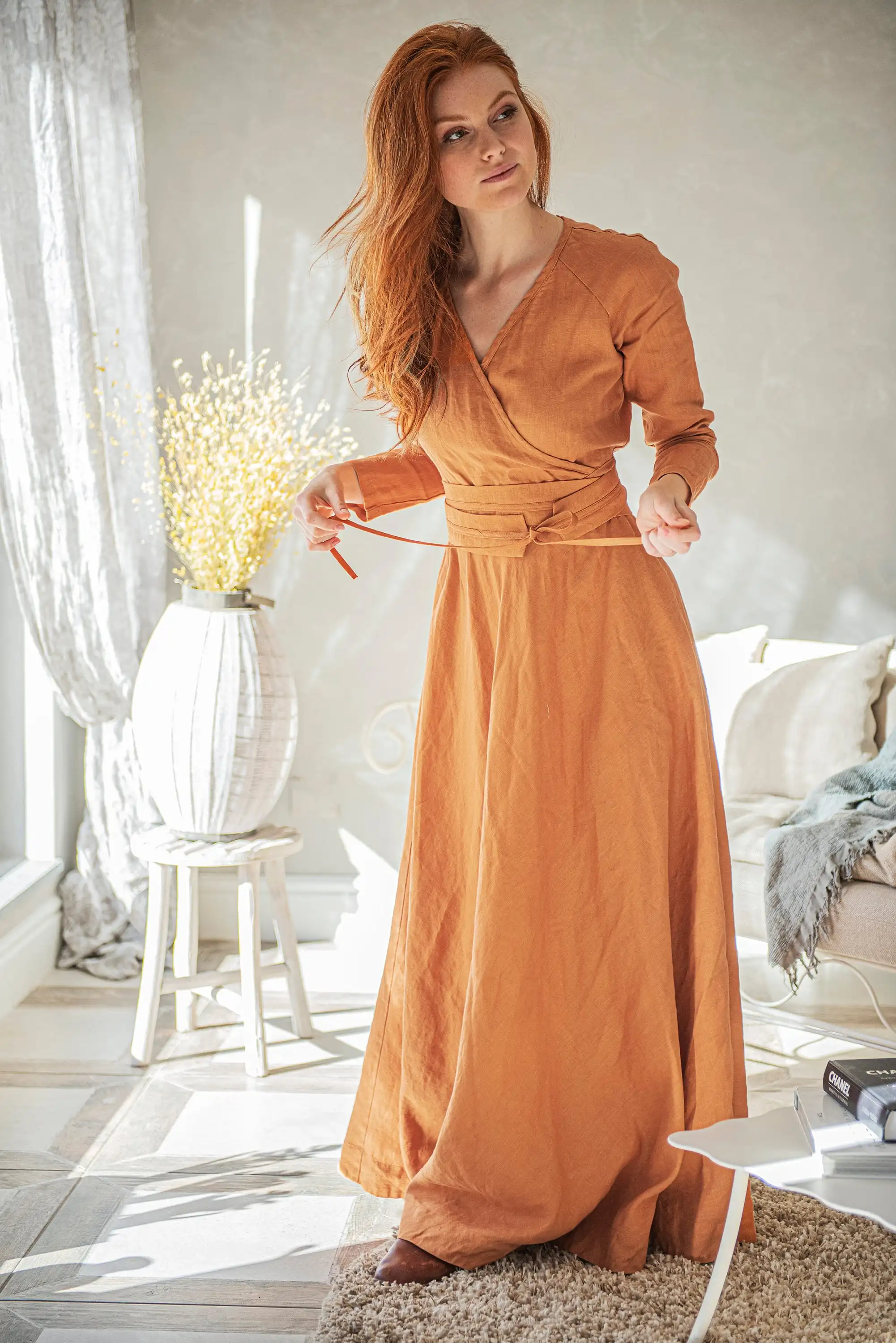 Rusty Orange Linen Maxi Dress Long Wrap with Heavy Long Sleeves Natural Waist Plain Dyed Plus Size Linen Wrap Maxi Dress