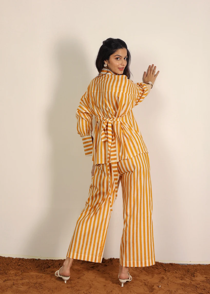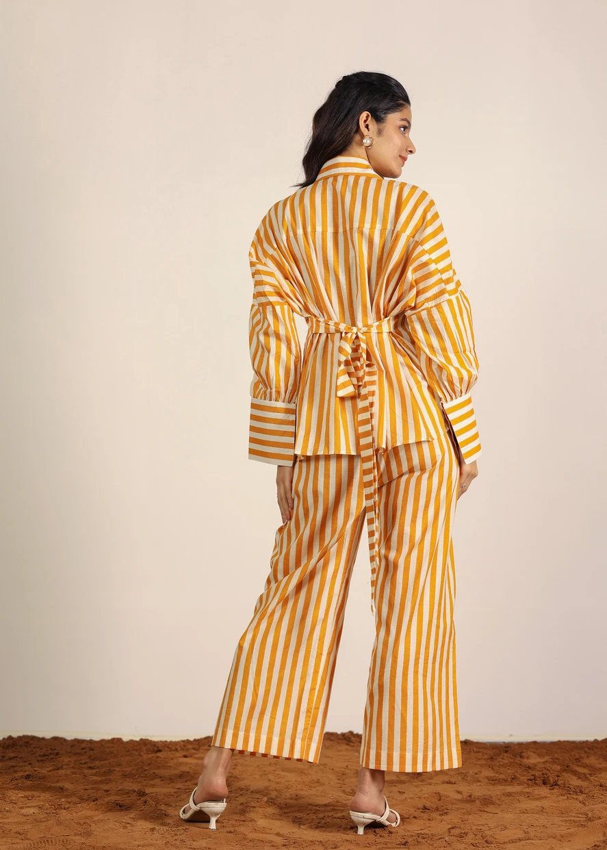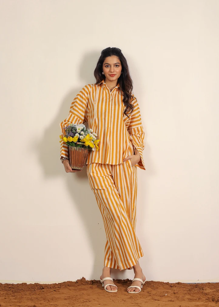Yellow And White Textile Print Two Piece Set Smart Stripes Work Wear Shirt And Wide Leg Casual Striped Printed Cotton Co-ord Set