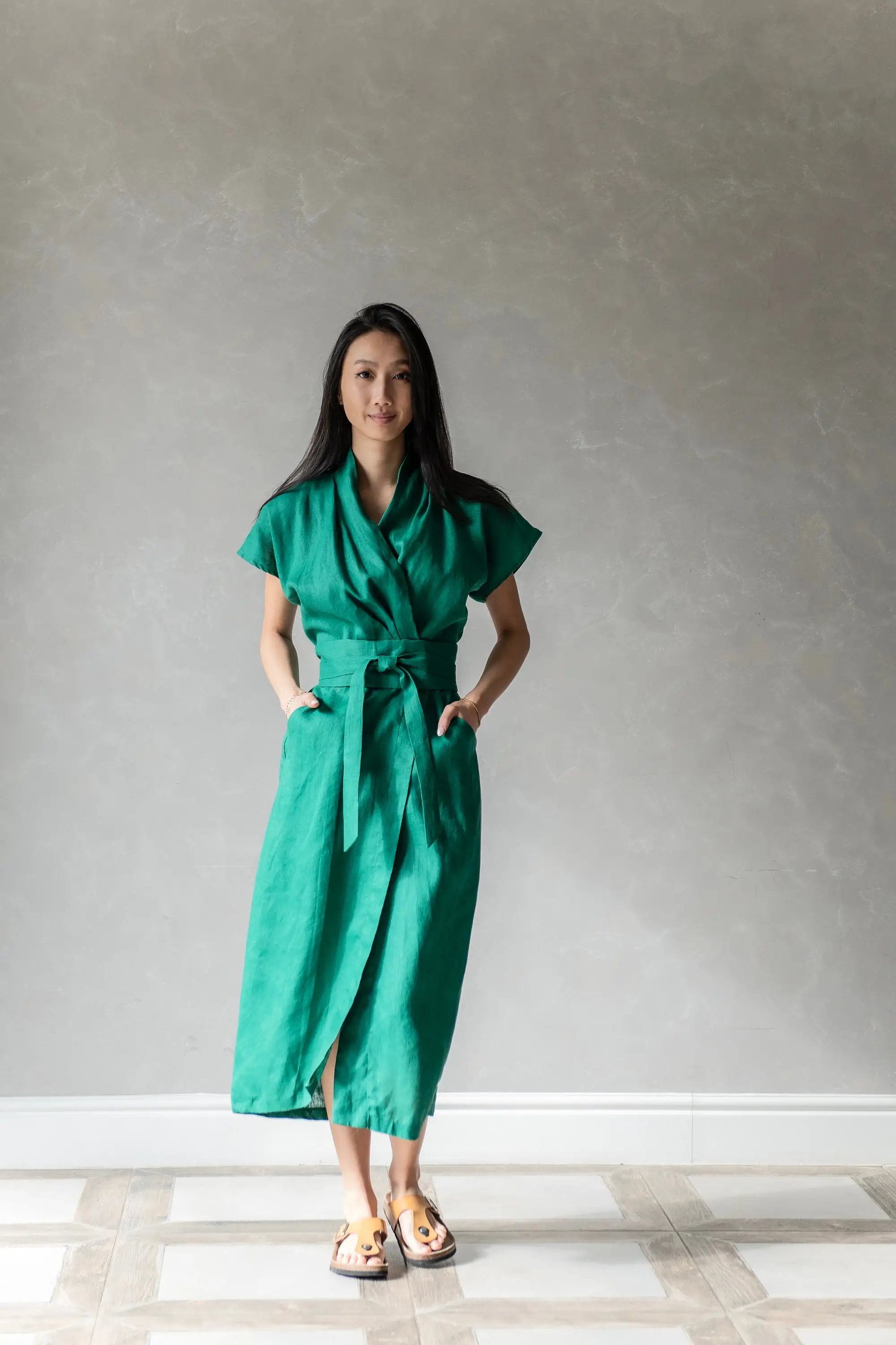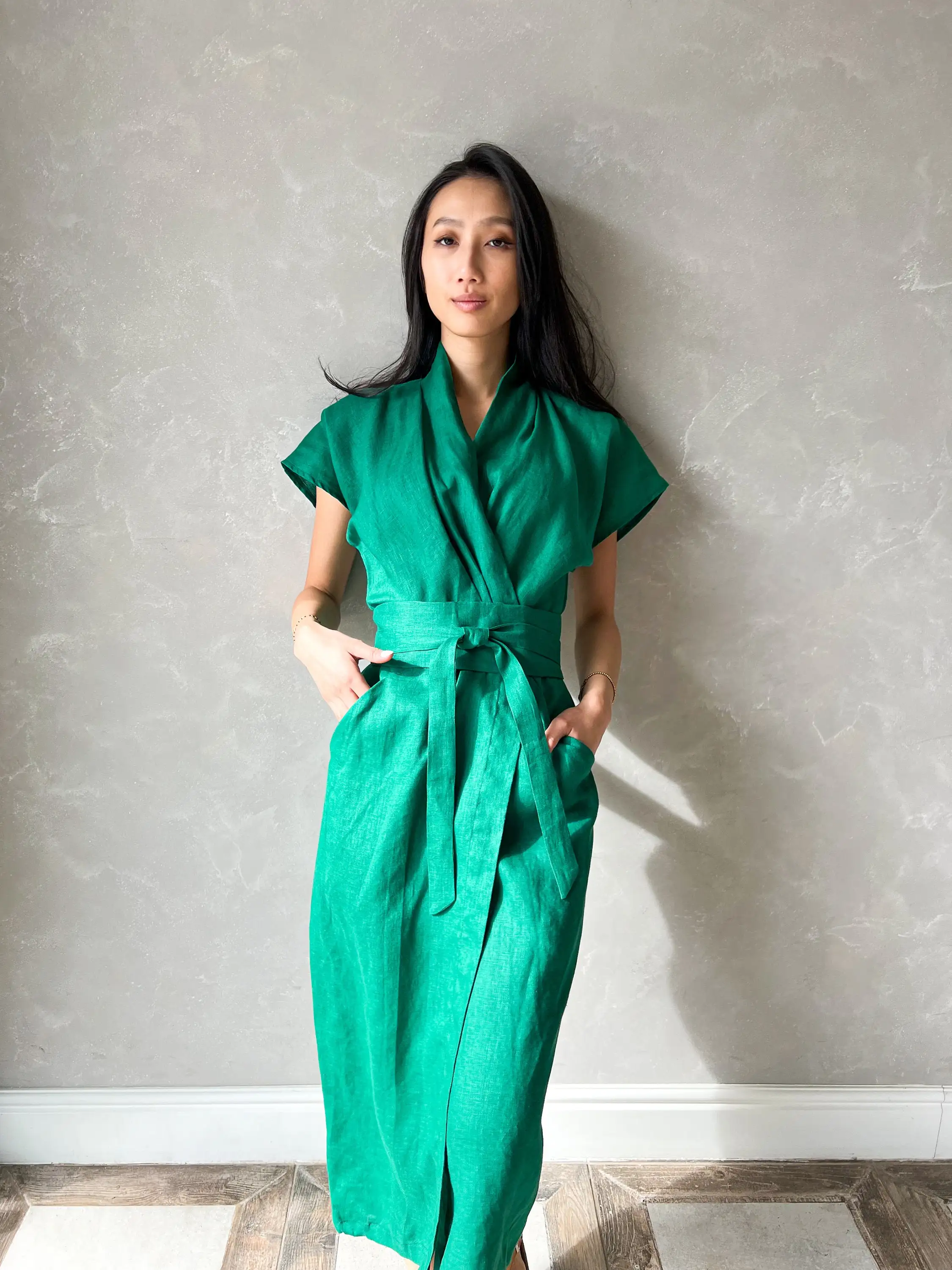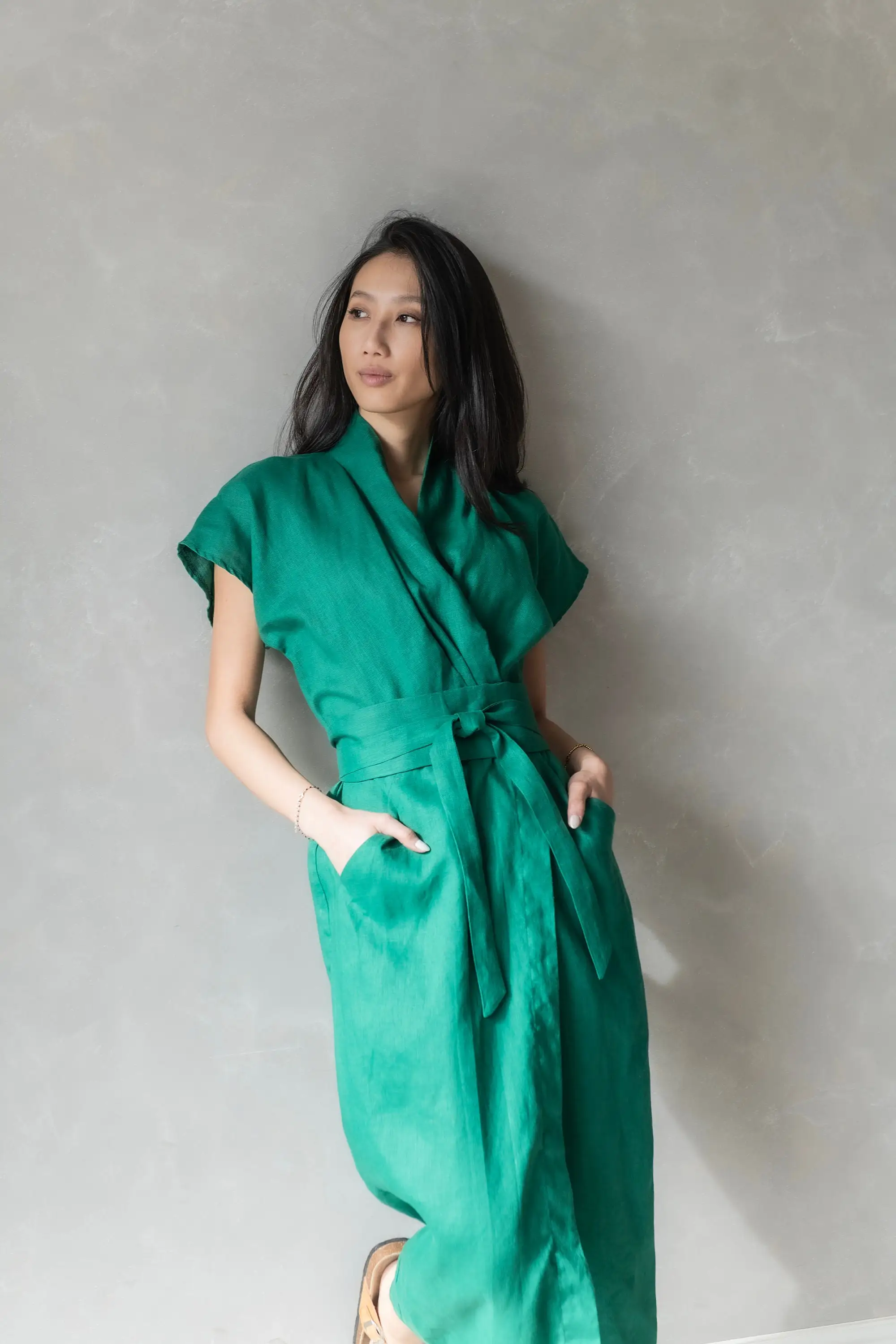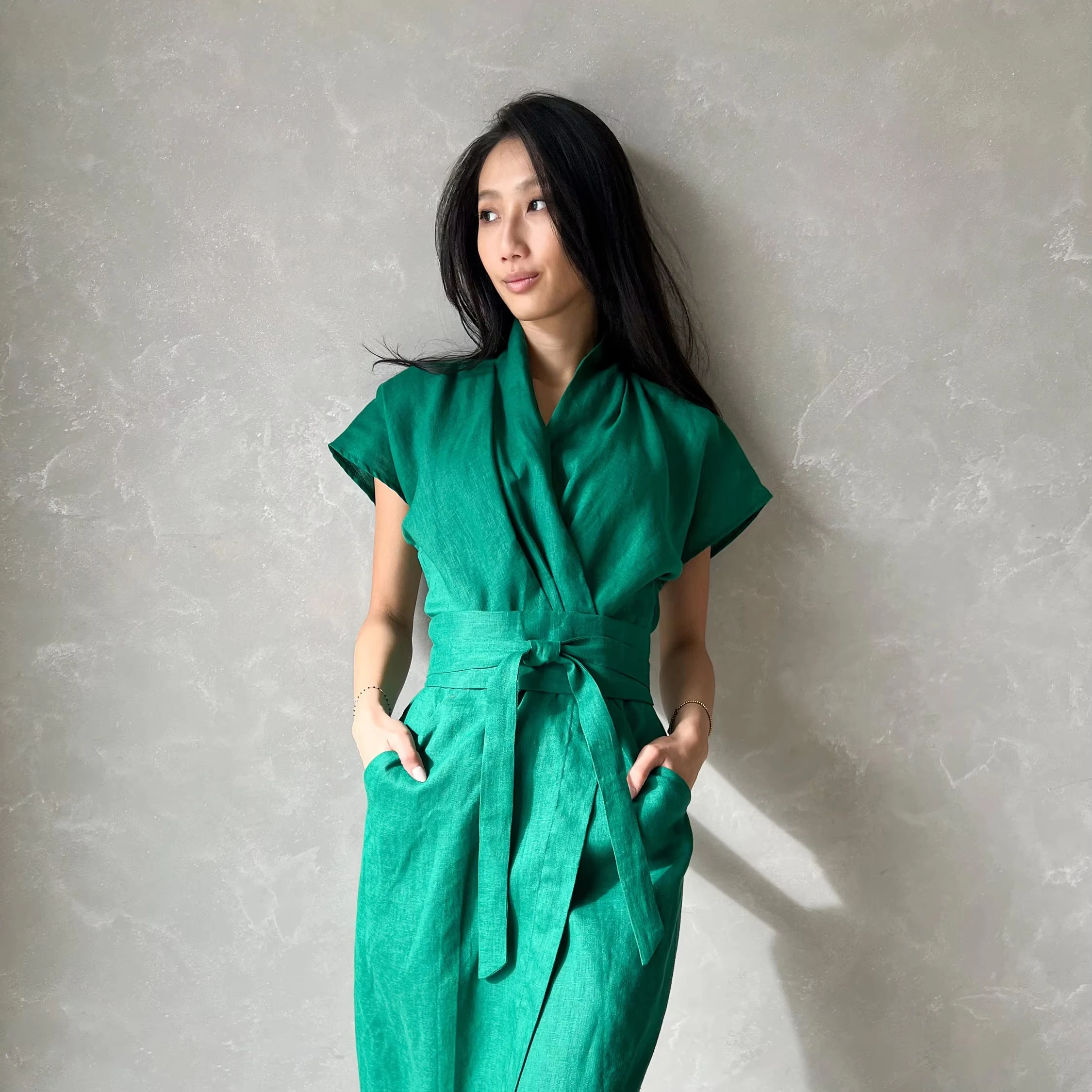 Summer Fashion Linen Wrap Dress Women Linen Kimono Dress Oversized Summer Wrap Boho Long Kimono Linen Green Sun Dress
