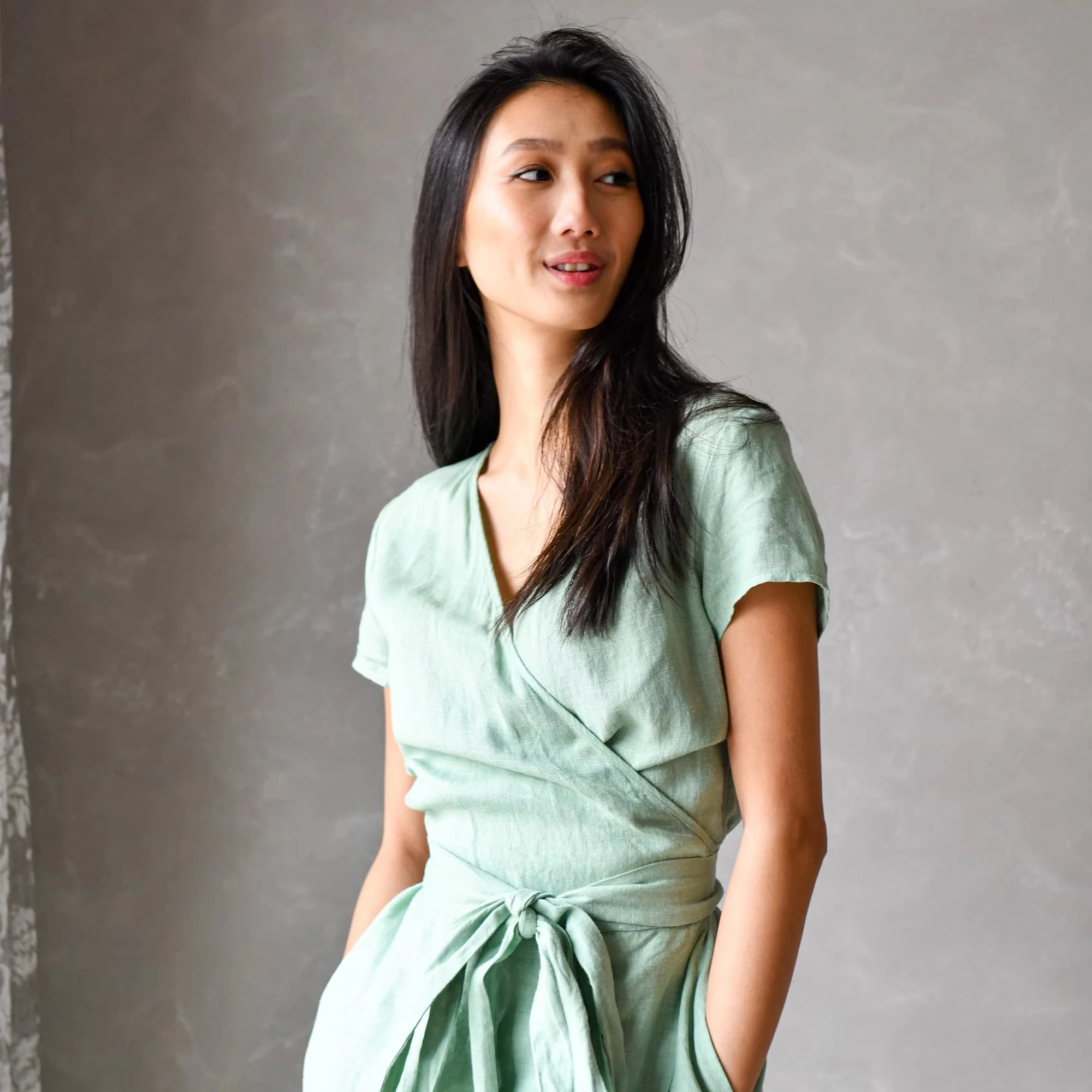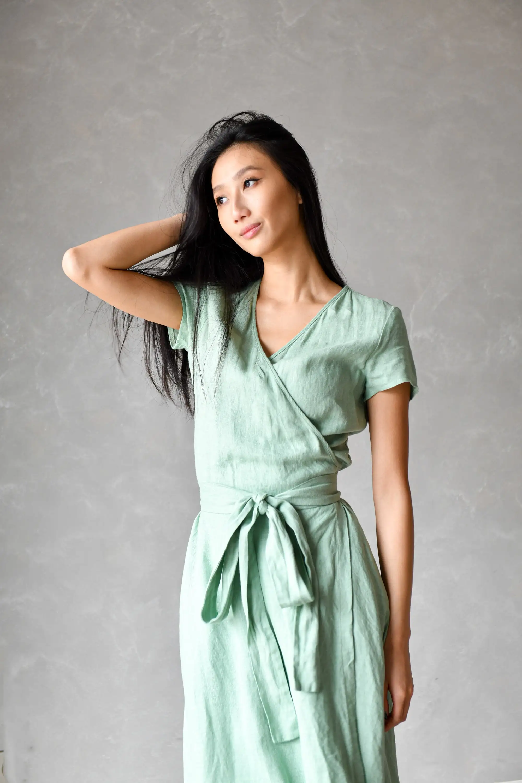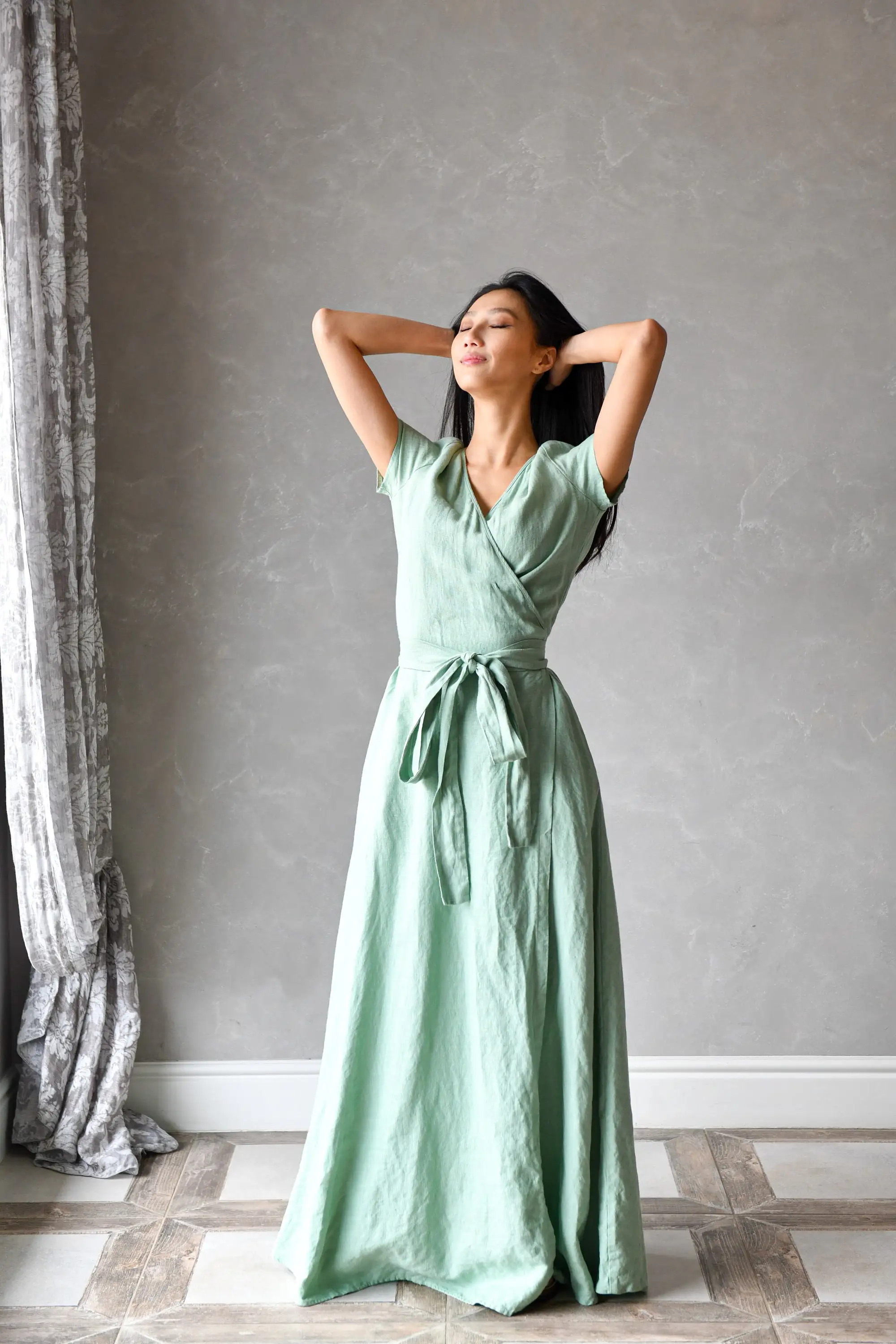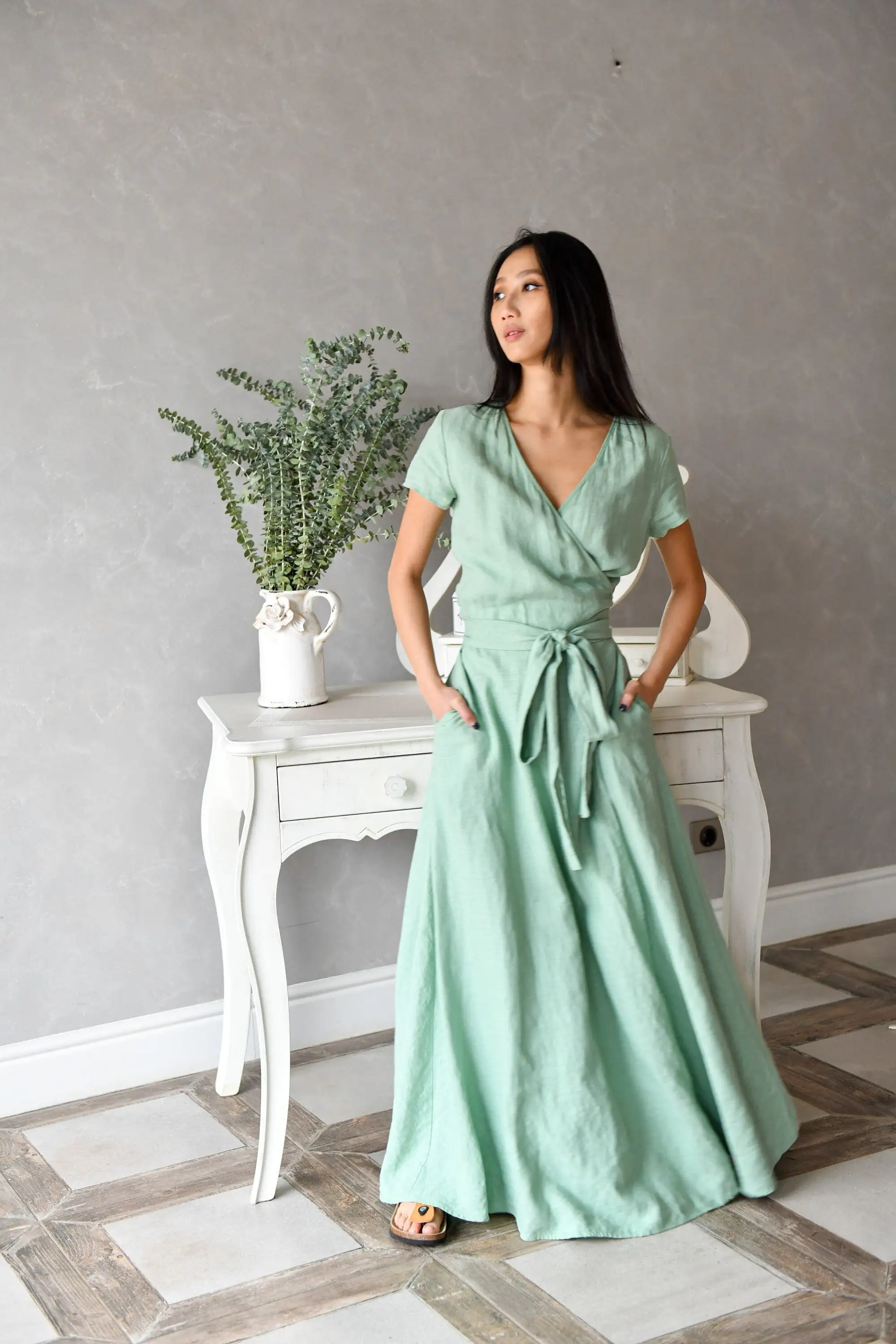 Linen Wrap Kaftan Dress Plus Size Maxi Dress Maxi Wrap Around Linen Long Wedding Dress With Short Sleeves Sustainable Clothes