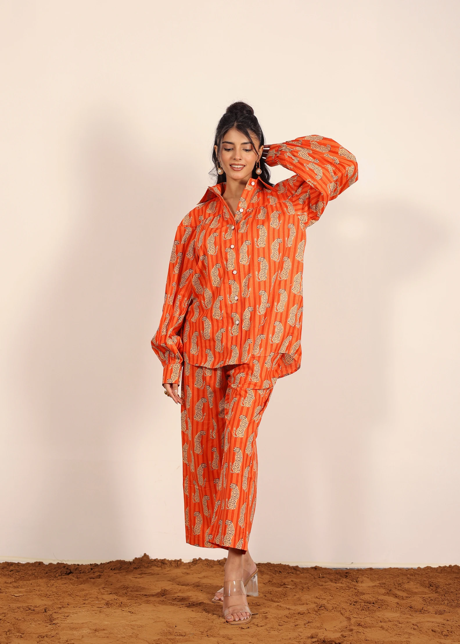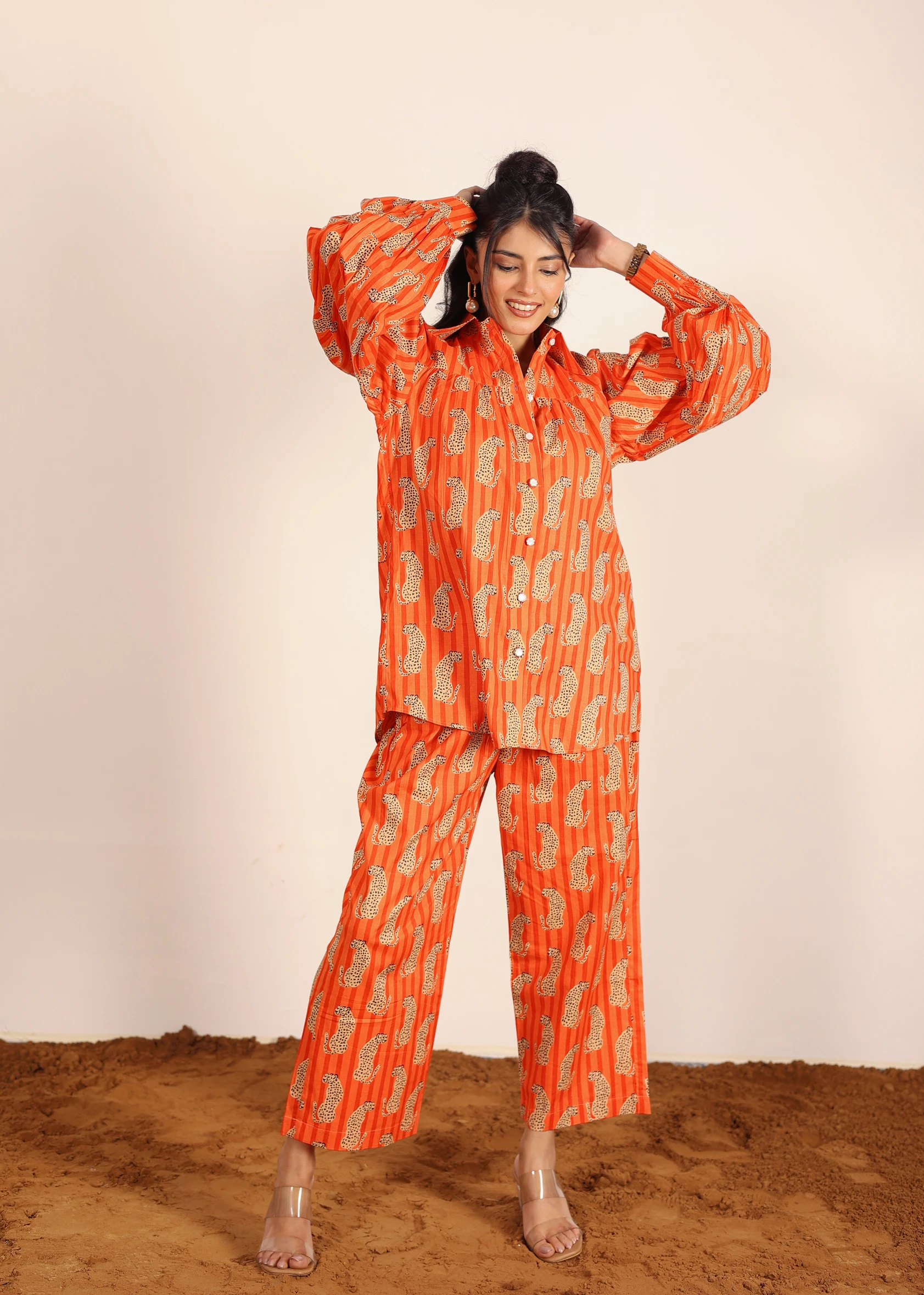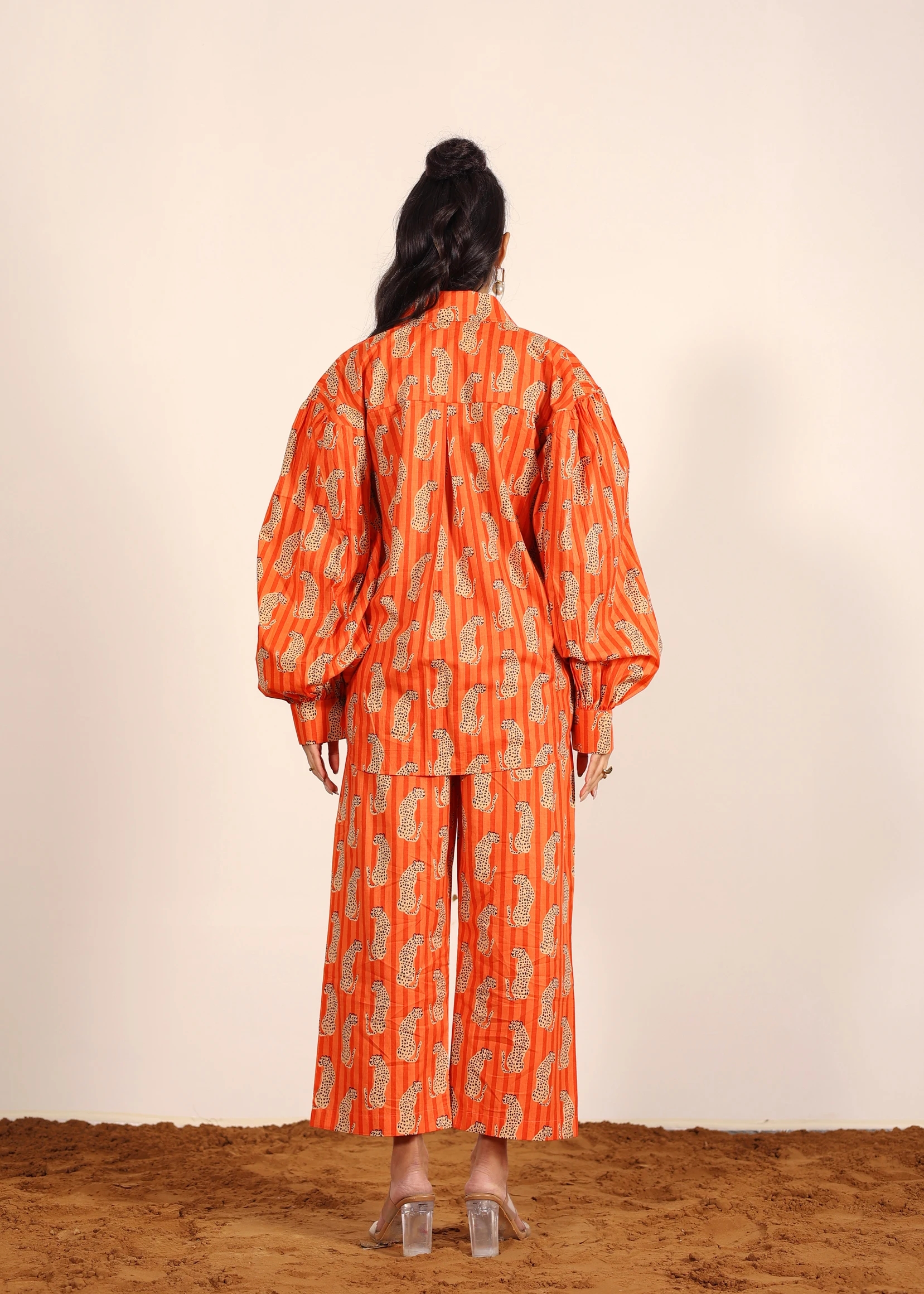 Orange And Multi Leopard Print Oversized Long Shirt And Wide Legs Pant 100% Cotton Indo Western Co-ord Set New Casual Fashion