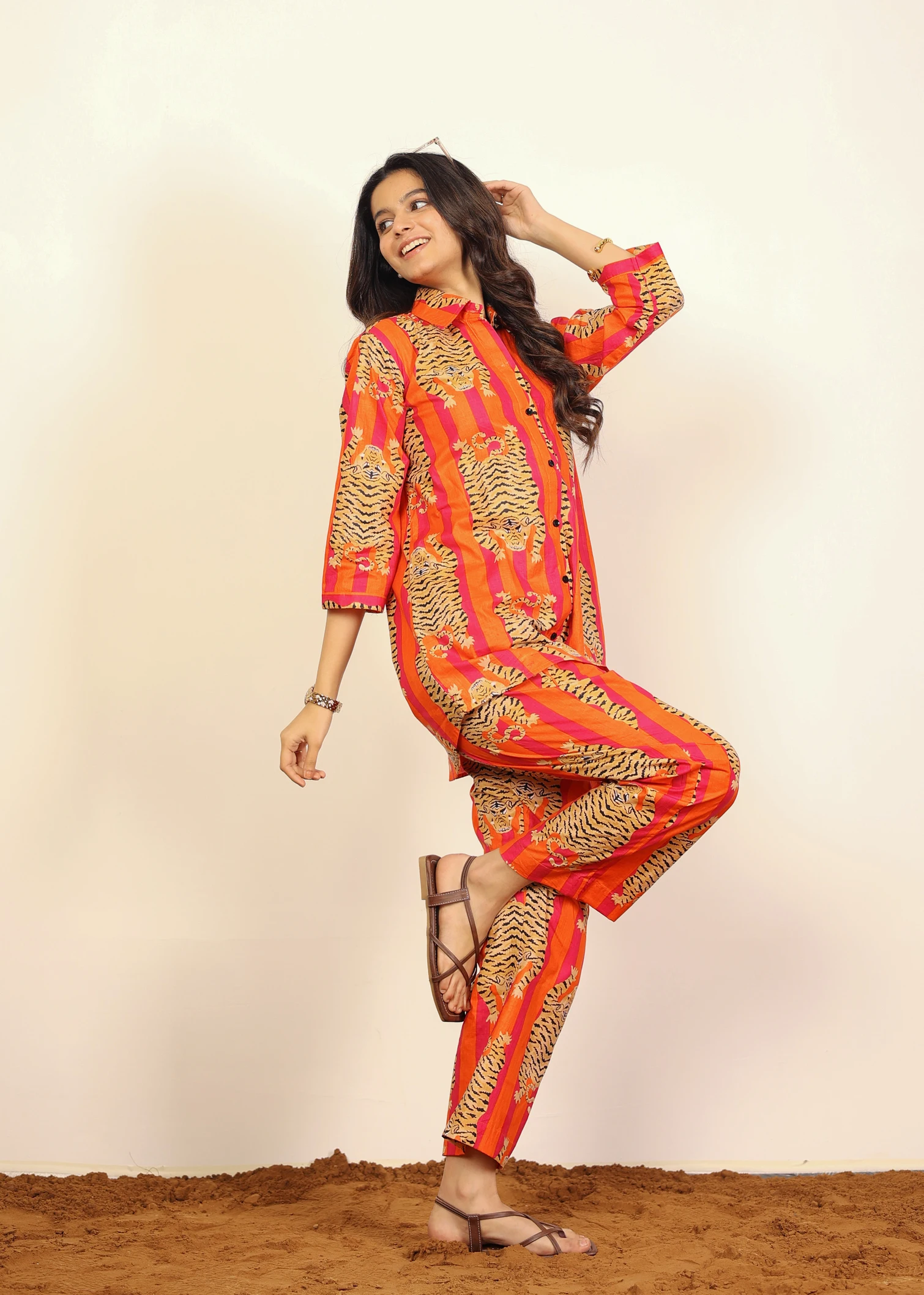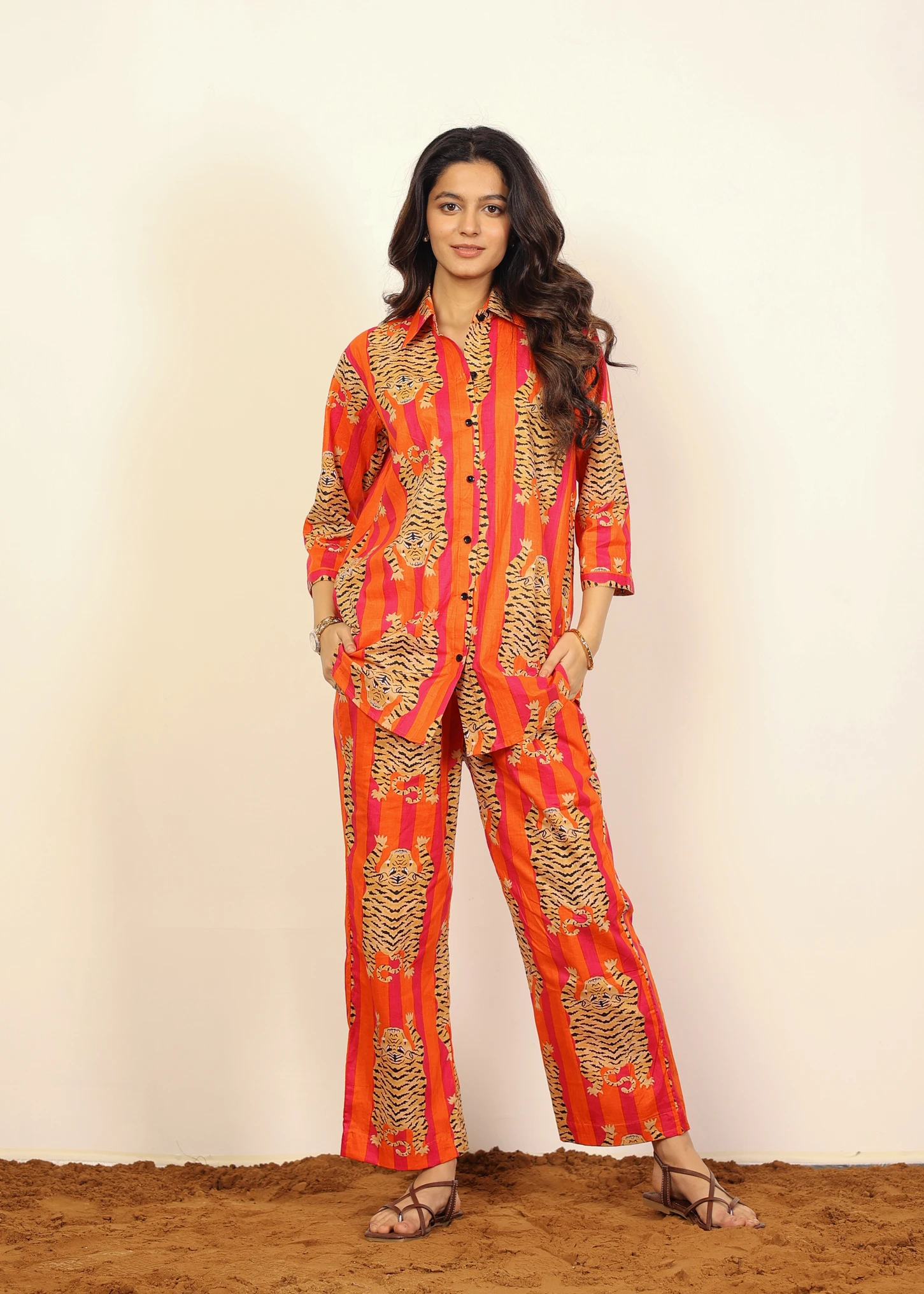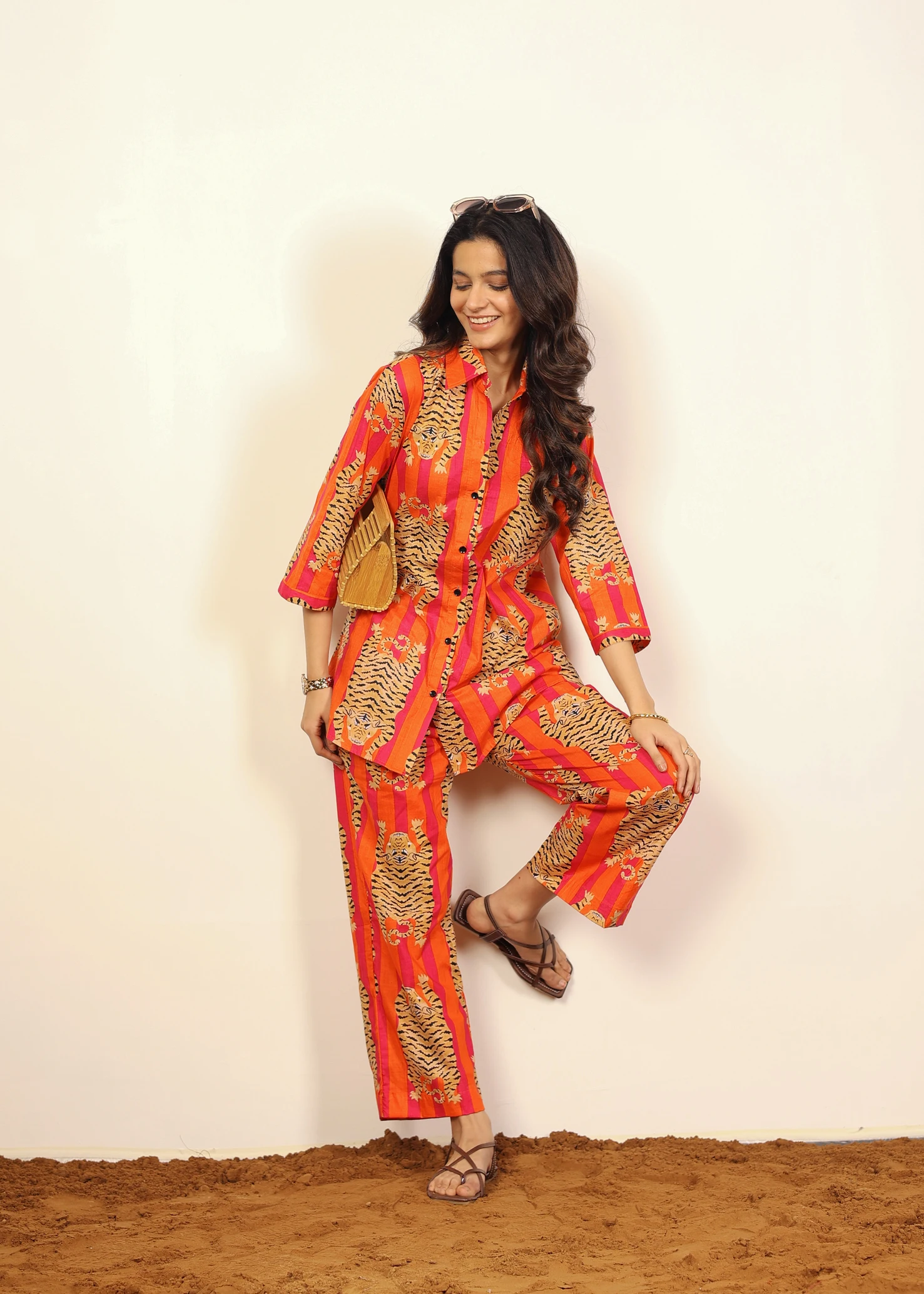 Spring And Summer Suitable Orange And Multicolor Tiger Print Oversized Shirt And Wide Legs Pant 100% Cotton Co-ord Sets OEM