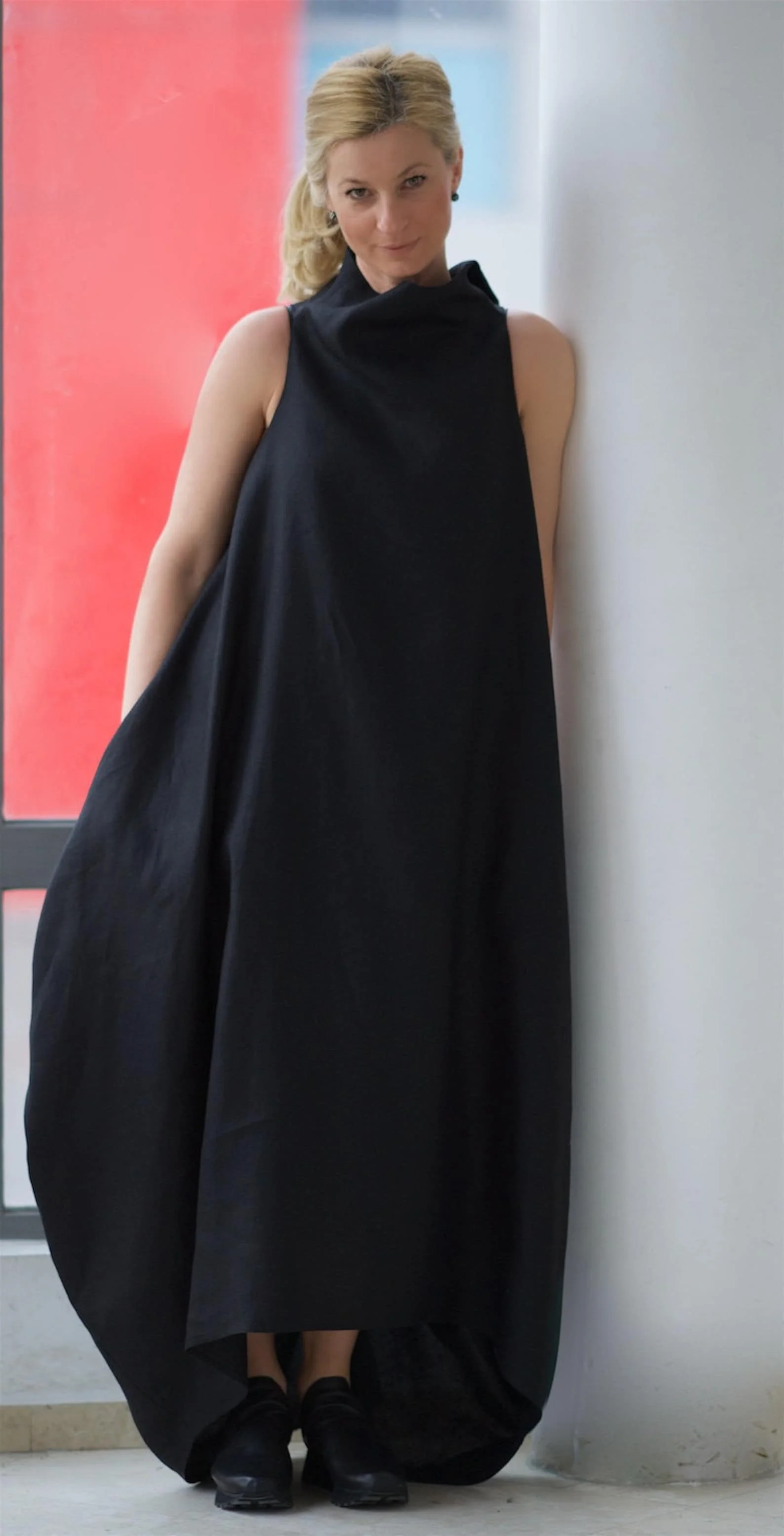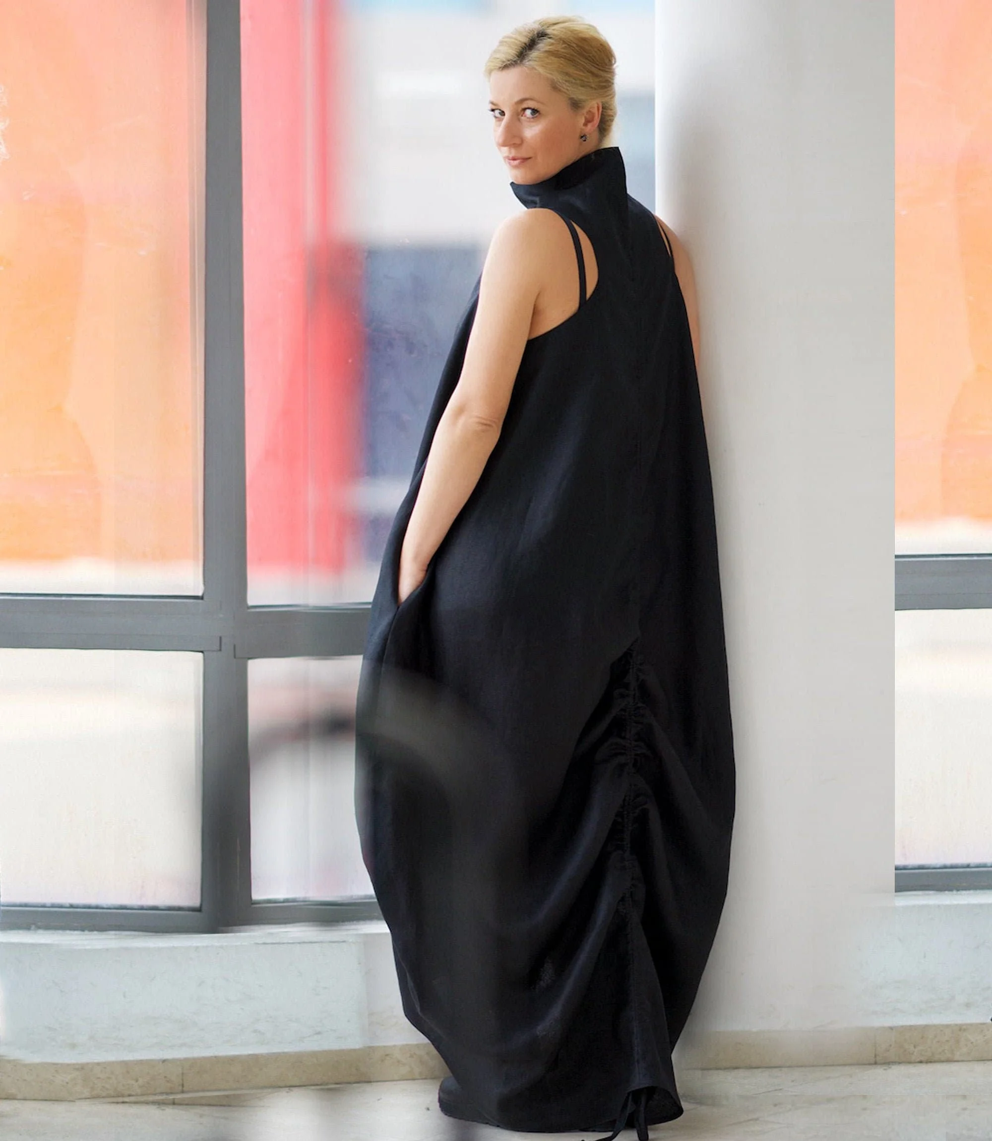 Latest Design Black Linen Kaftan Style Maxi Dress for Women Woven Patterns Plus Size Summer Dress Natural Waistline Plain Dyed