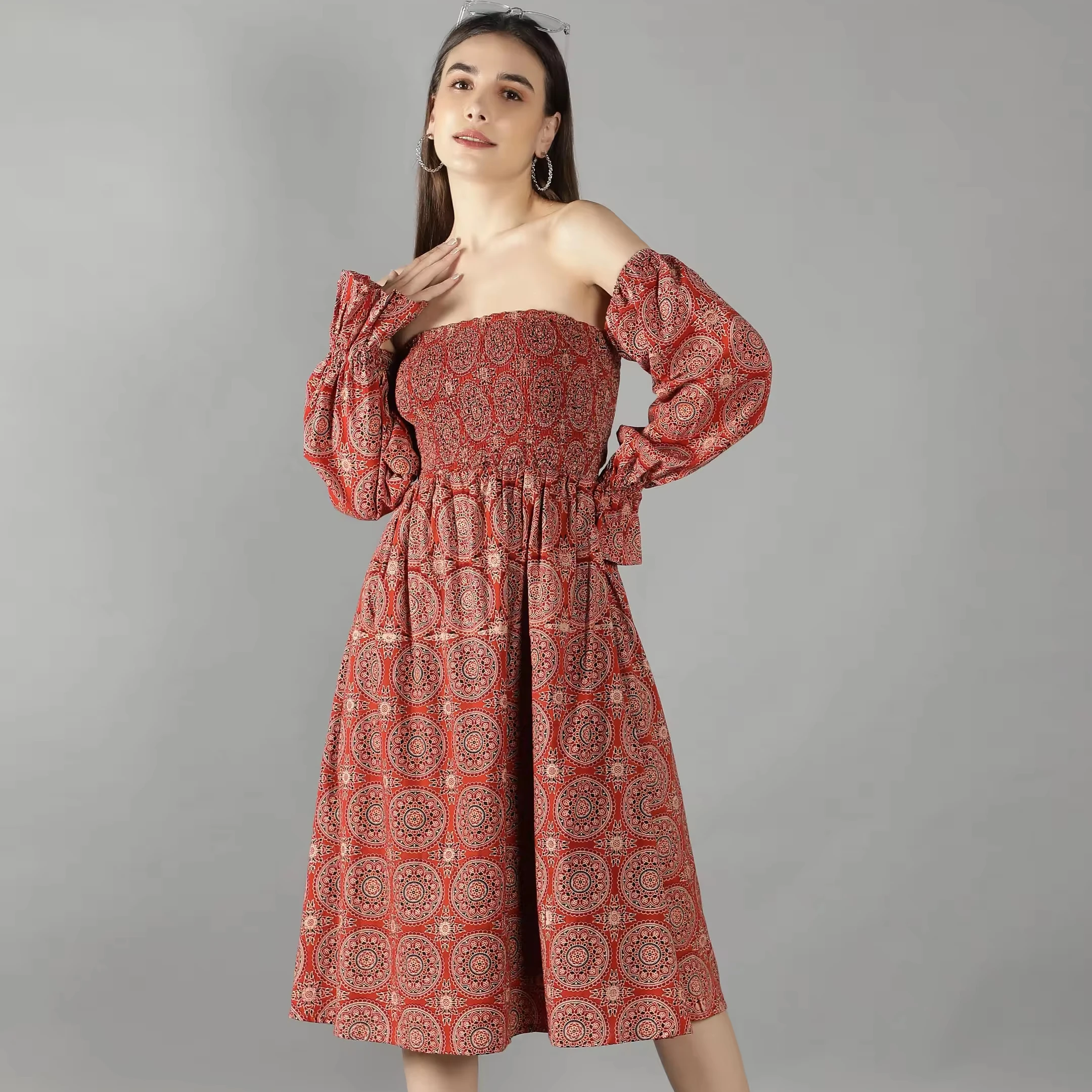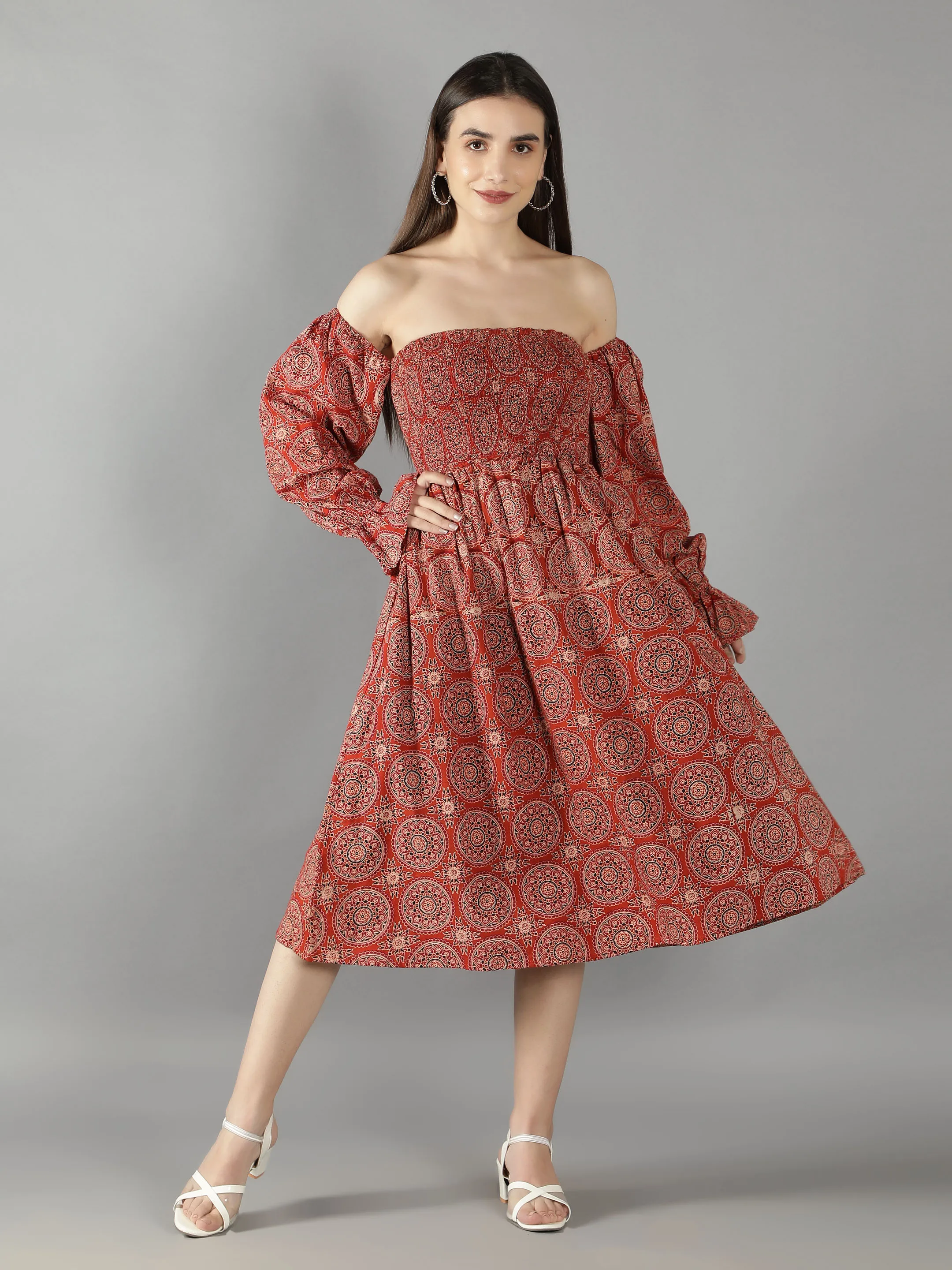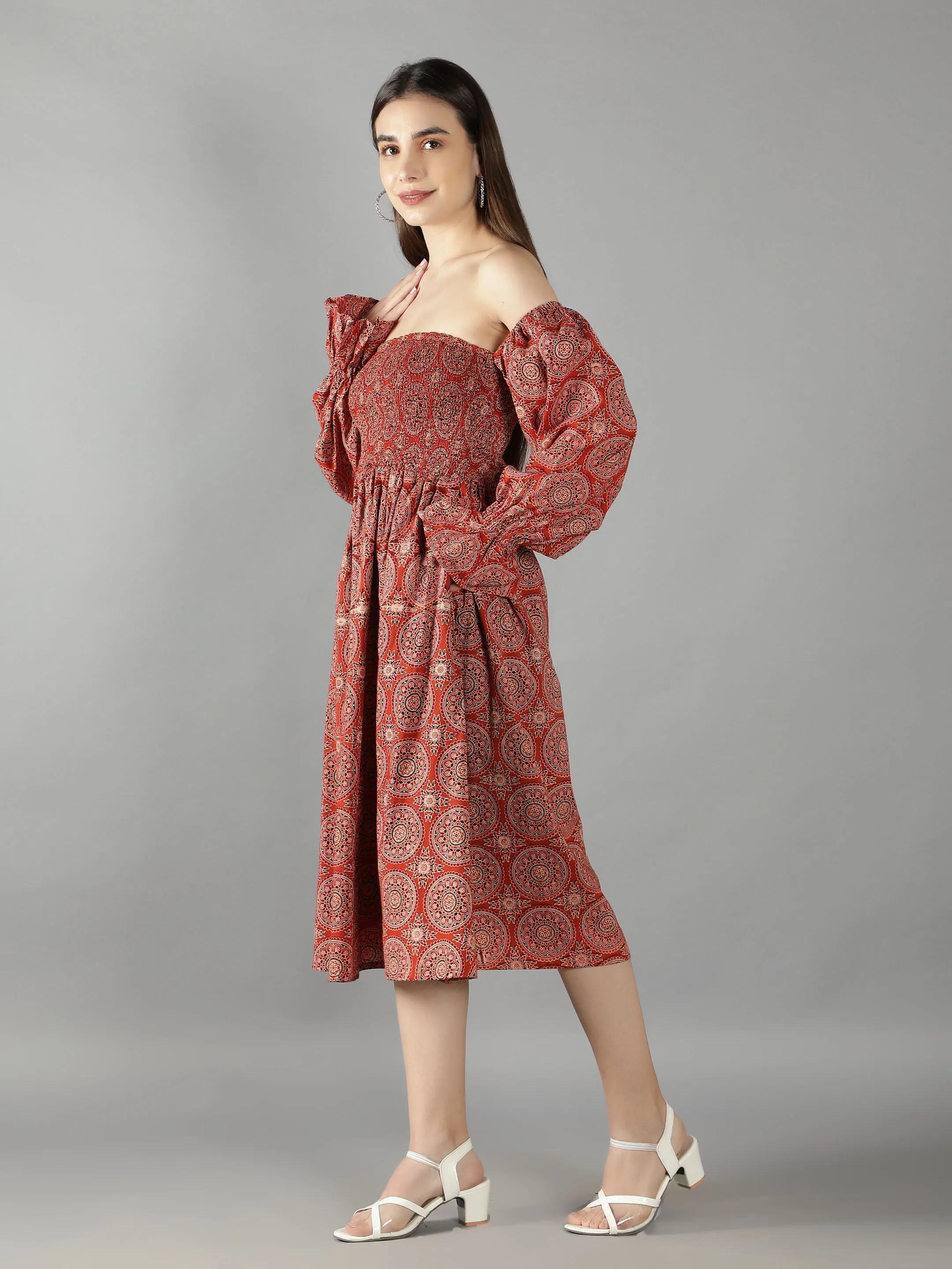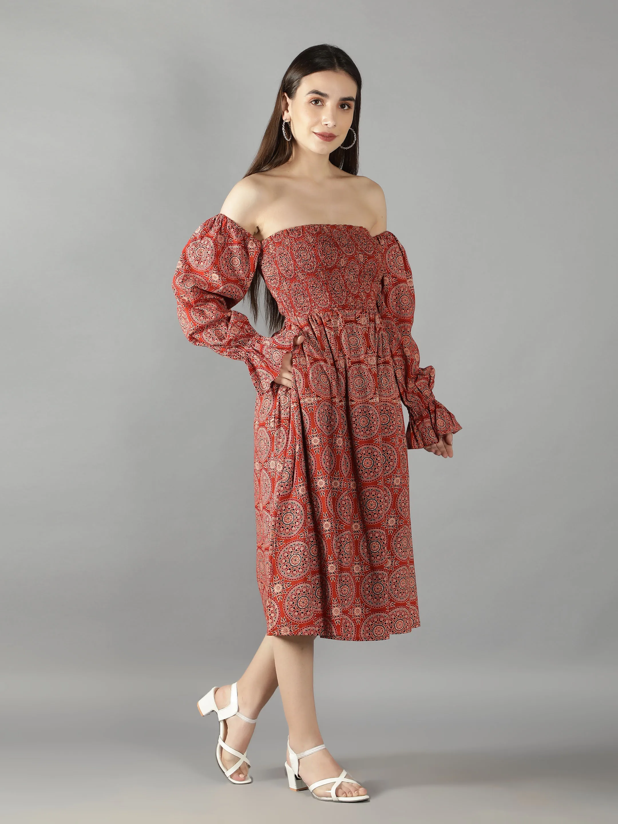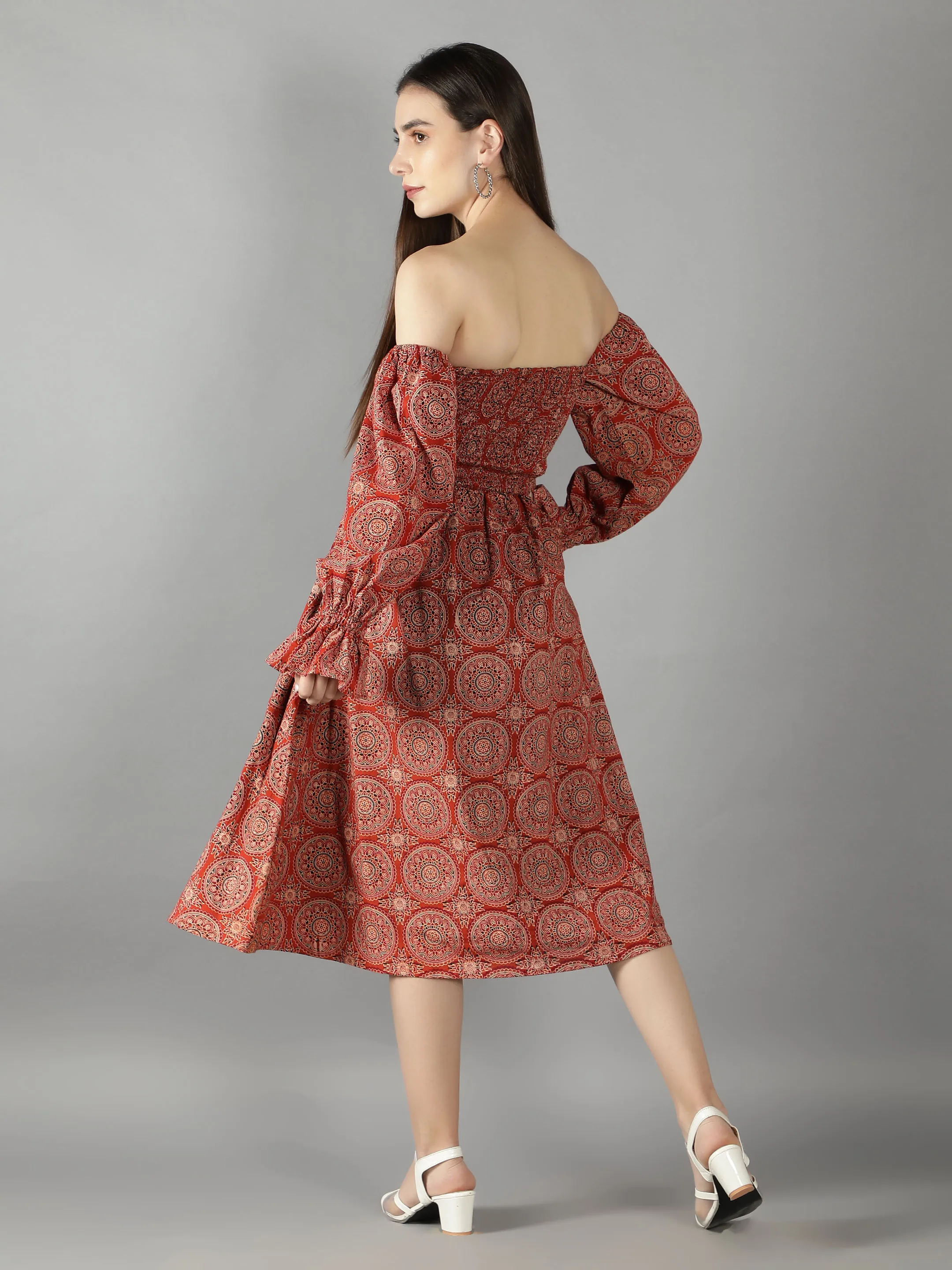 Women Casual Burnt Orange Ajrak Print Off- Shoulder Smoke Dress With Circular Founce Sleeve Fitted One Piece Stylish Summer Wear