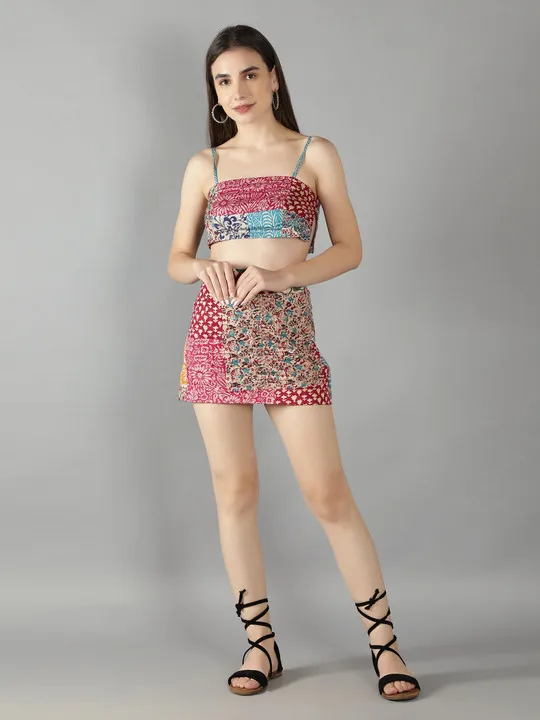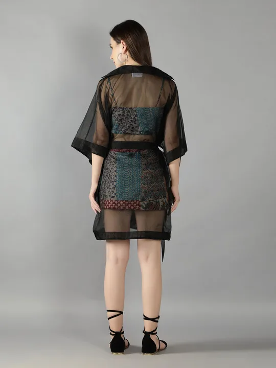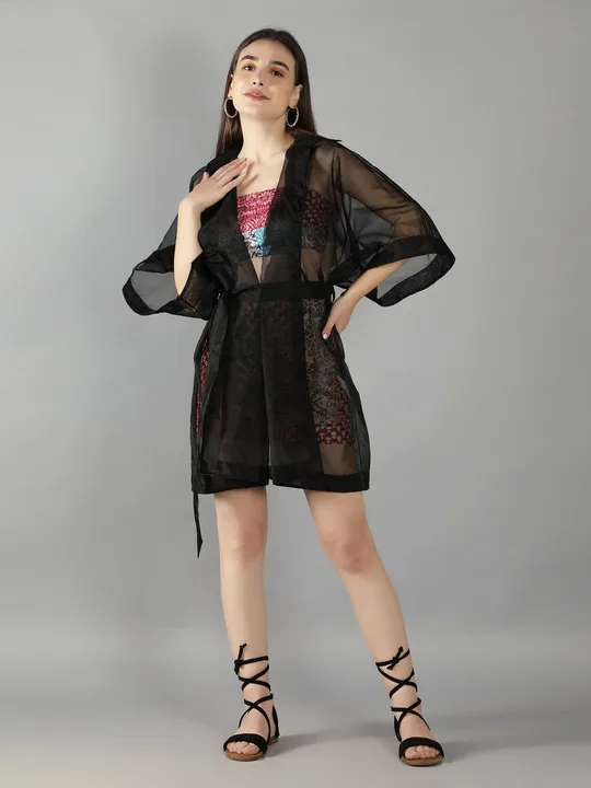 Black Organza Kimono Jacket With Mix Patch Print Skirt and Top Set Co Ord Set Summer Spring T Shirt Girl at Wholesale Price