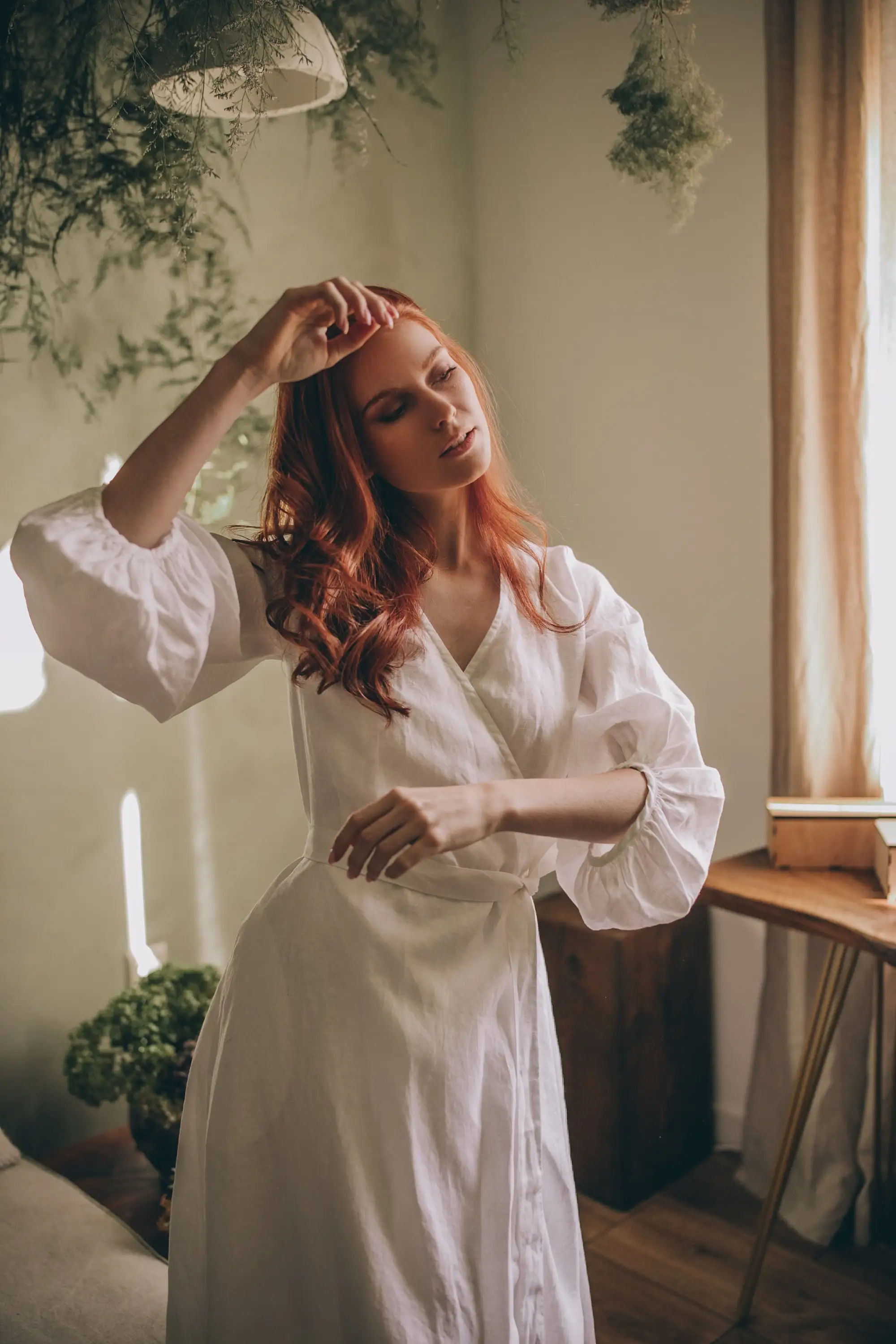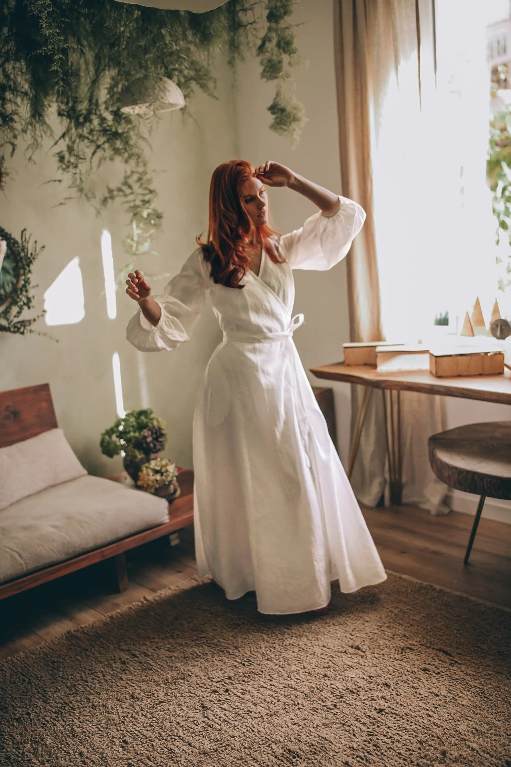 White Linen Maxi Dress with Bishop Sleeve High Collar Wrap Style Casual Plus Size Wedding/Birthday Renaissance Maxi Dress