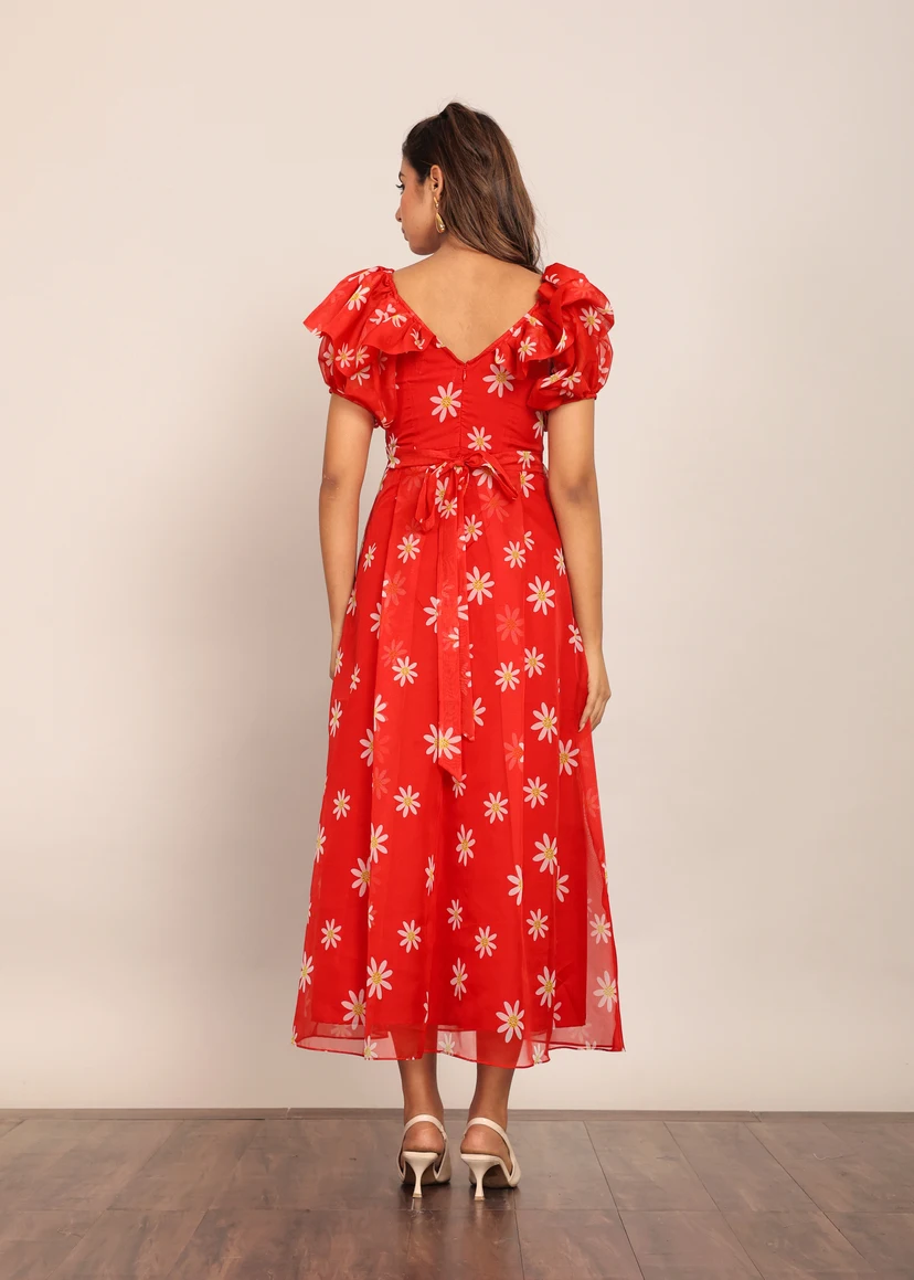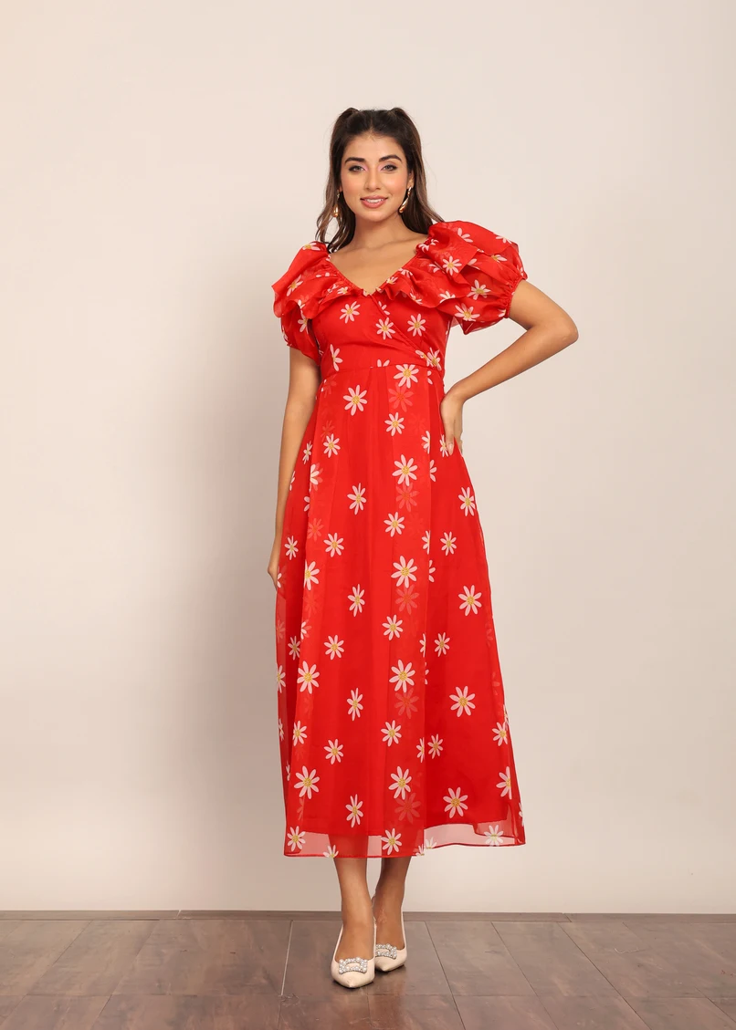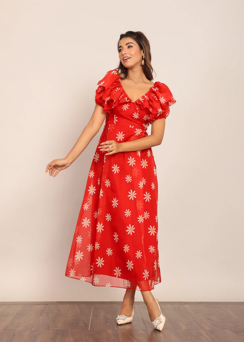 2024 Custom Women Red & White Floral Summer Midi Dress Best Quality High Finishing Product Women and Girl One Piece Midi Dress