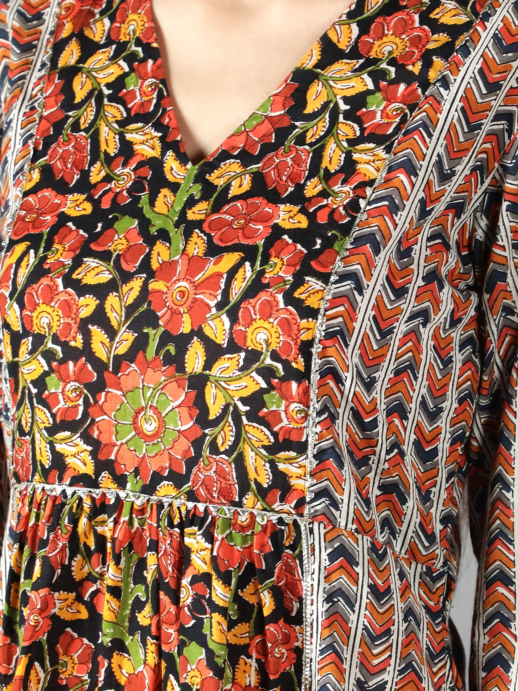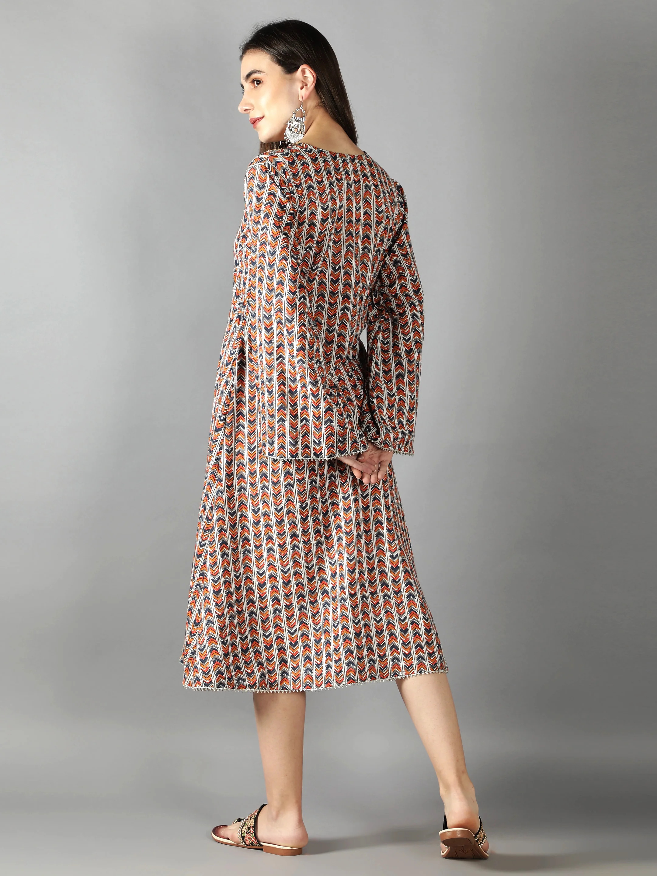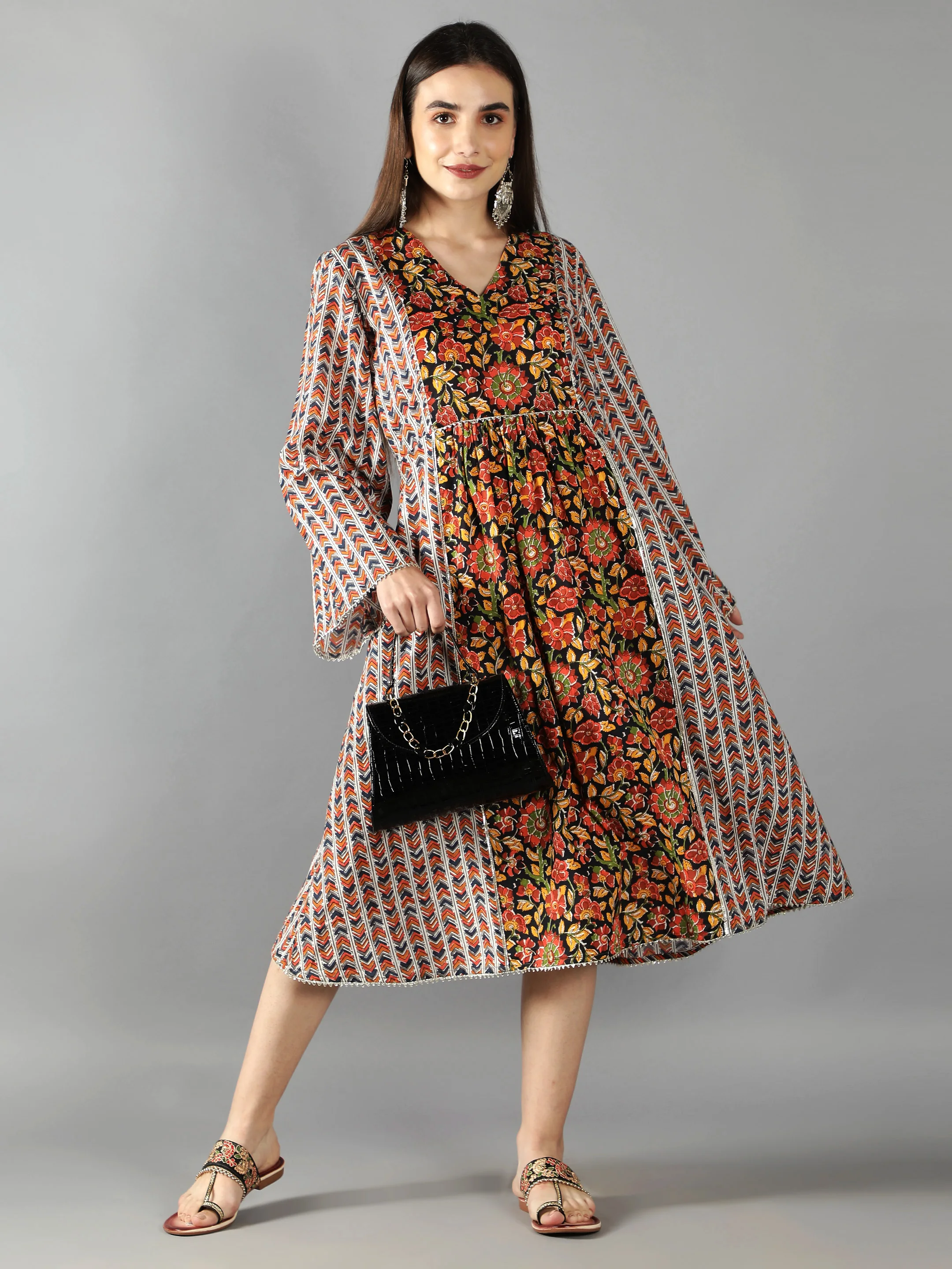 White Geometric Bell Sleeves Woven Floral Button Front Panel Gota Midi Dress with 100% Cotton Women's Sexy Summer Dress